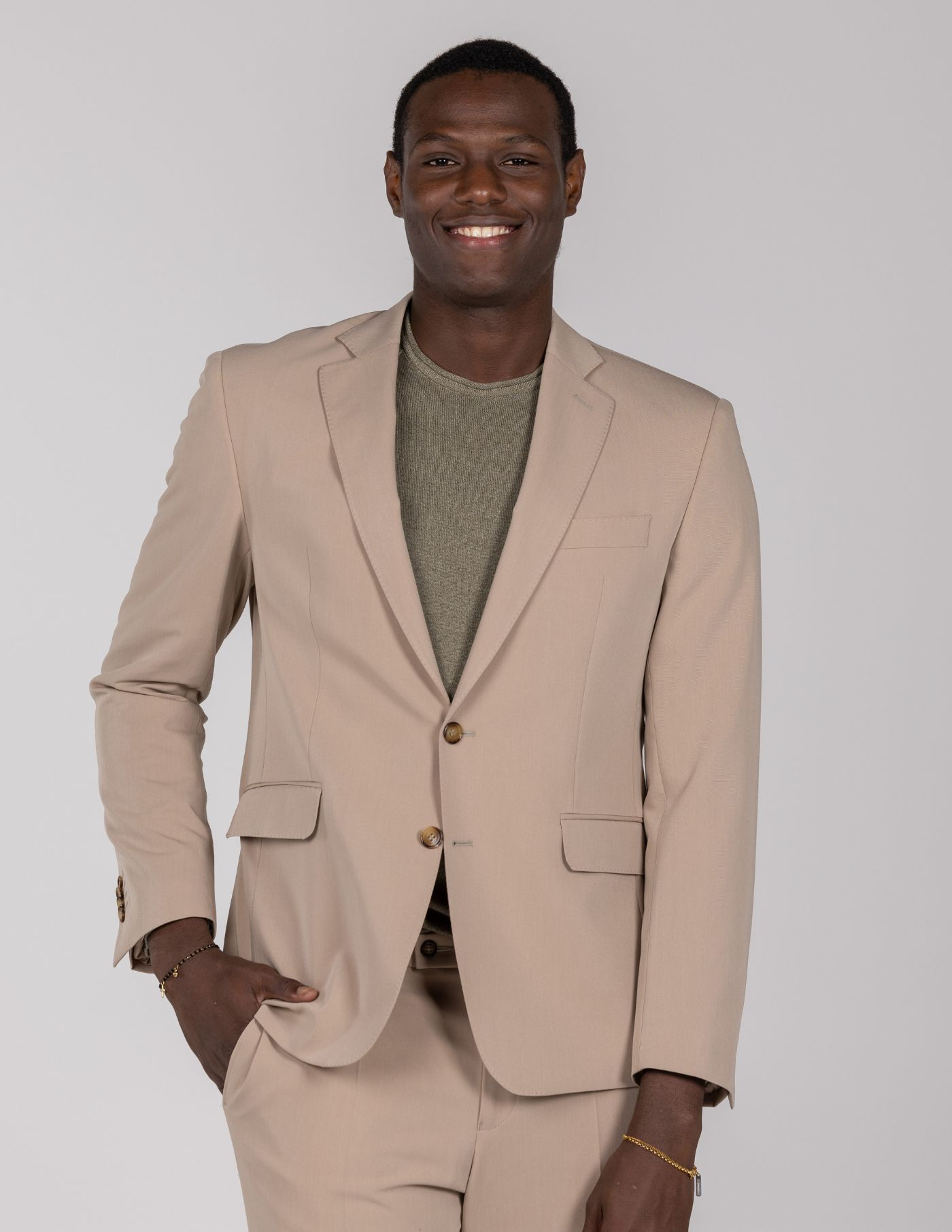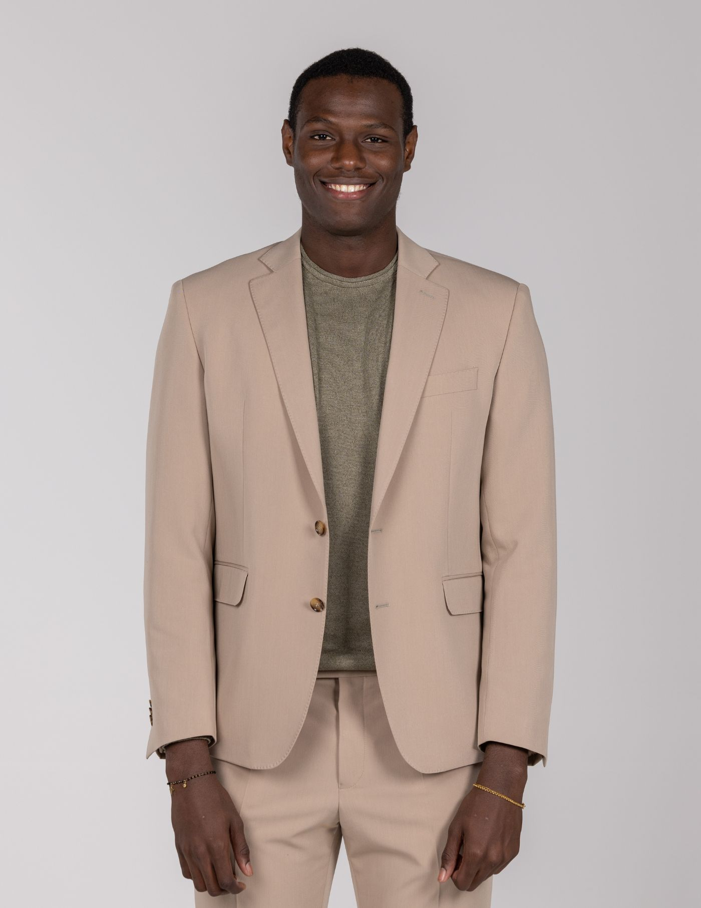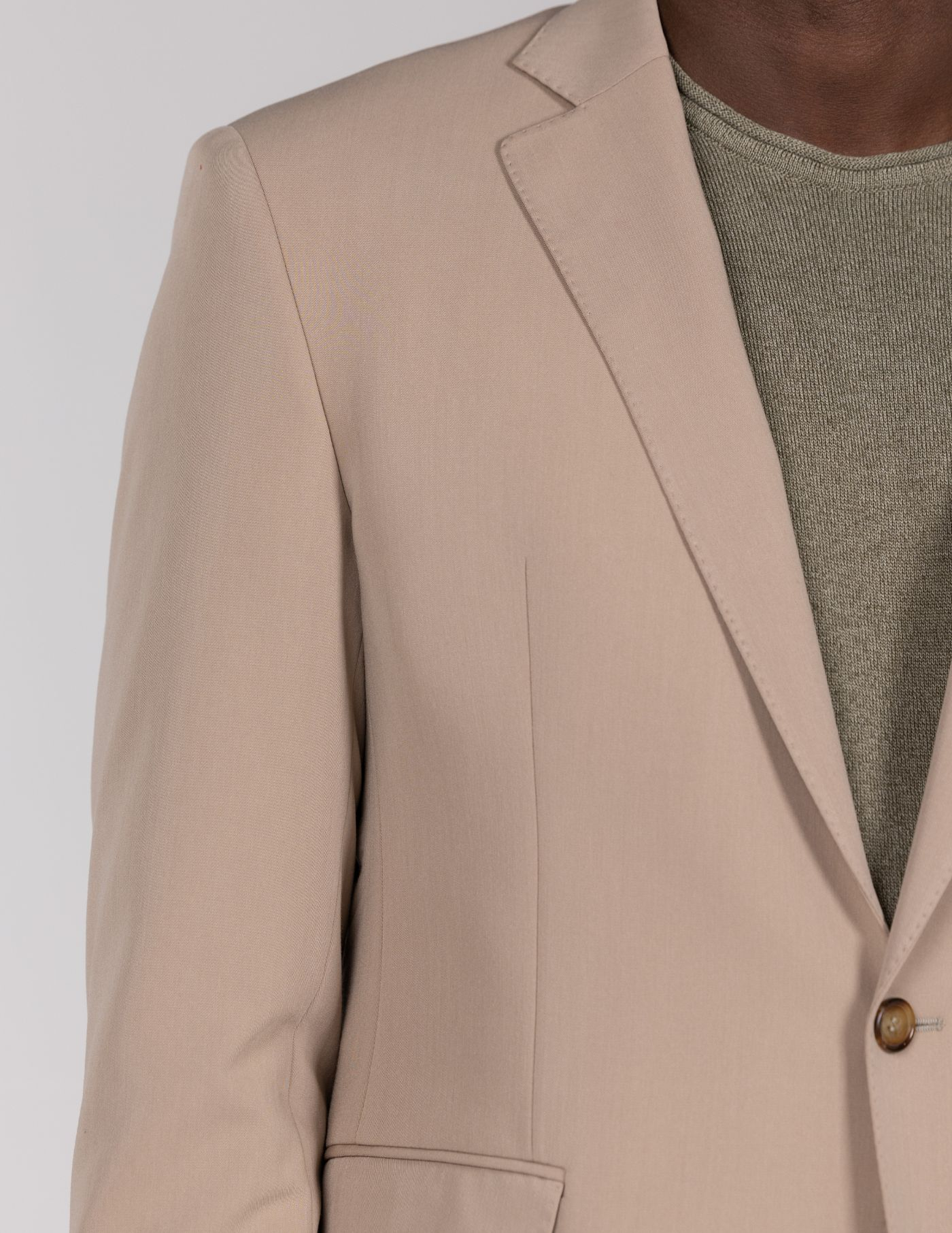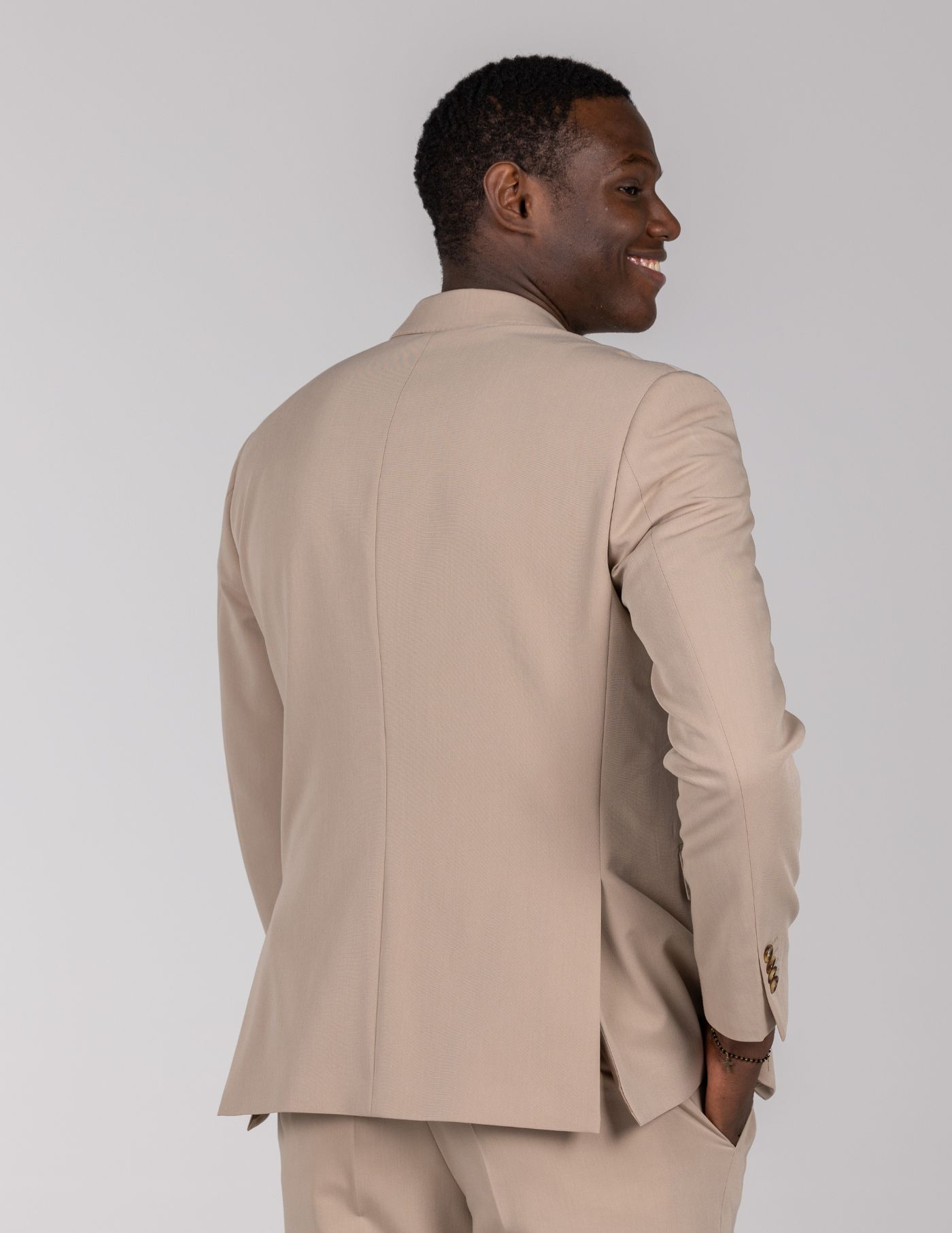 Blazer slim fit bege de dois botões, com detalhe de costura picotada (pick stitch), e design elegante e moderno.