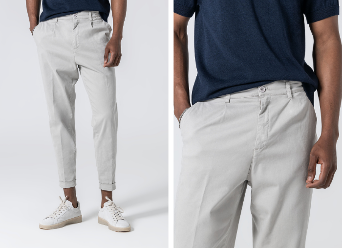 As calças são cropped fit, tendo um gancho mais curto e perna tapered fit (mais largas na cinta e coxa, afunilando no joelho e tornozelo).
