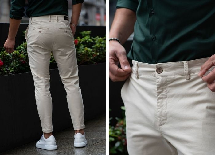 As calças são slim fit sem serem demasiado justas. O nosso modelo tem 1,85m de altura, pesa 80 kg e veste o tamanho 42.