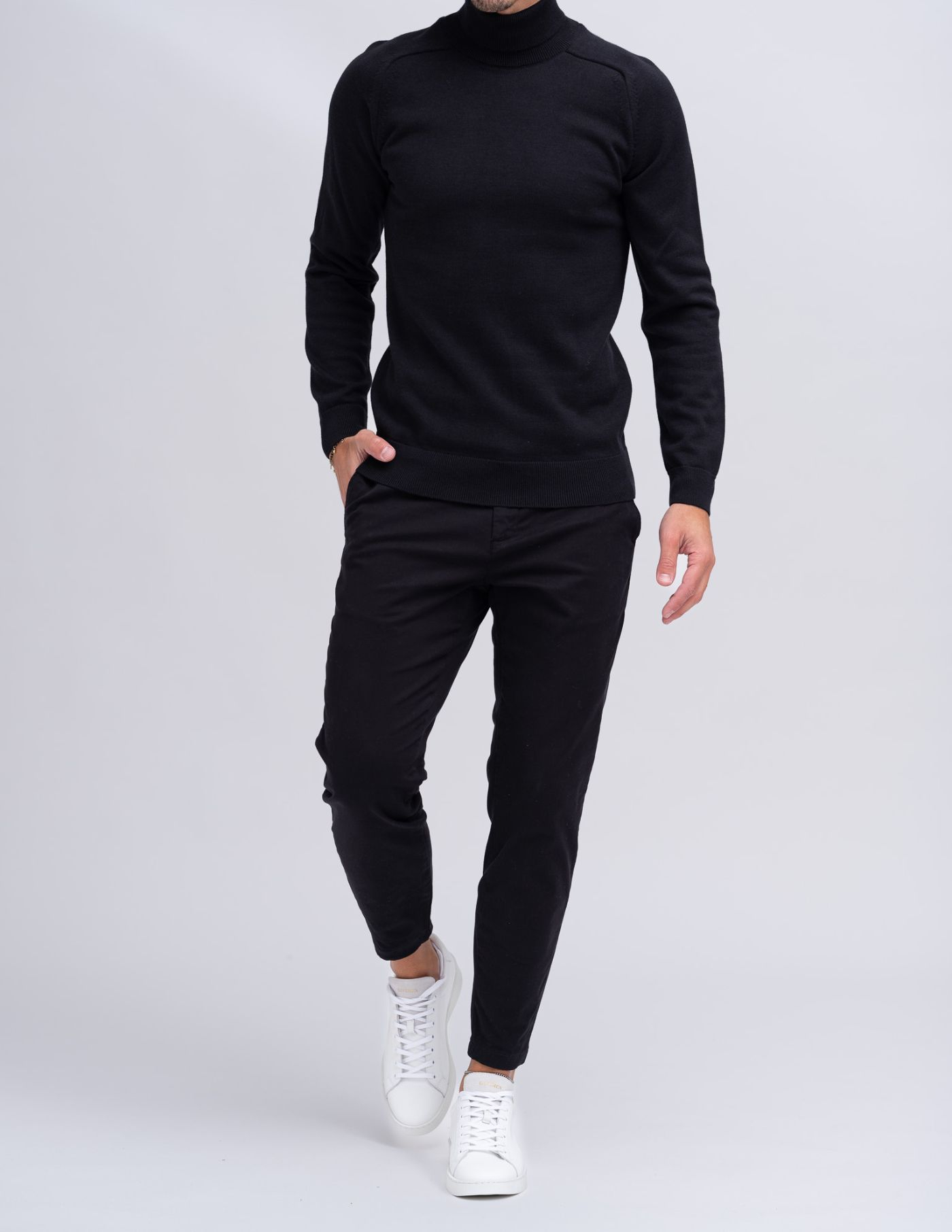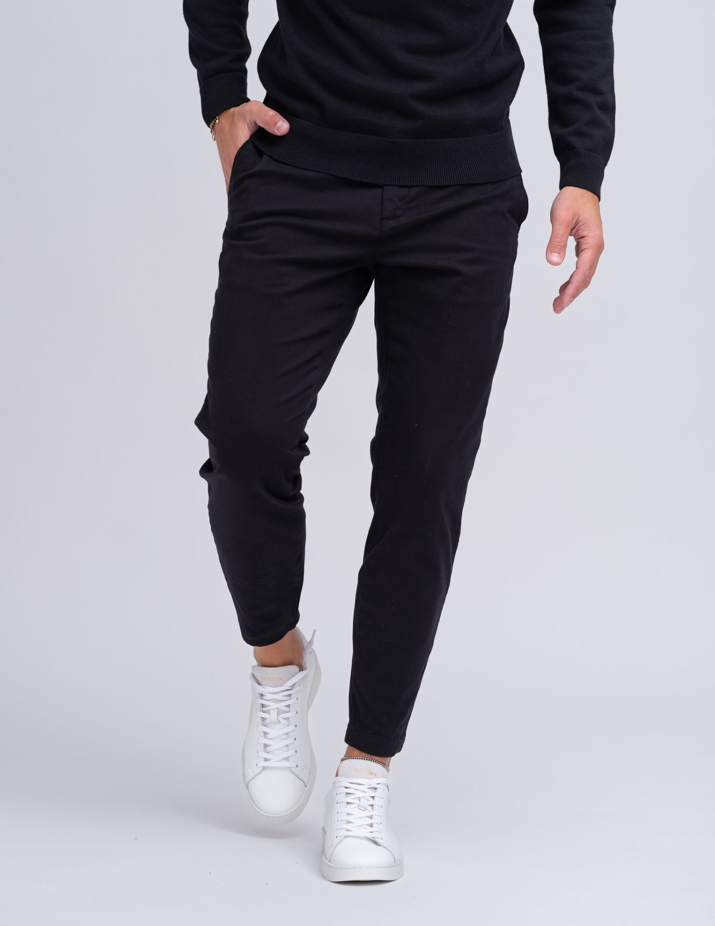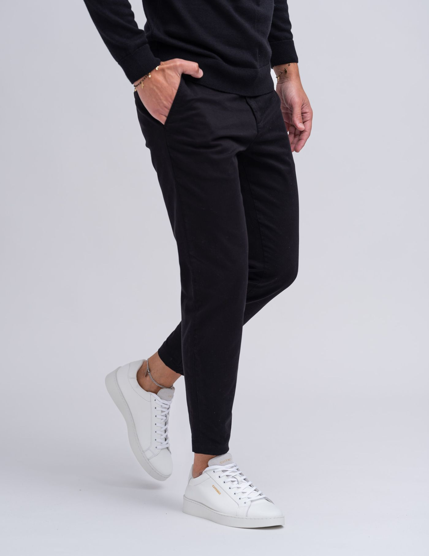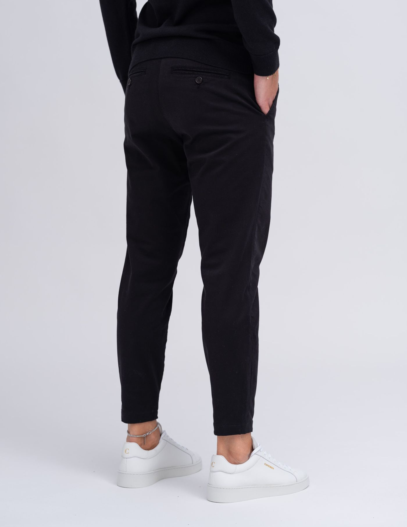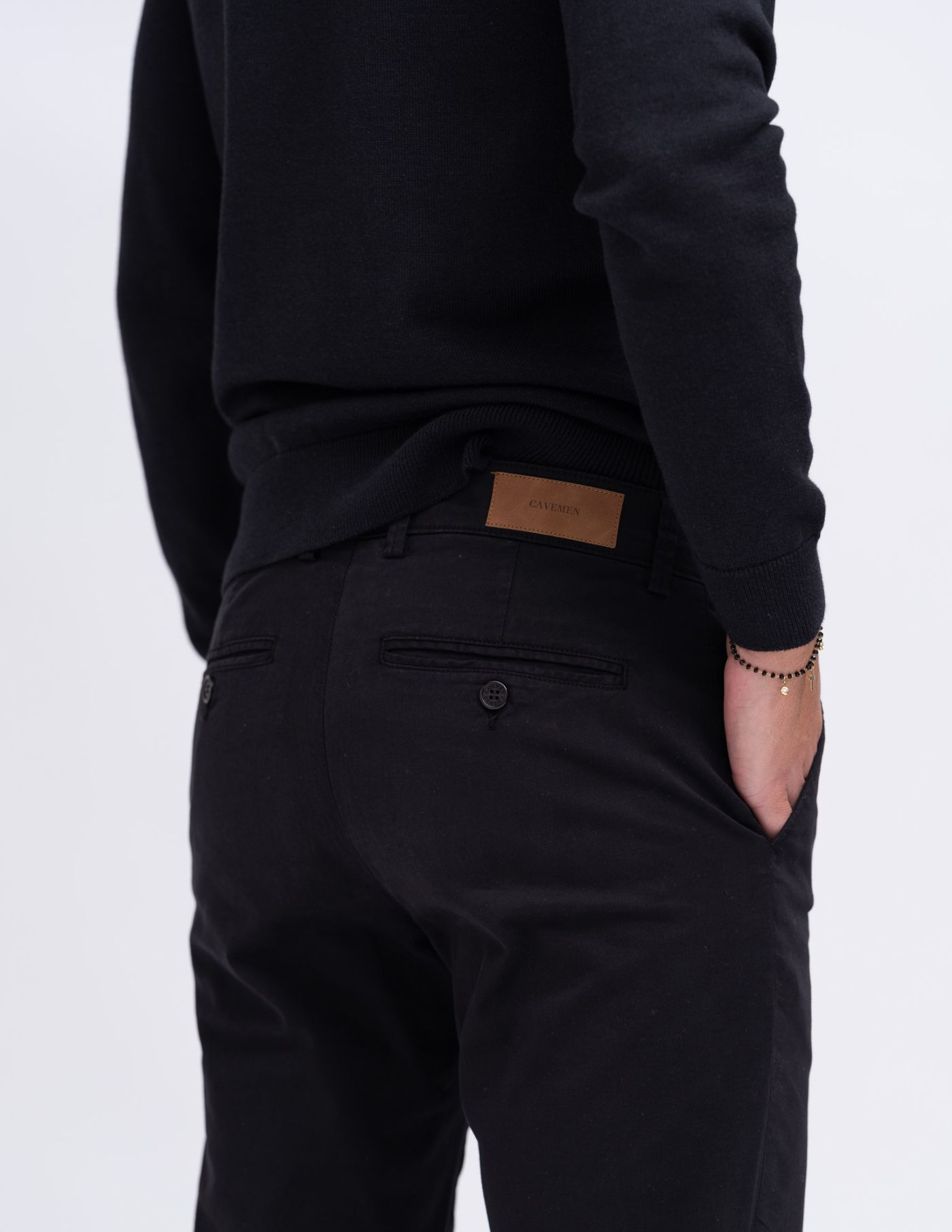 <p>As calças são slim fit sem serem demasiado justas. O nosso modelo tem 1,85m de altura, pesa 80 kg e veste o tamanho 42.