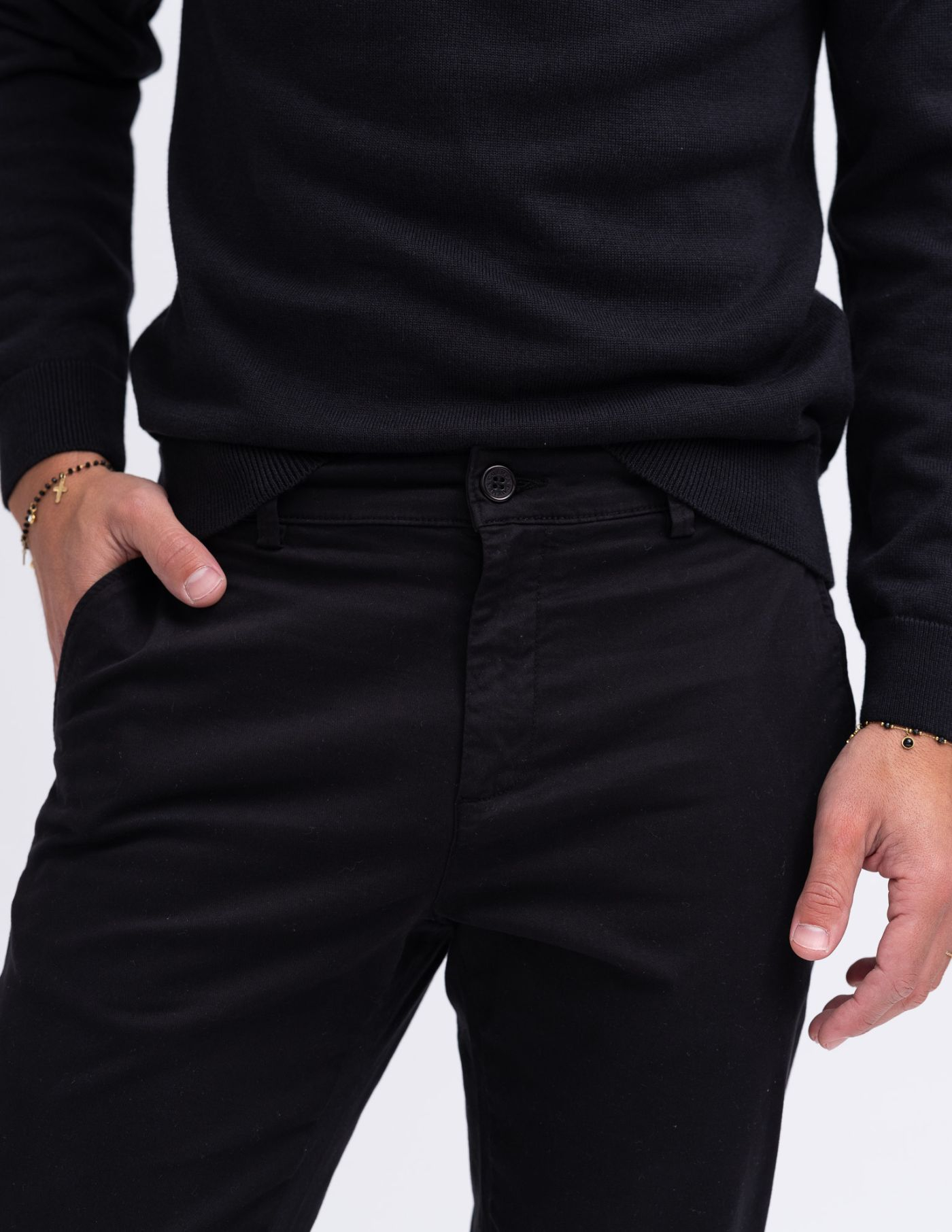 Calças chino slim fit com bainha normal e quatro bolsos.