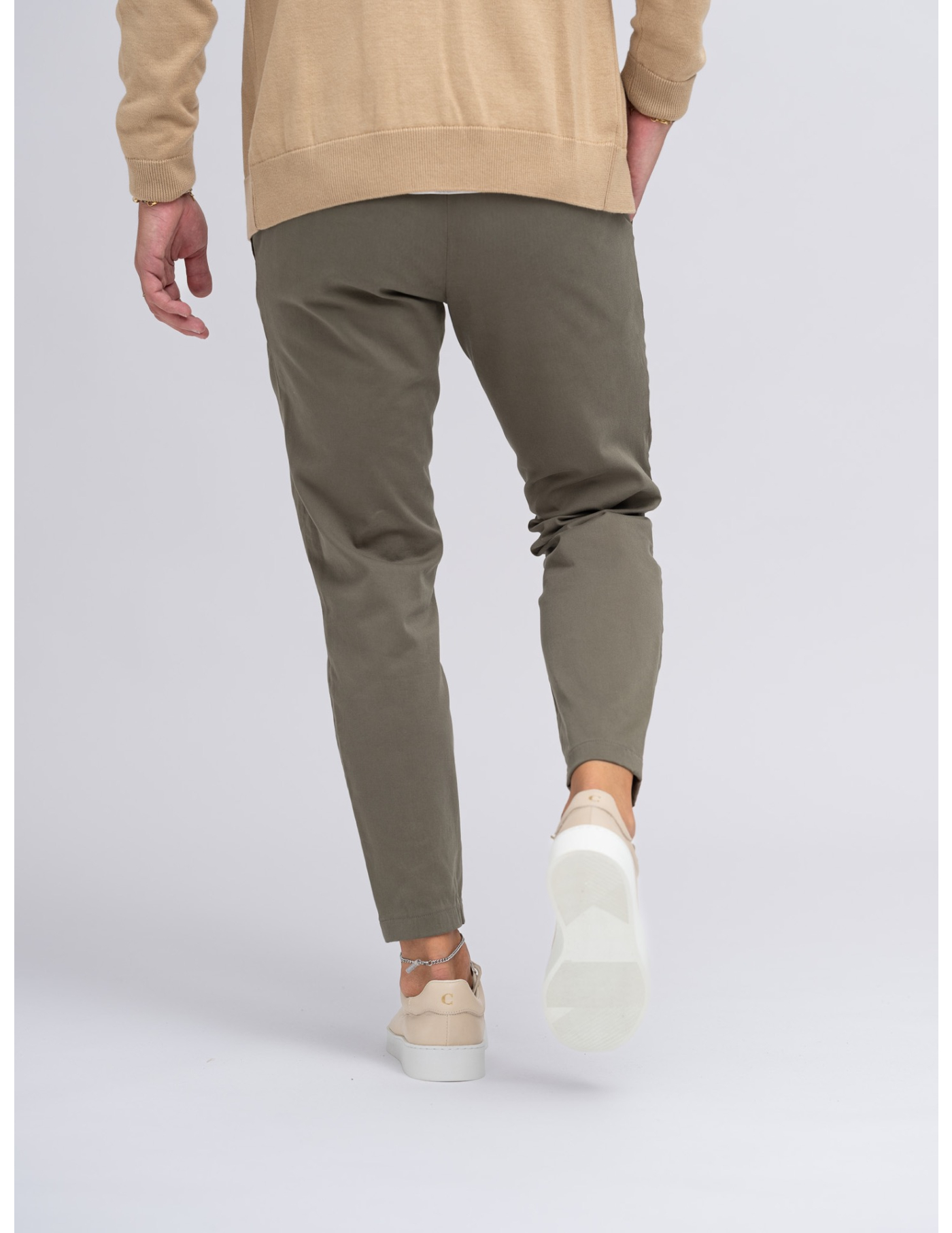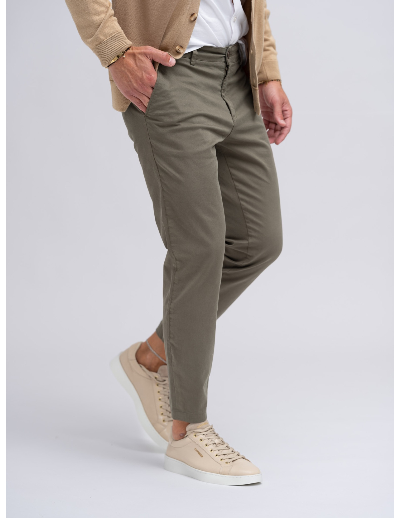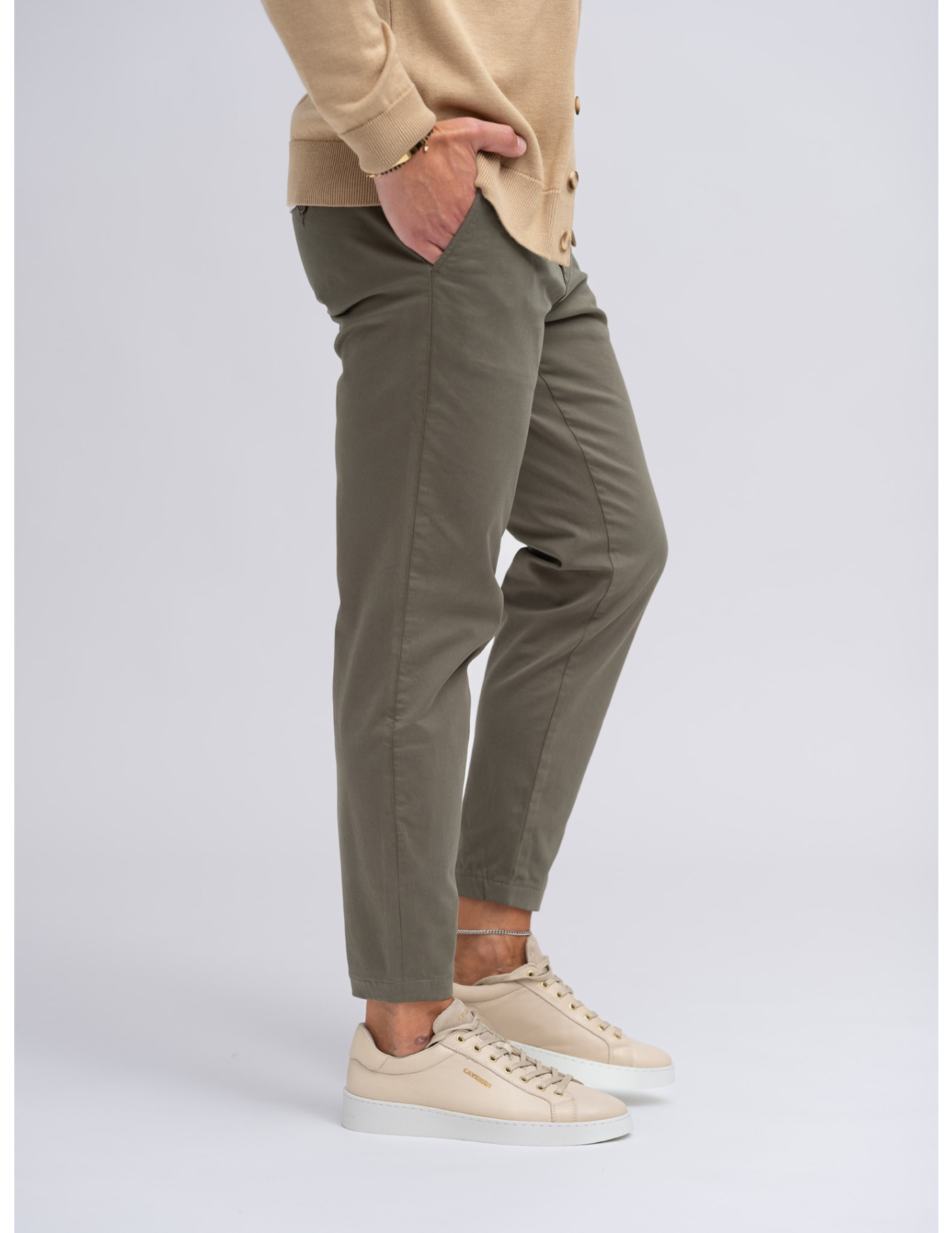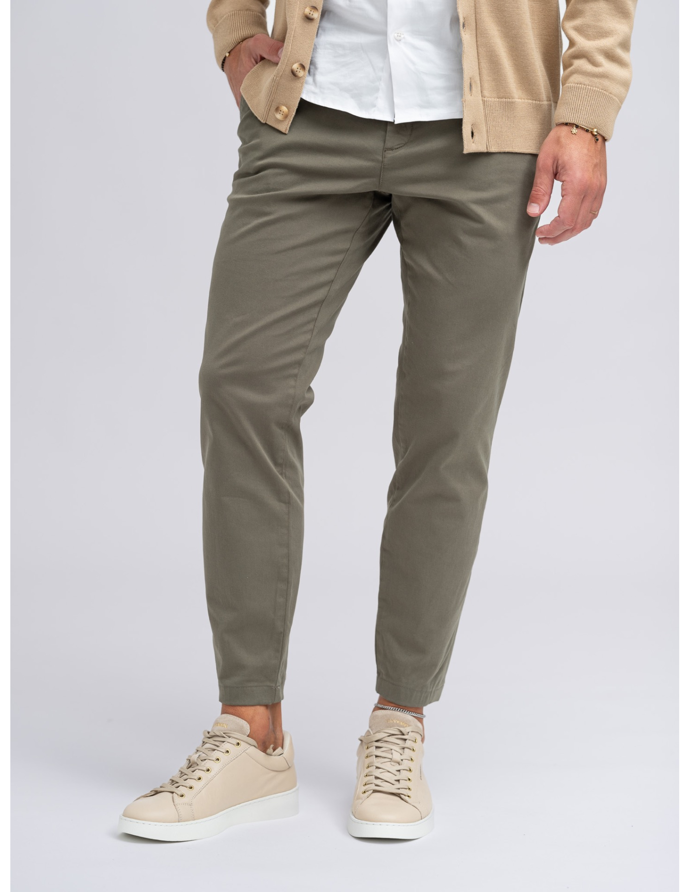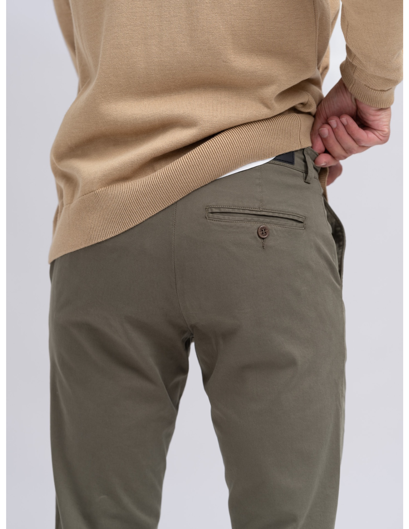 Calças chino slim fit com bainha normal e quatro bolsos.