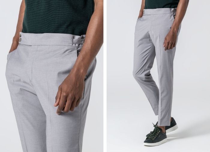Calça de Alfaiataria Masculina cintura subida com cinto de trespasse e fivelas laterais.