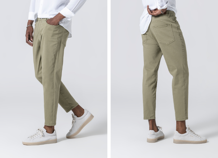 As calças são cropped fit, tendo um gancho mais curto e perna tapered fit (mais largas na cinta e coxa, afunilando no joelho e tornozelo). O nosso modelo tem 1,85m de altura, pesa 80kg e veste o tamanho 42.