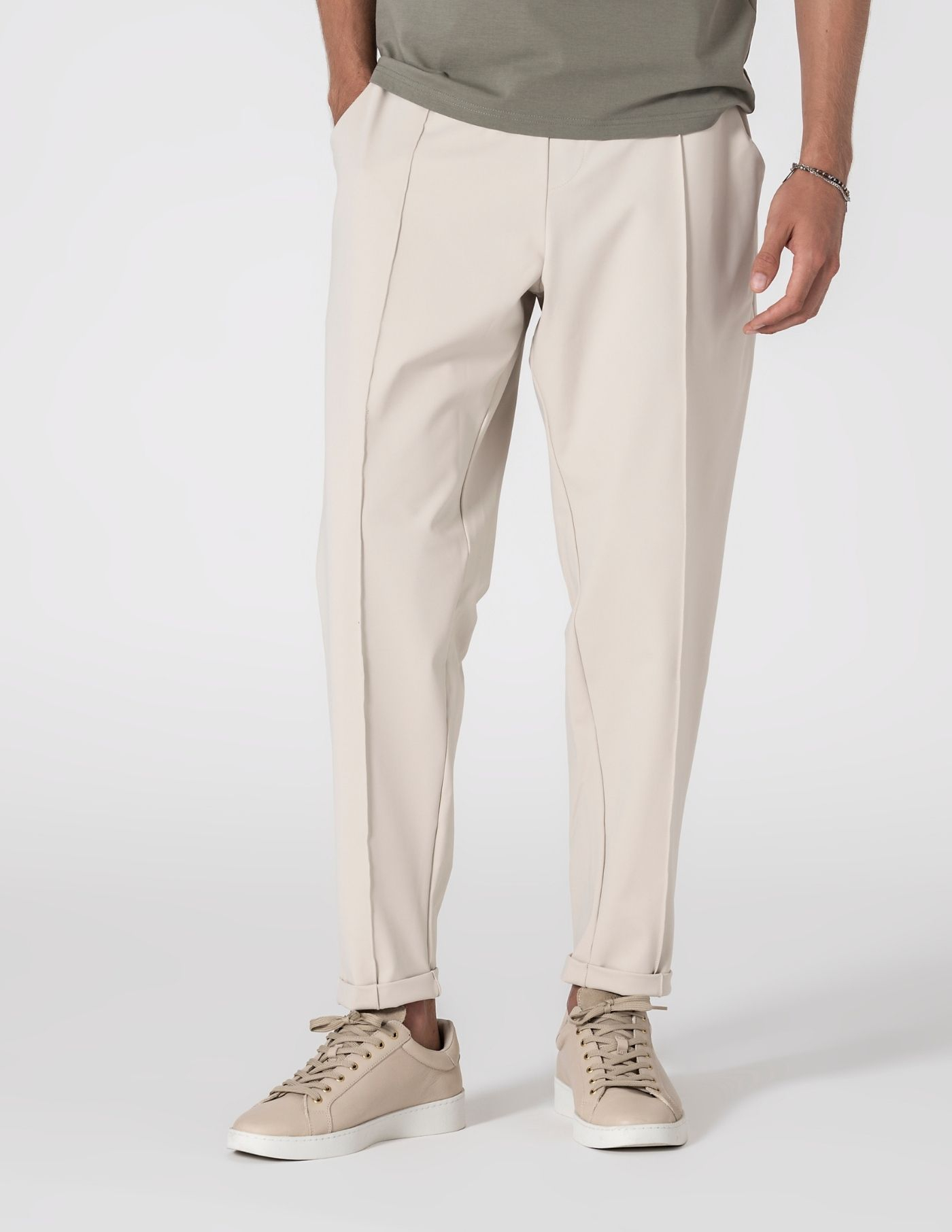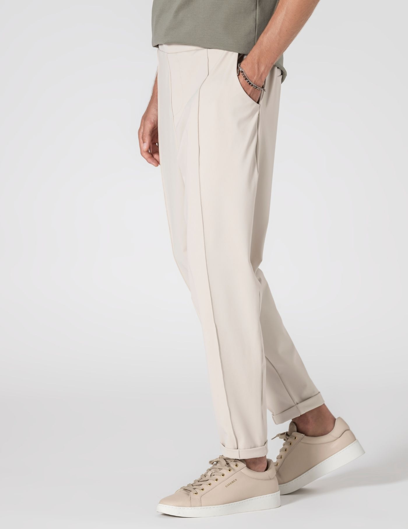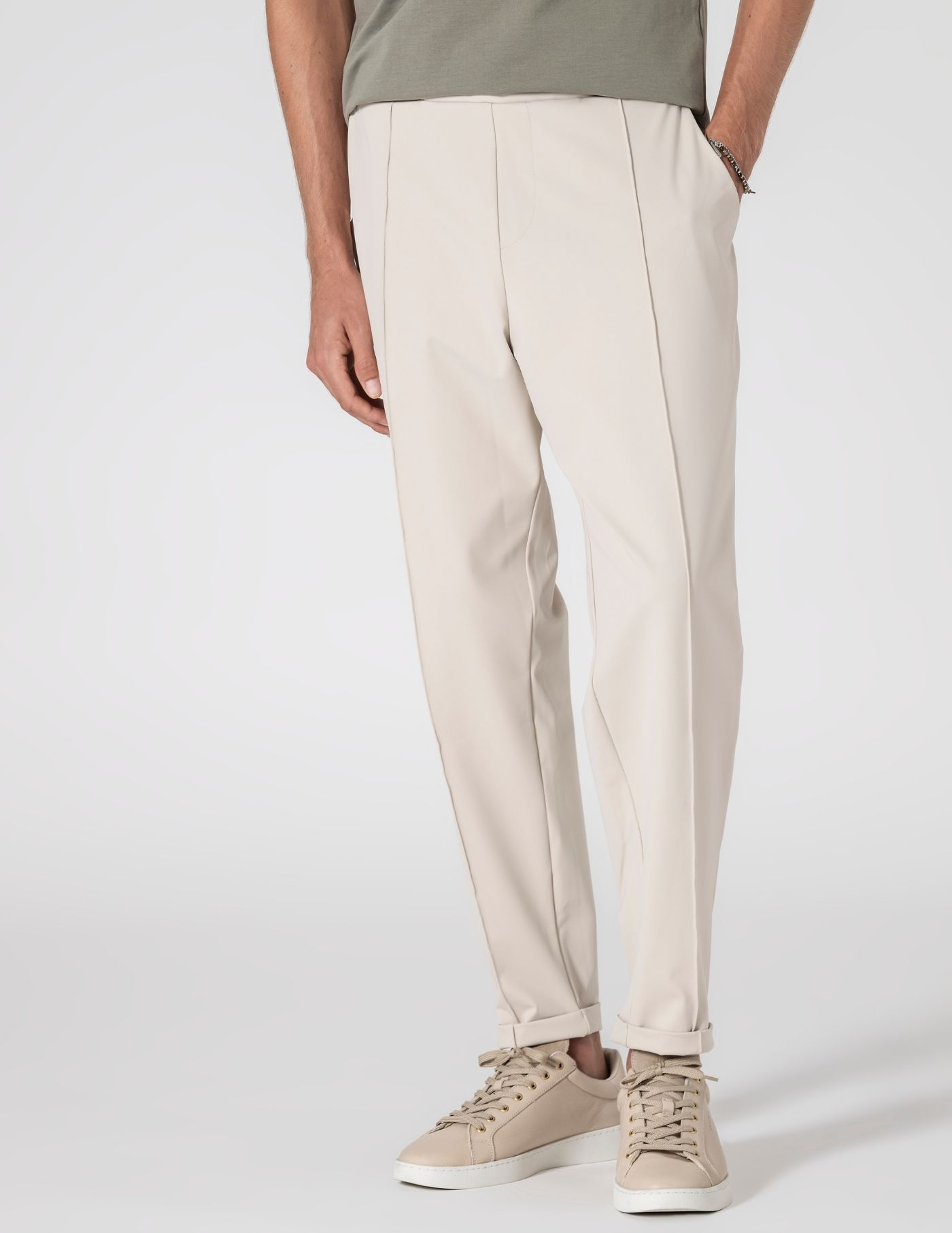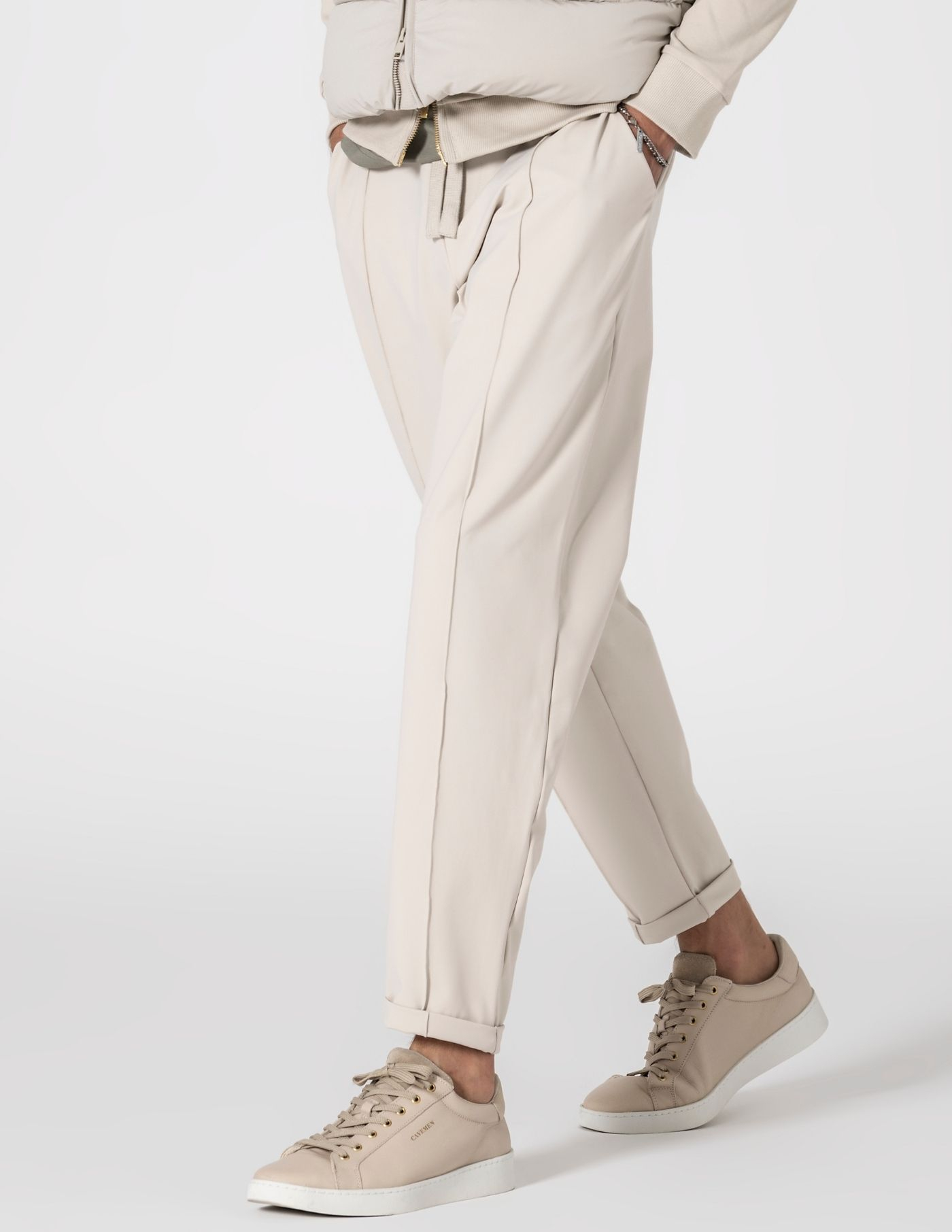Calça bege em tecido técnico com elasticidade. Produzida em poliamida com elastano oferece leveza, toque suave e liberdade de movimentos, mantendo a forma ao longo do dia. A nervura frontal e o comprimento cropped criam uma silhueta limpa e alongada, a perna é ligeiramente mais larga na parte superior, afunilando subtilmente do joelho ao tornozelo. A cintura com cordão interior oculto dá-te liberdade de escolha, discreto por dentro ou exposto, se preferires.
