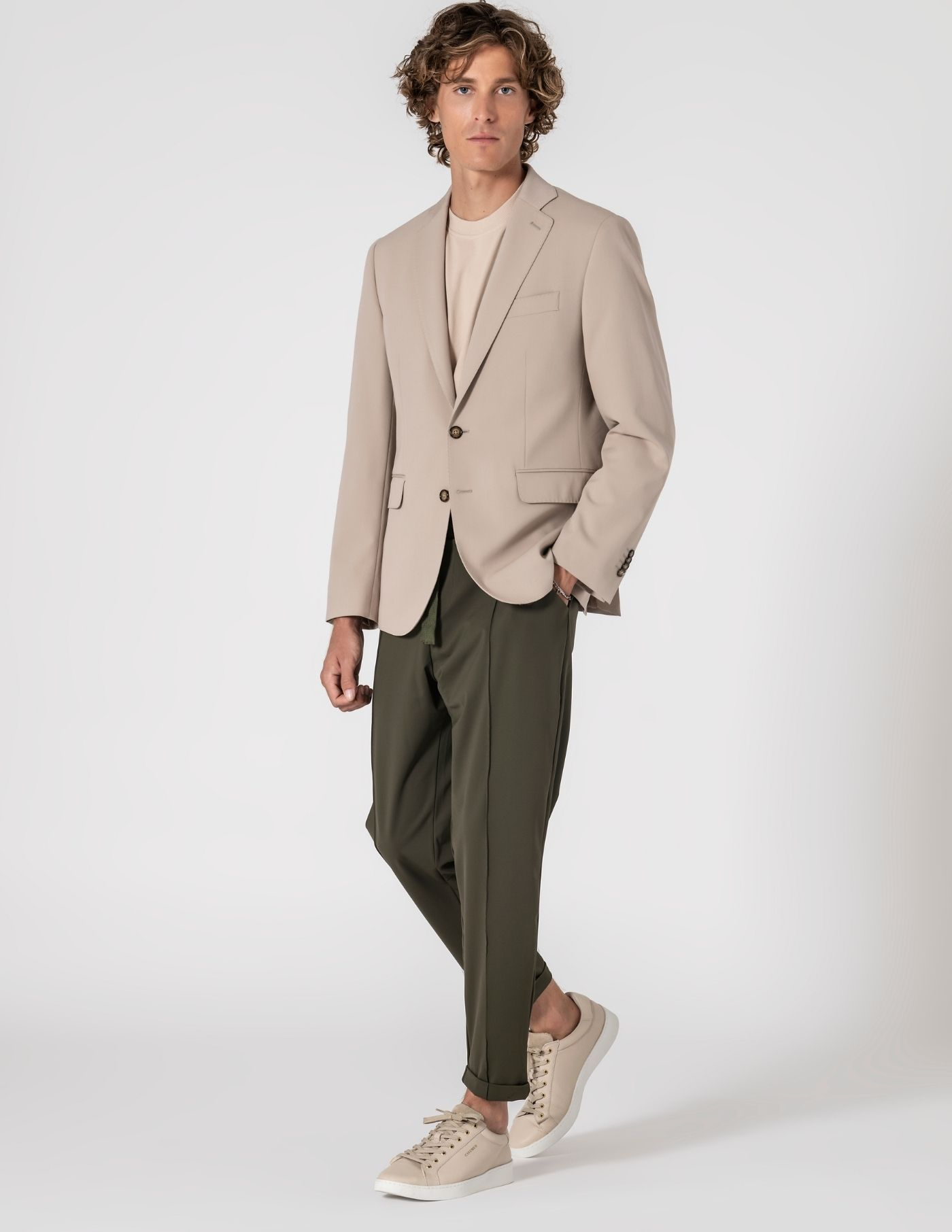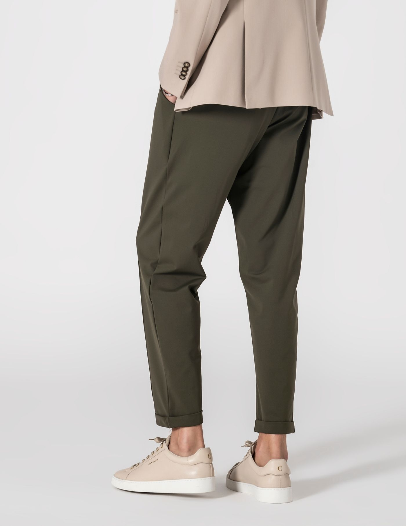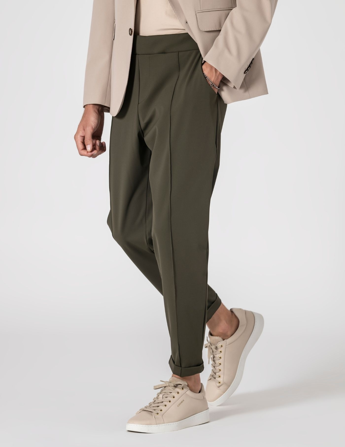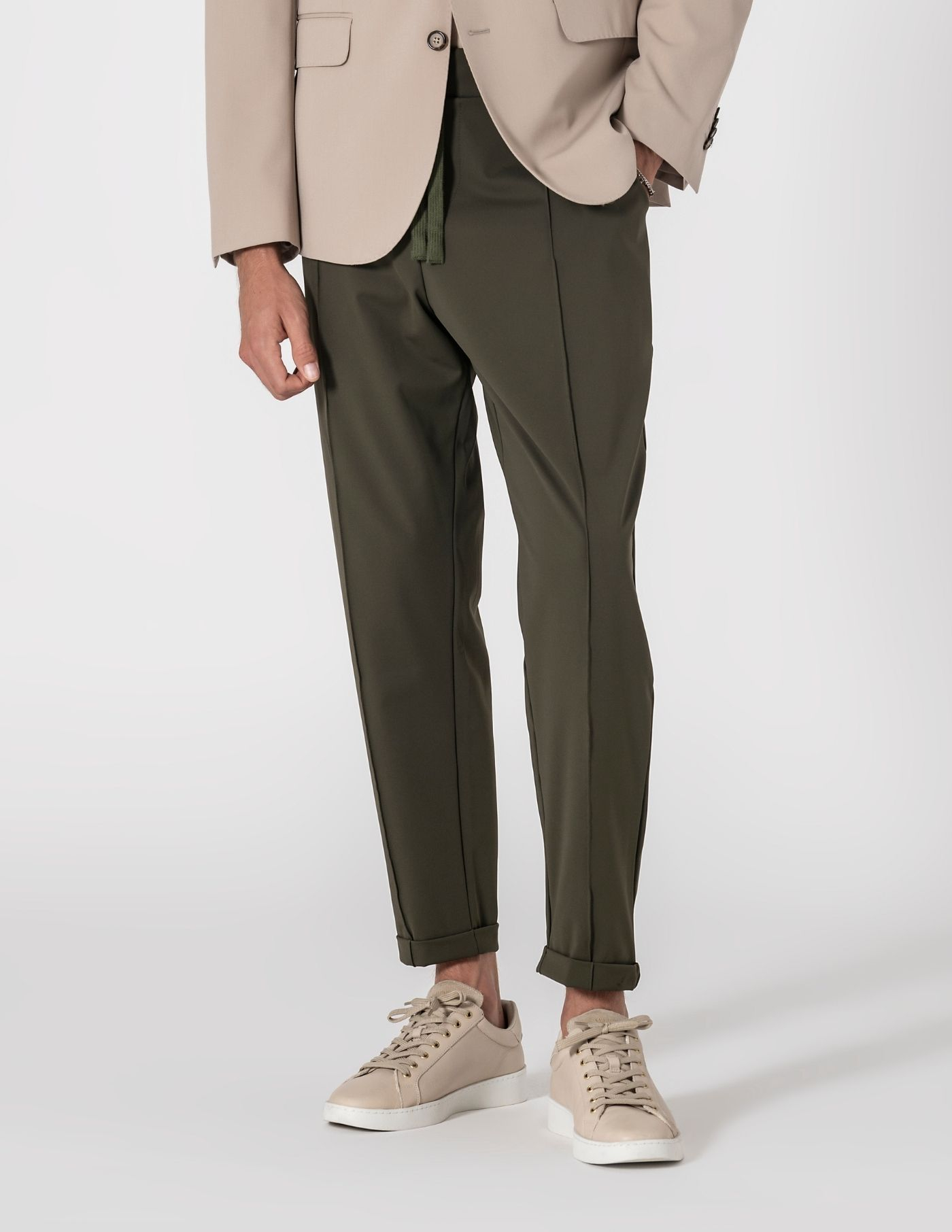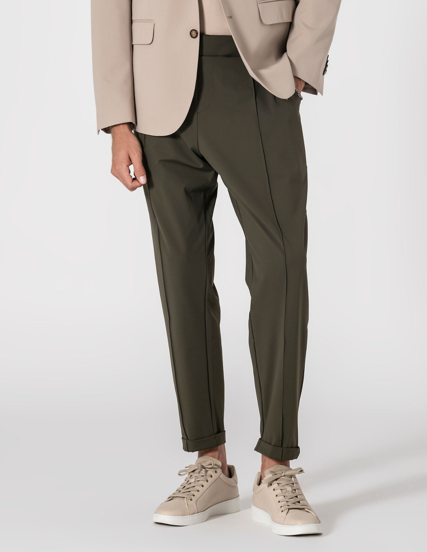 Calça verde em tecido técnico com elasticidade. Produzida em poliamida com elastano oferece leveza, toque suave e liberdade de movimentos, mantendo a forma ao longo do dia. A nervura frontal e o comprimento cropped criam uma silhueta limpa e alongada, a perna é ligeiramente mais larga na parte superior, afunilando subtilmente do joelho ao tornozelo. A cintura com cordão interior oculto dá-te liberdade de escolha, discreto por dentro ou exposto, se preferires.