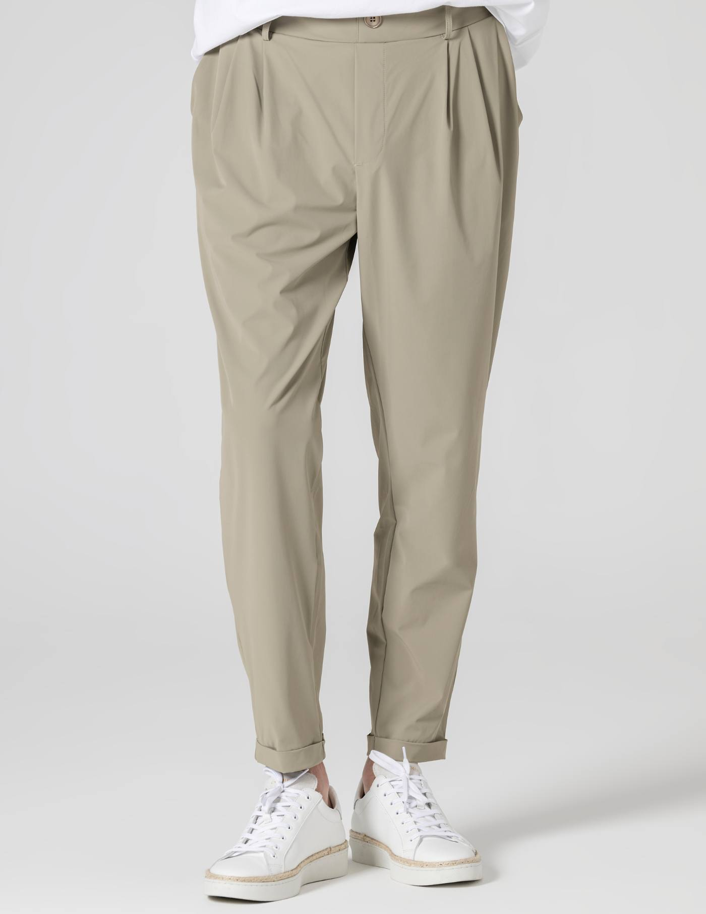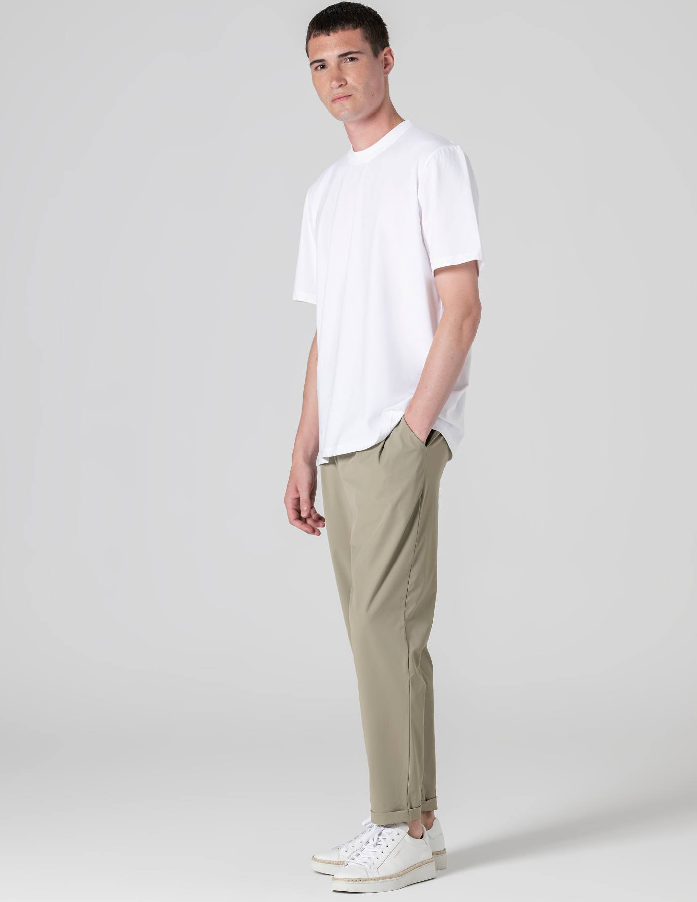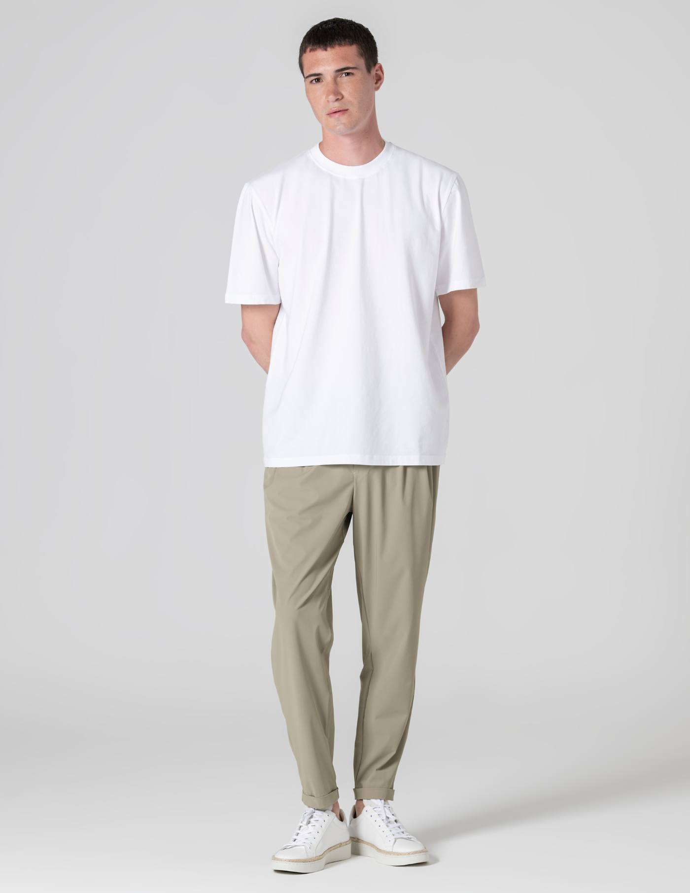 Calça em tecido técnico leve e fresco, numa mistura de nylon e elastano que garante conforto e liberdade de movimentos sem perder a forma, pensada para dias mais quentes.