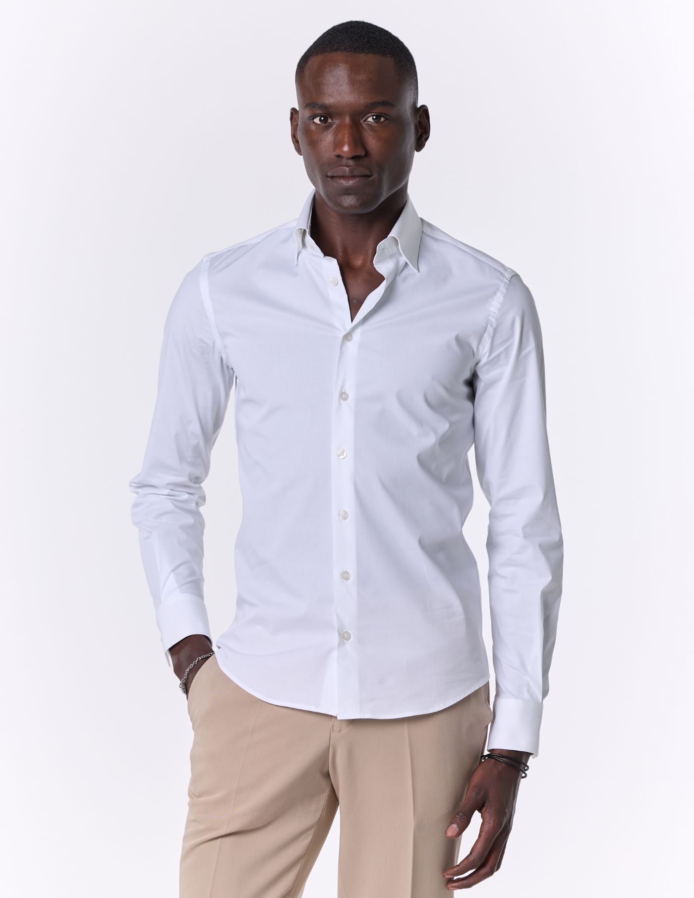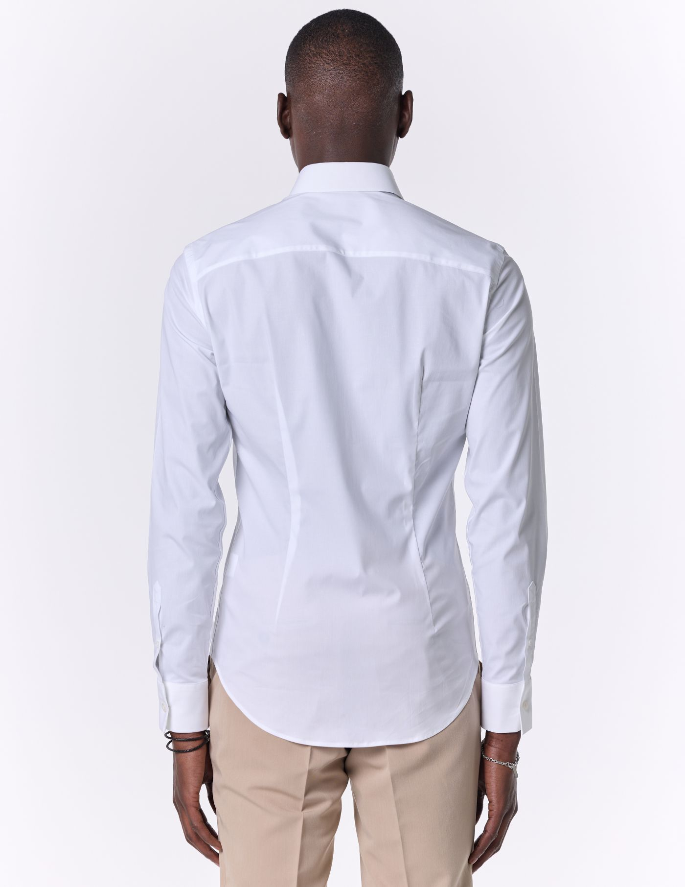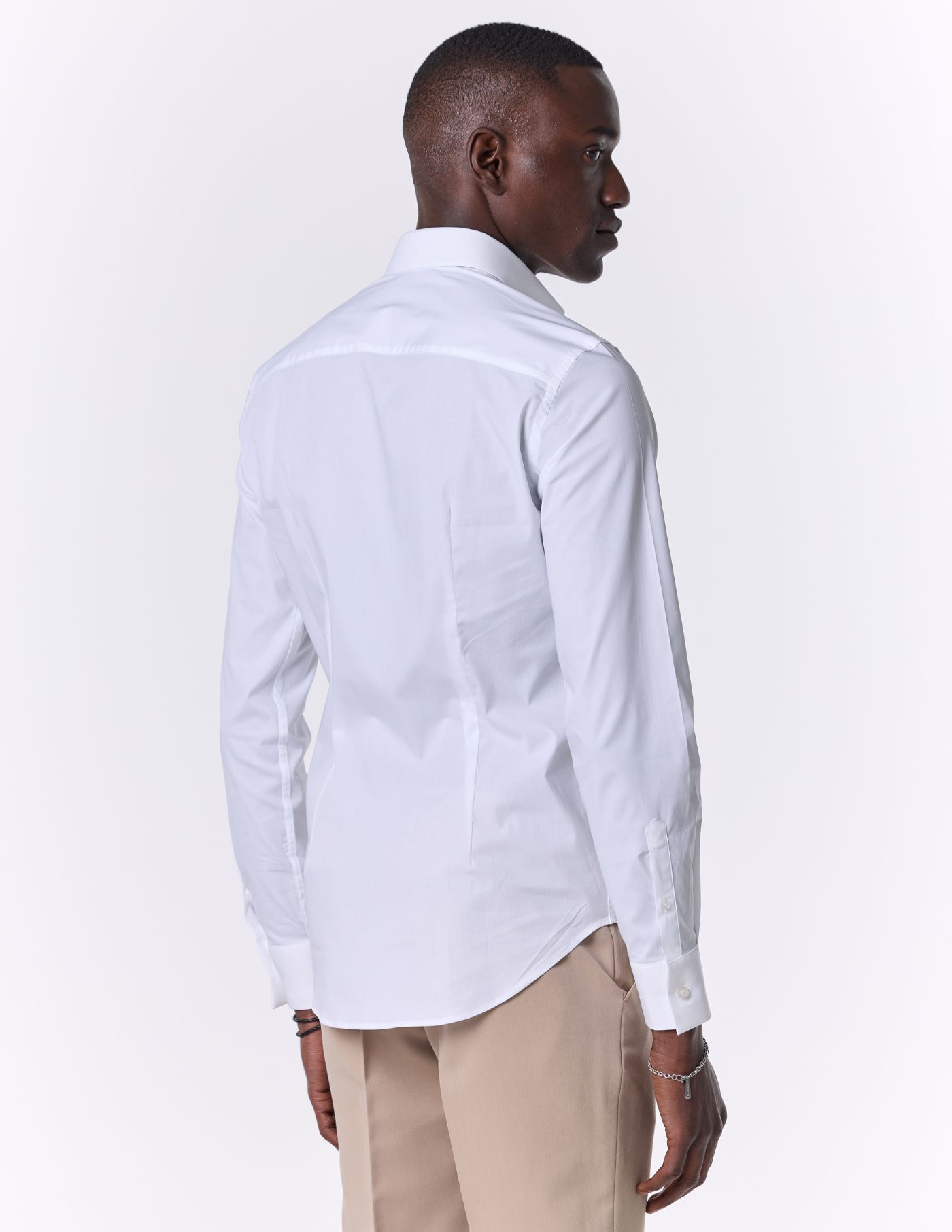 É leve e elegante, e combina o corte slim fit com uma gola ligeiramente mais alta e opção de casa para usar botão de punho.