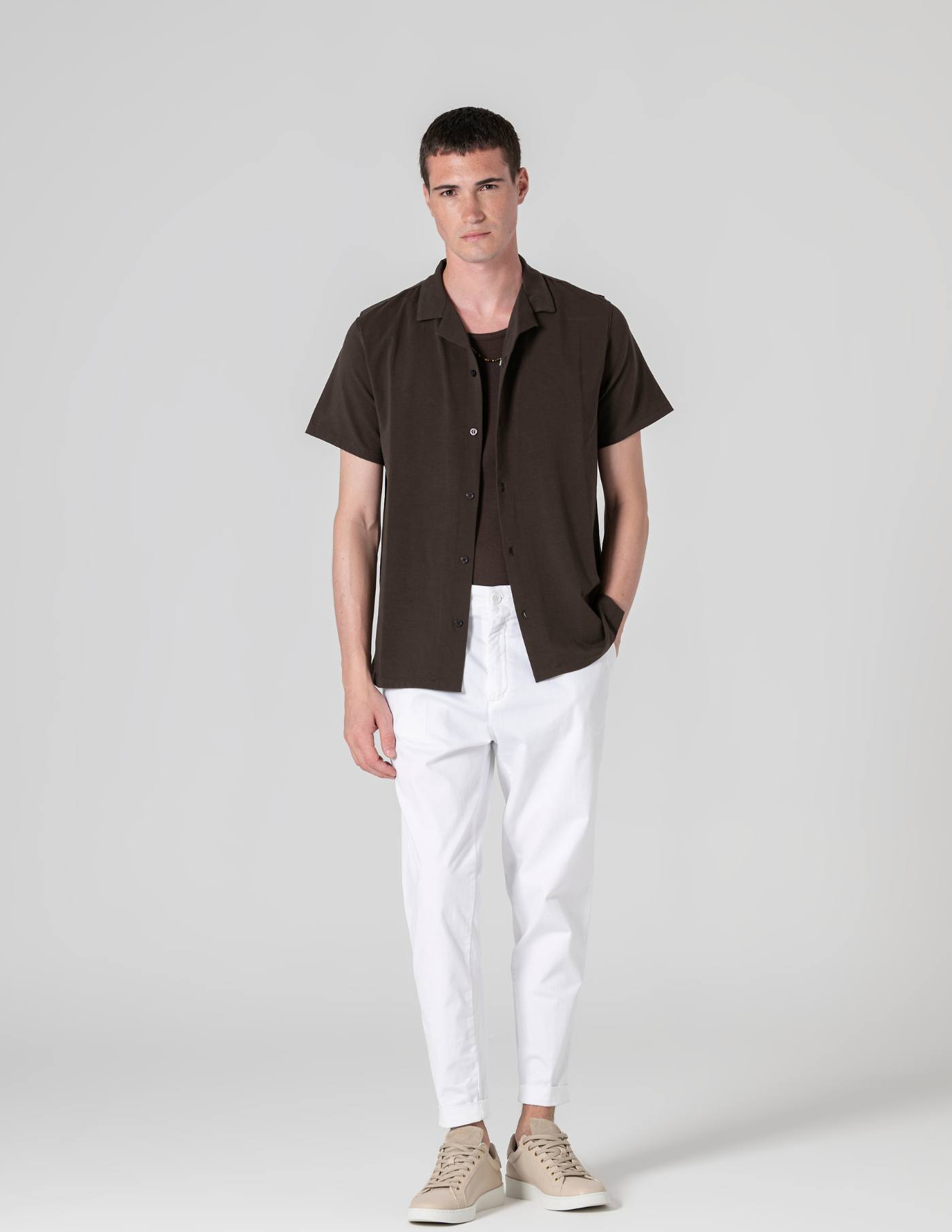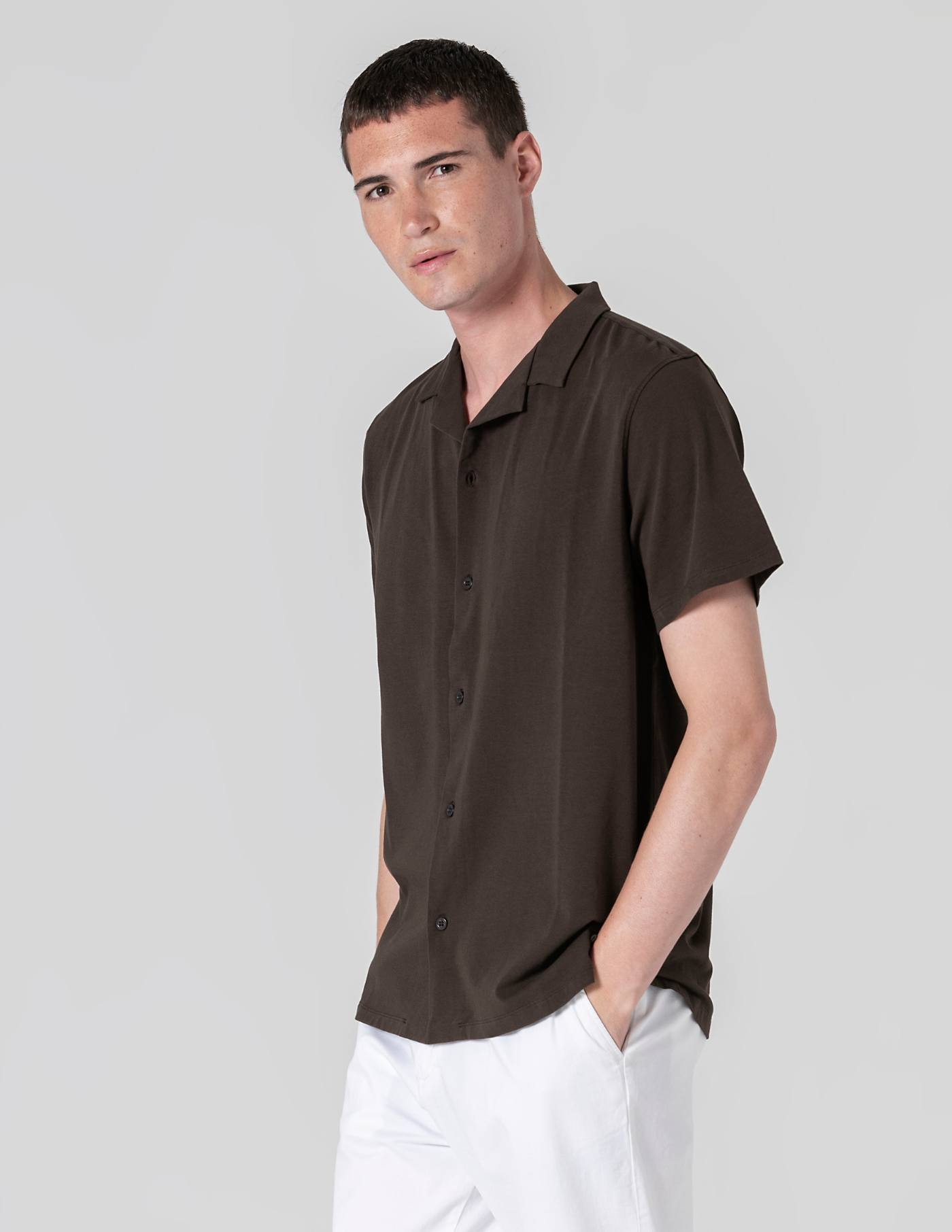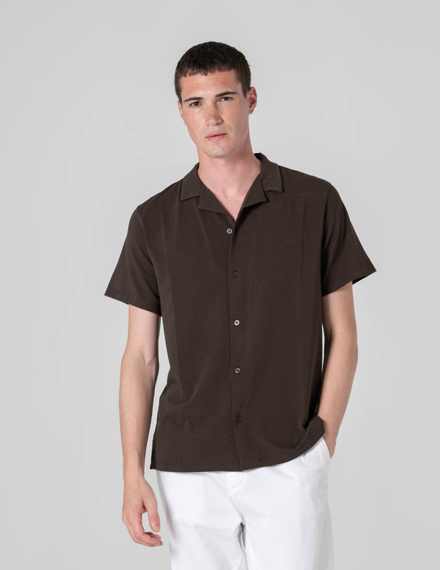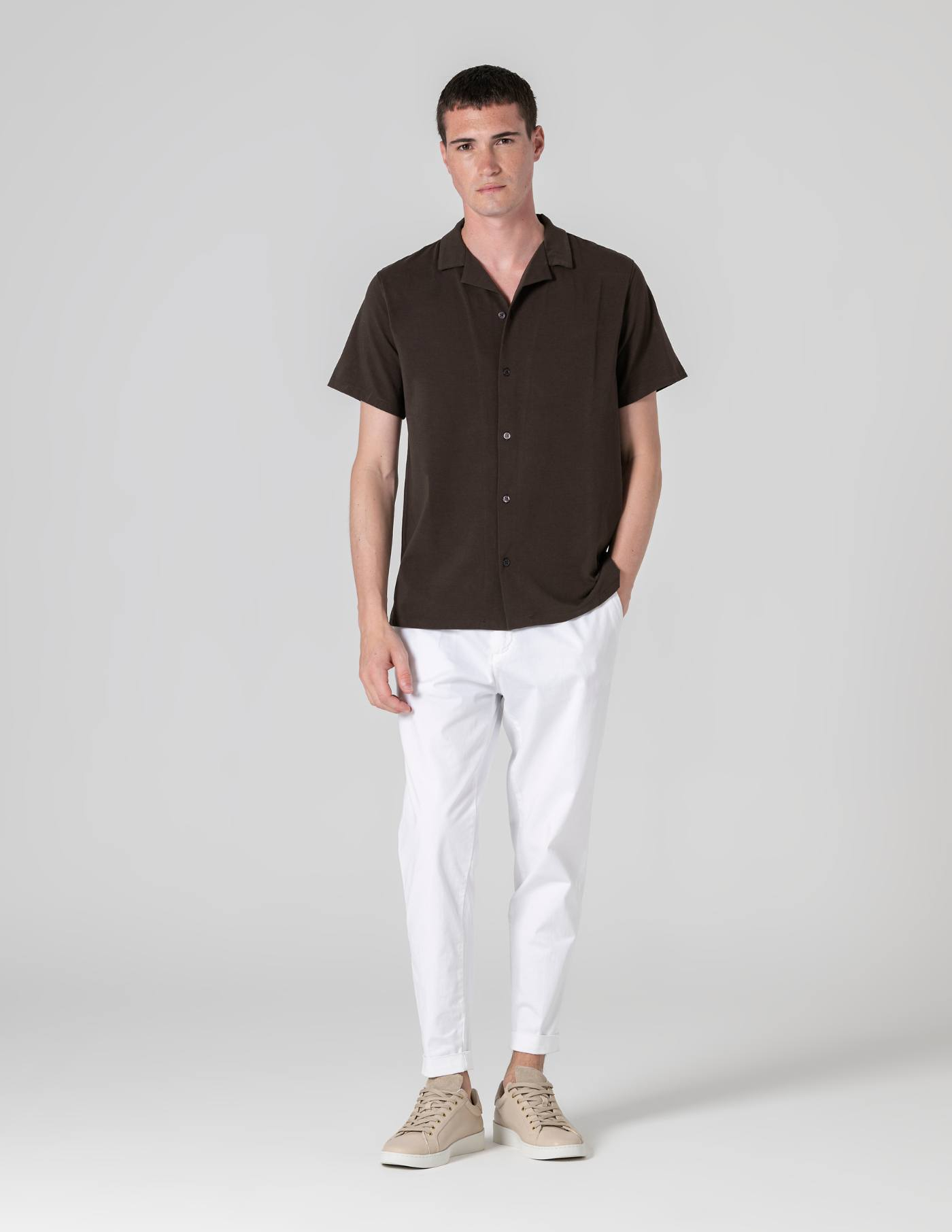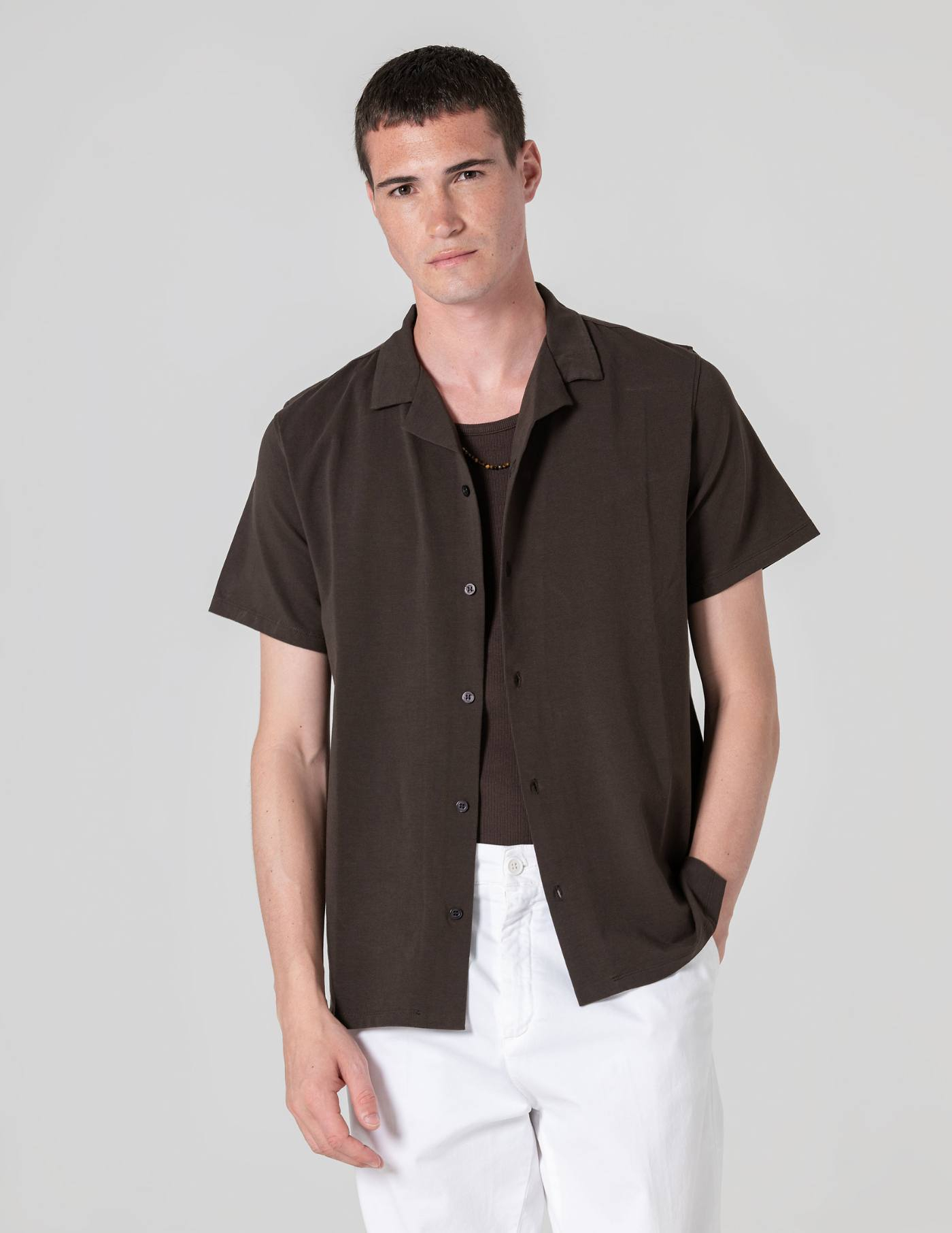Versátil por natureza, resulta bem sozinha ou aberta sobre uma t-shirt, combinada com calções, ganga ou chinos.