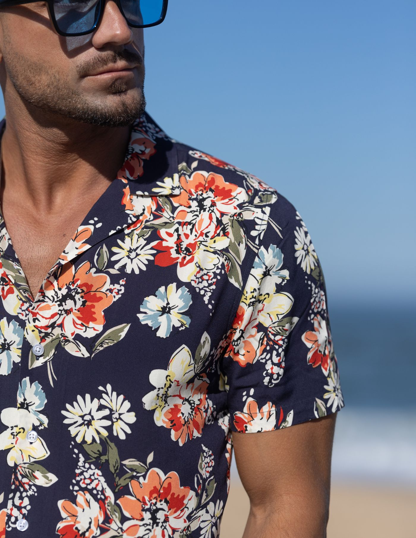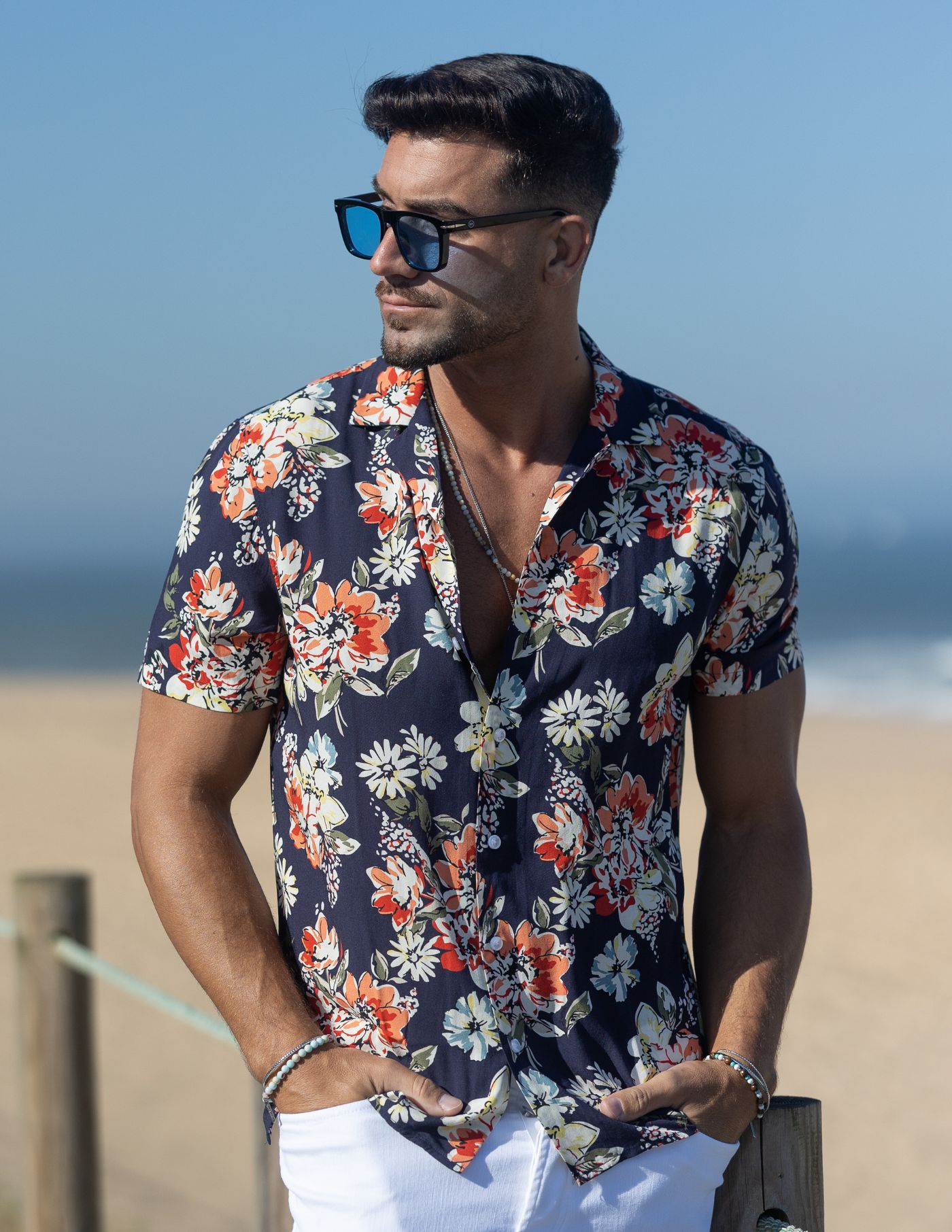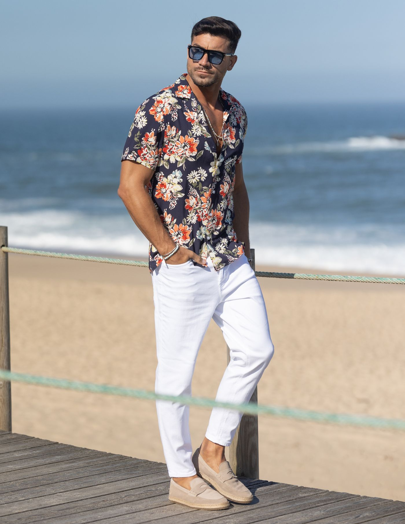 Um essencial de verão. Proporciona uma imagem mais relaxada e casual, conjugando um padrão arrojado com a leveza e conforto necessários para os dias mais quentes. Finalizada com botões brancos.