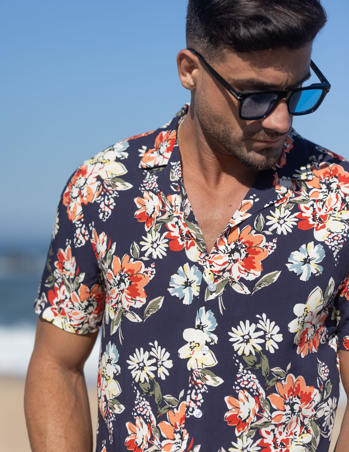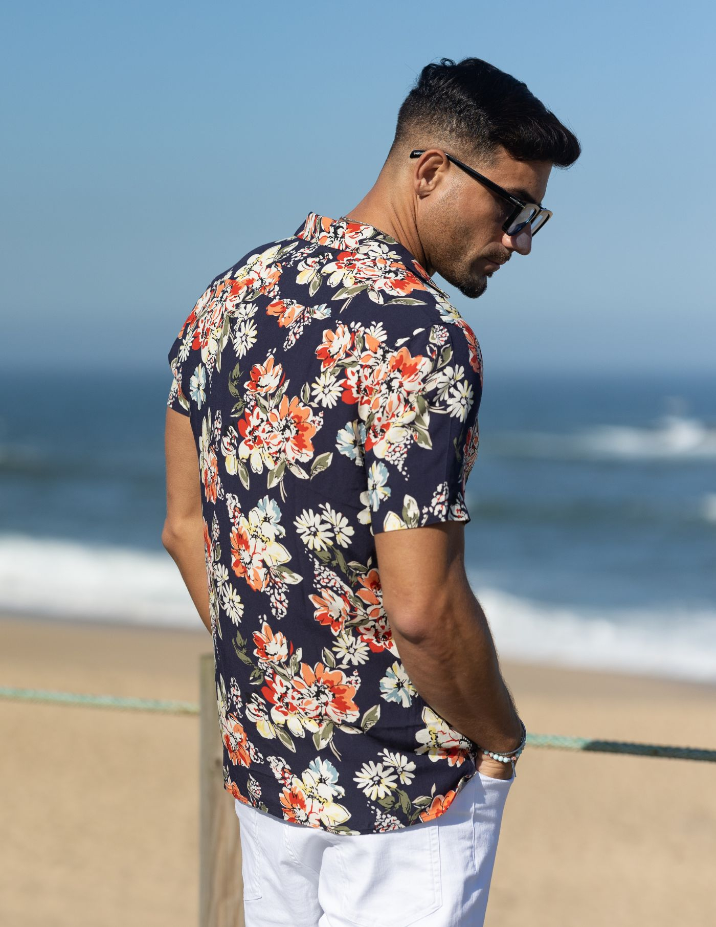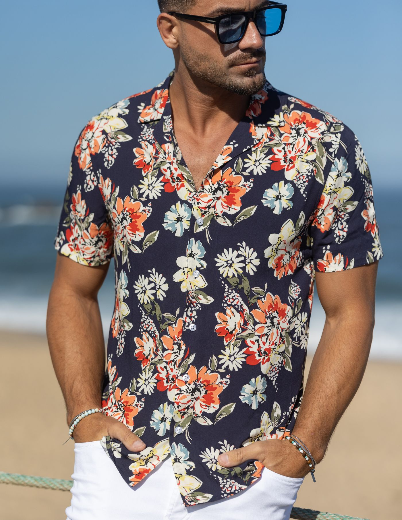 Um essencial de verão. Proporciona uma imagem mais relaxada e casual, conjugando um padrão arrojado com a leveza e conforto necessários para os dias mais quentes. Finalizada com botões brancos.