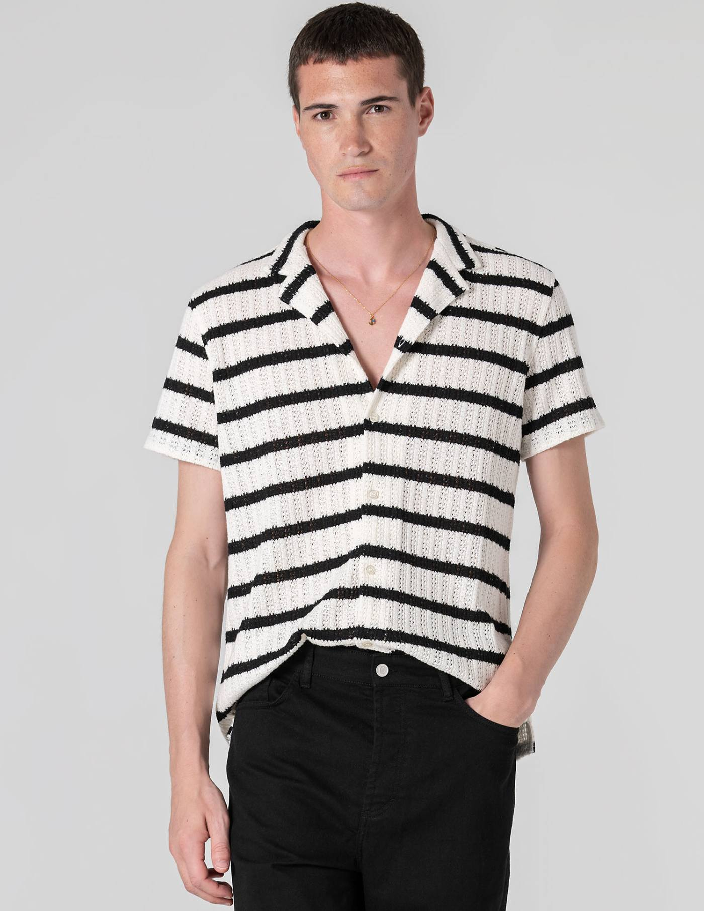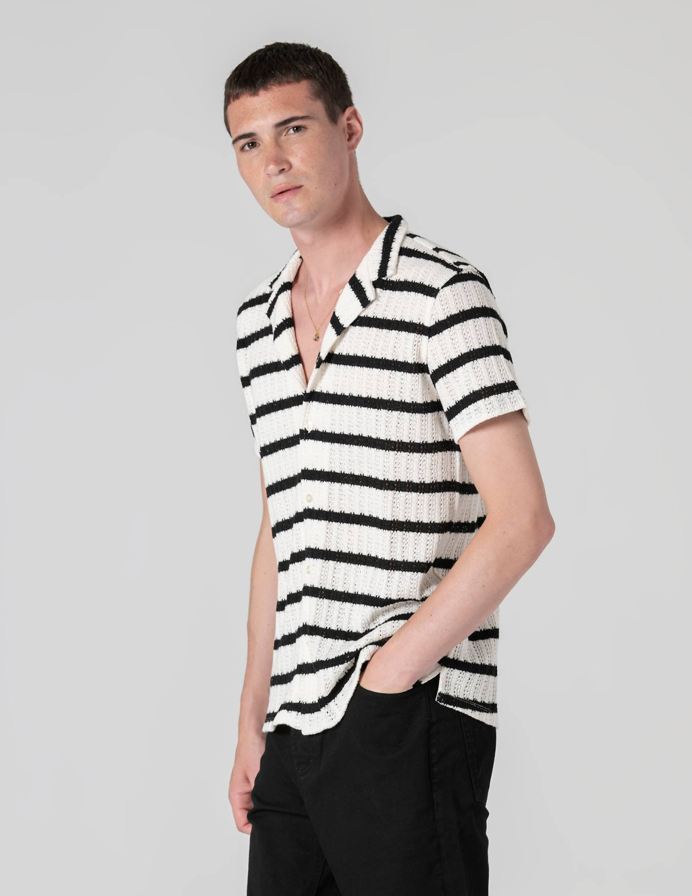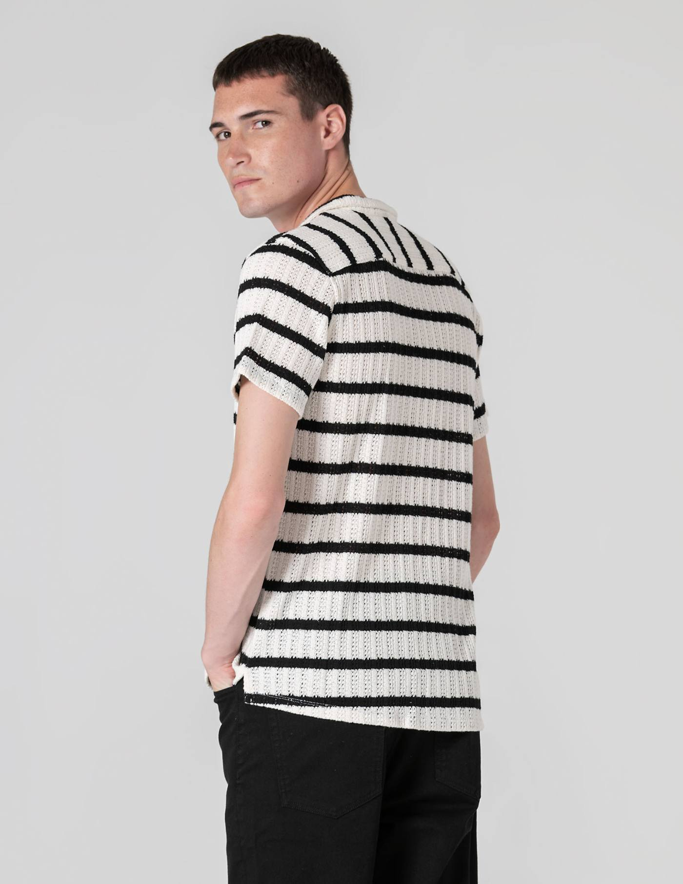 Camisa de manga curta com corte descontraído, tricotada em algodão e elastano para garantir conforto e leveza mesmo nos dias mais quentes.