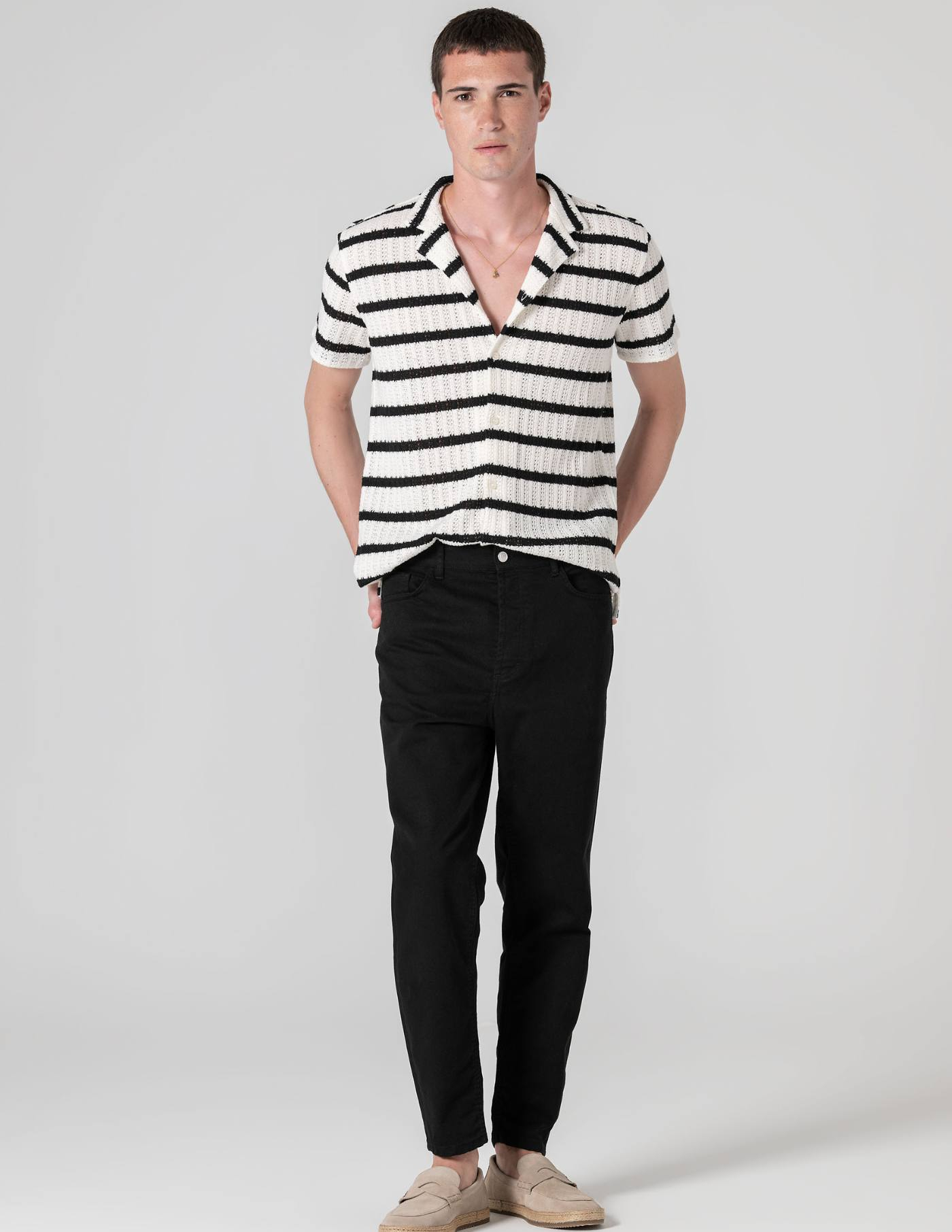 A risca azul discreta dá-lhe um carácter distinto sem perder a simplicidade. Versátil por natureza, resulta bem sozinha ou aberta sobre uma t-shirt.