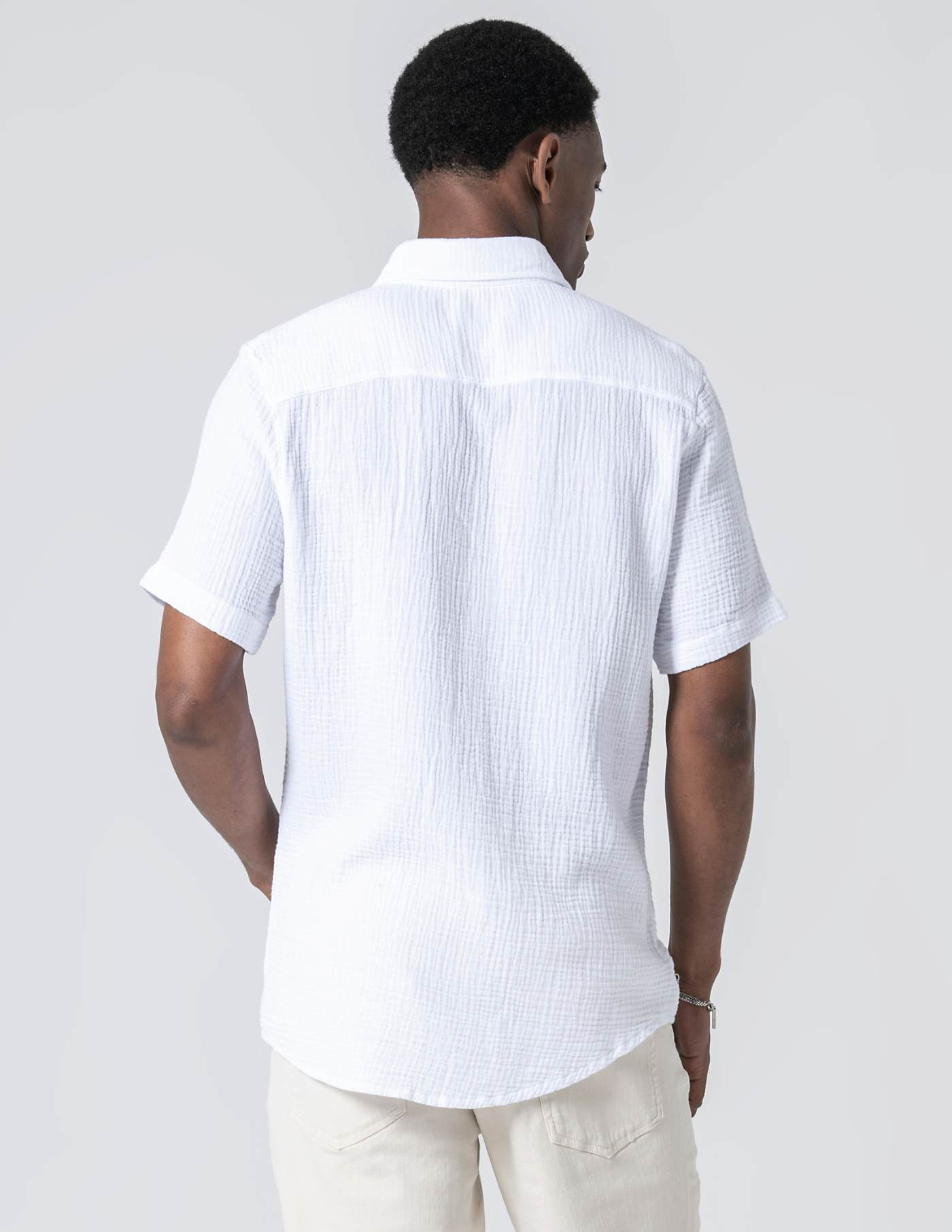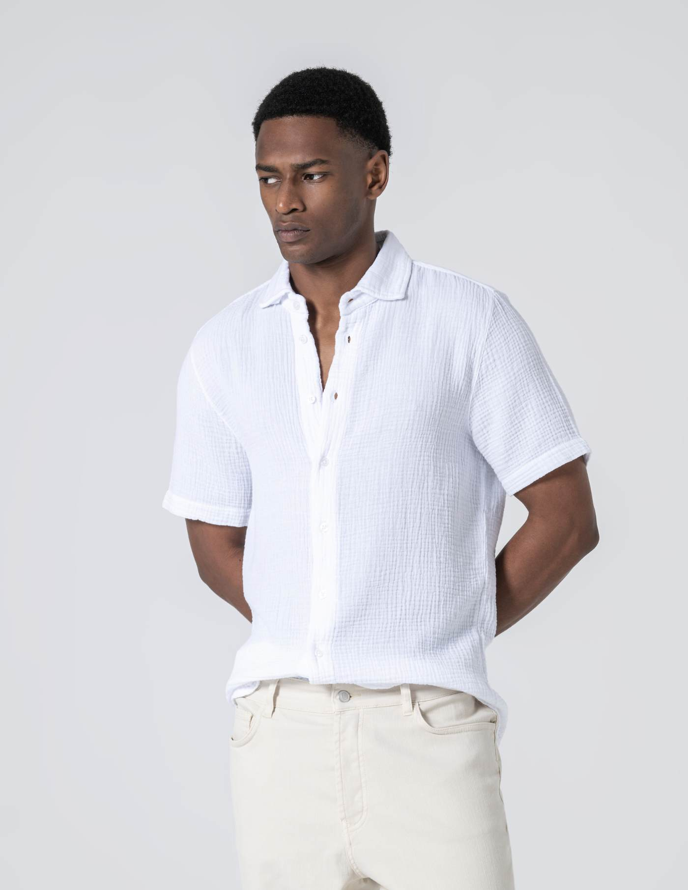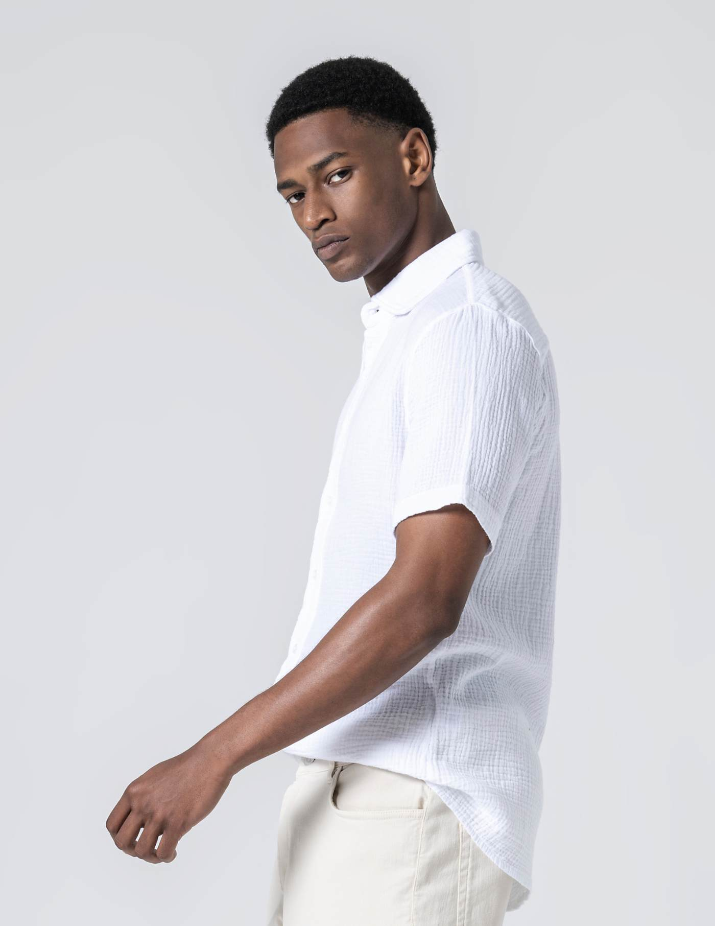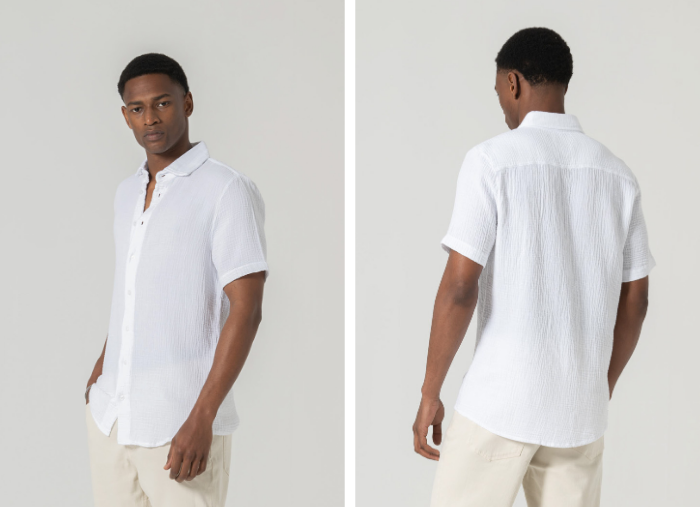 Camisa de manga curta em musselina de algodão. Leve, respirável e naturalmente texturada
