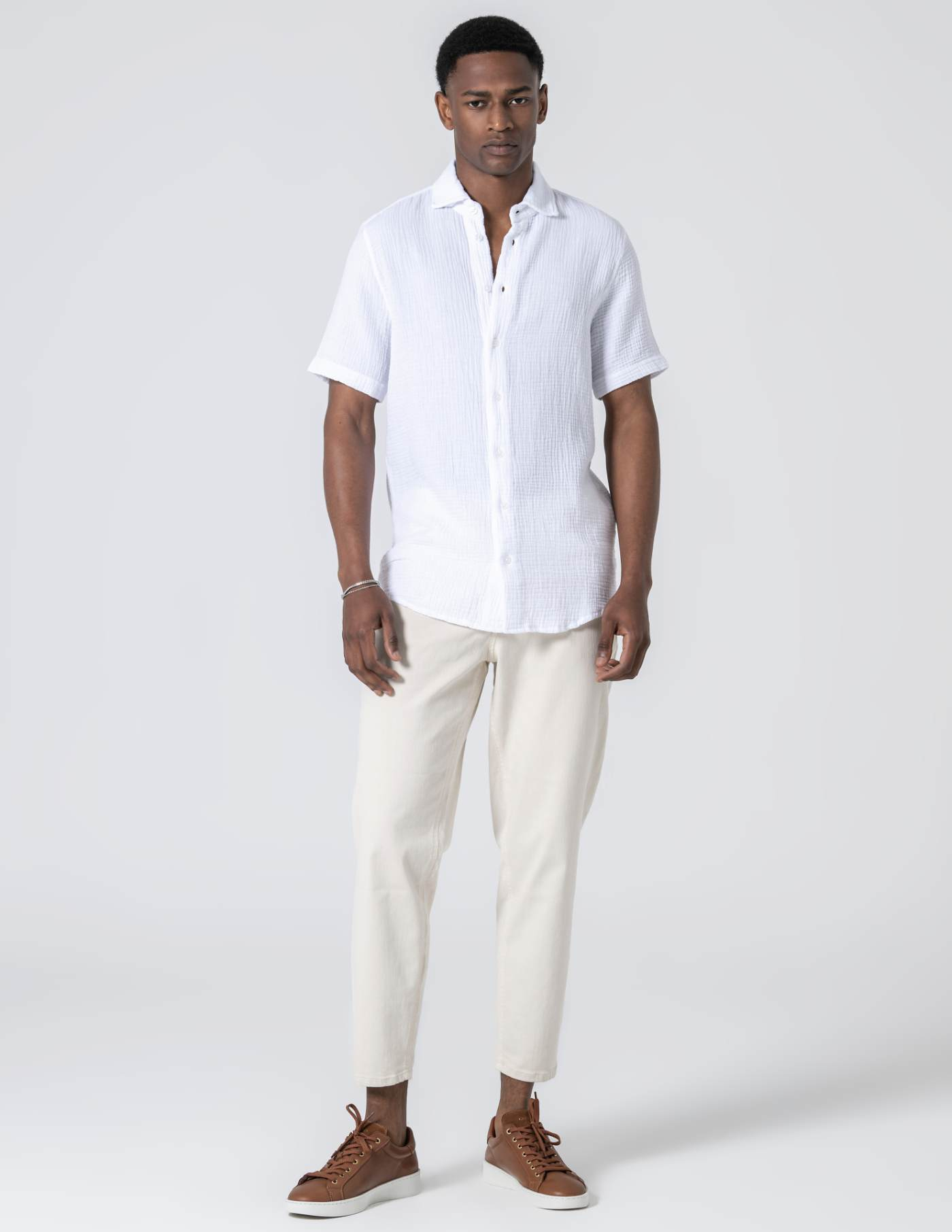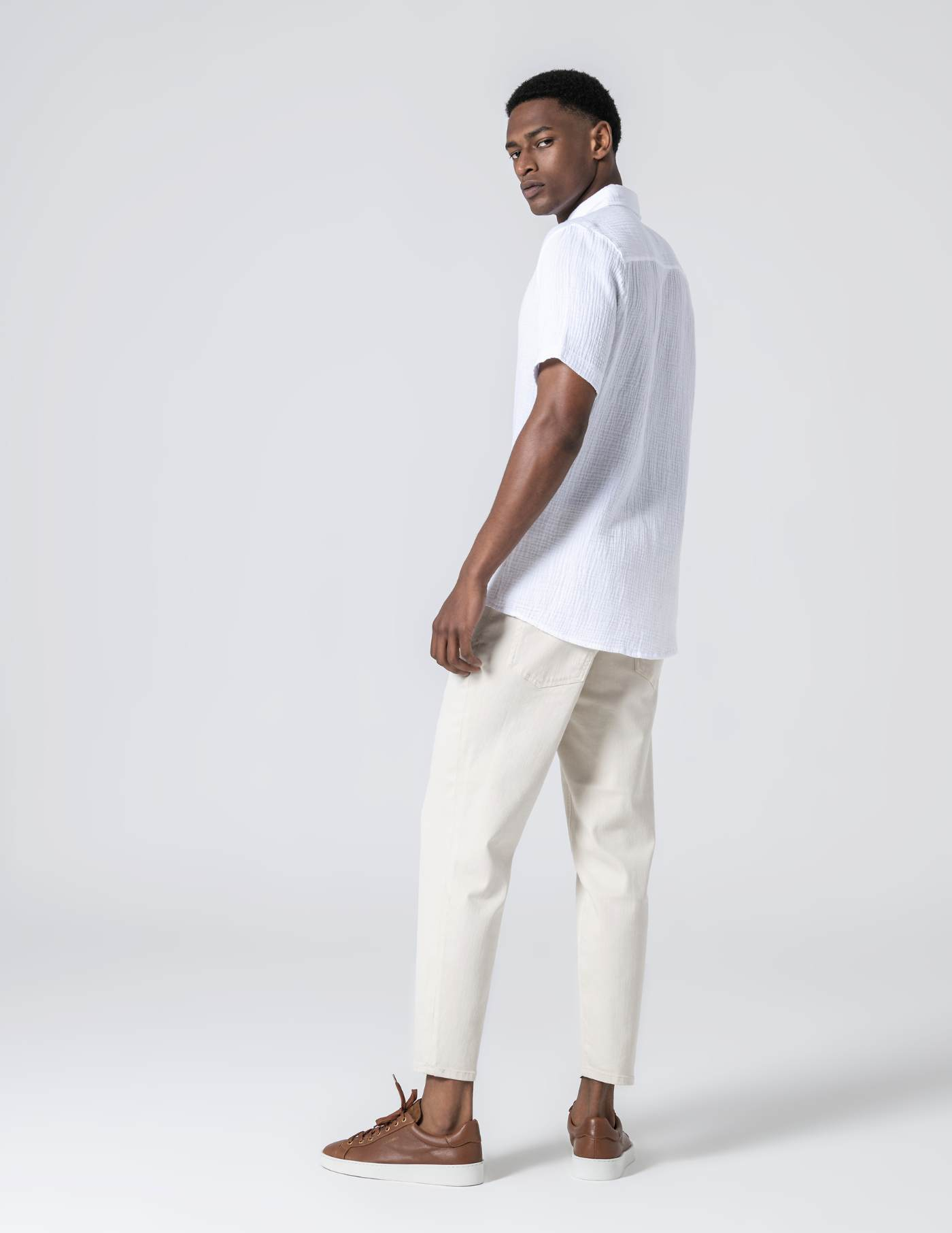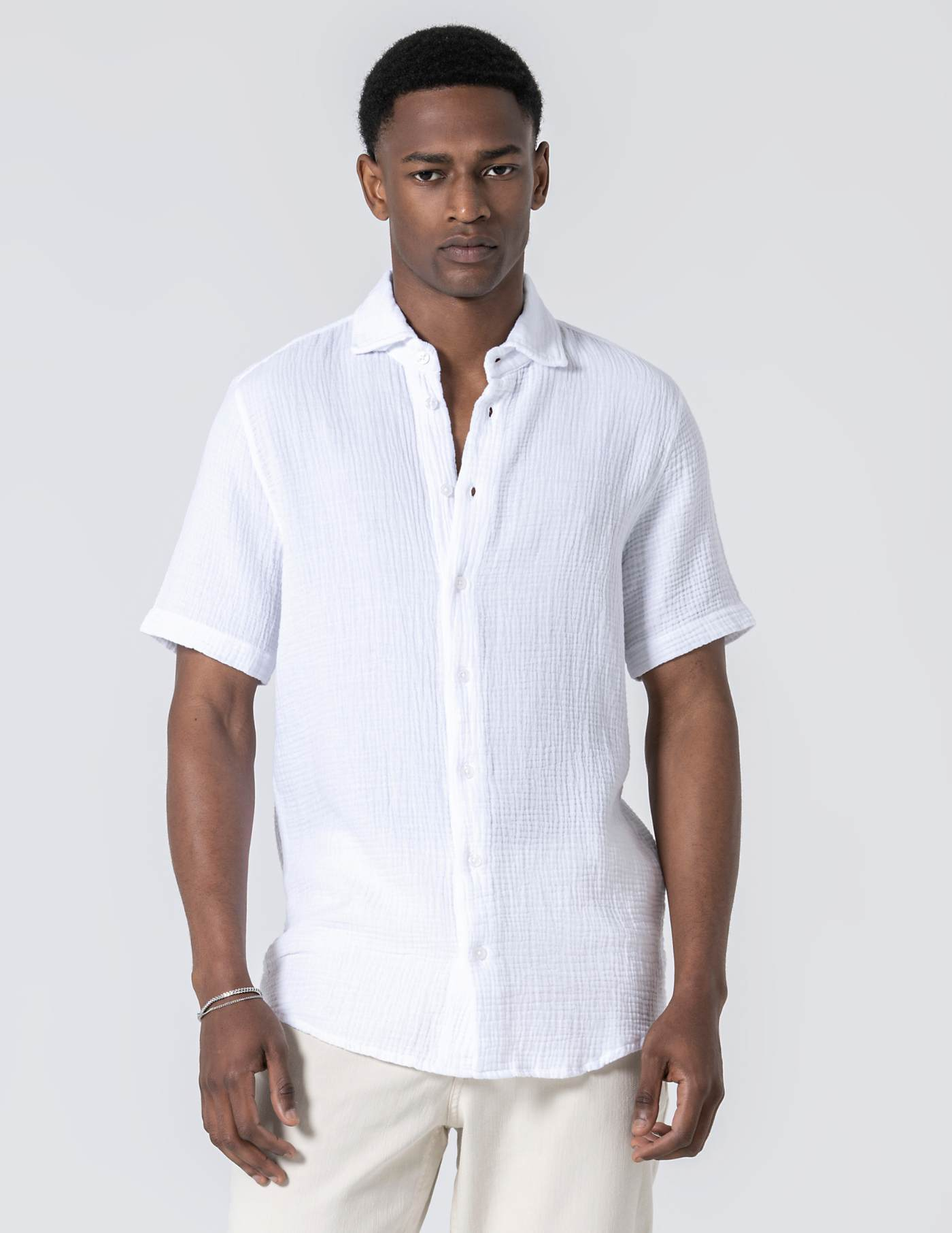 Camisa de manga curta em musselina de algodão. Leve, respirável e naturalmente texturada