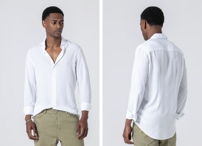 Finalizada com colarinho italiano e botão invisível, que mantém a estrutura do mesmo.