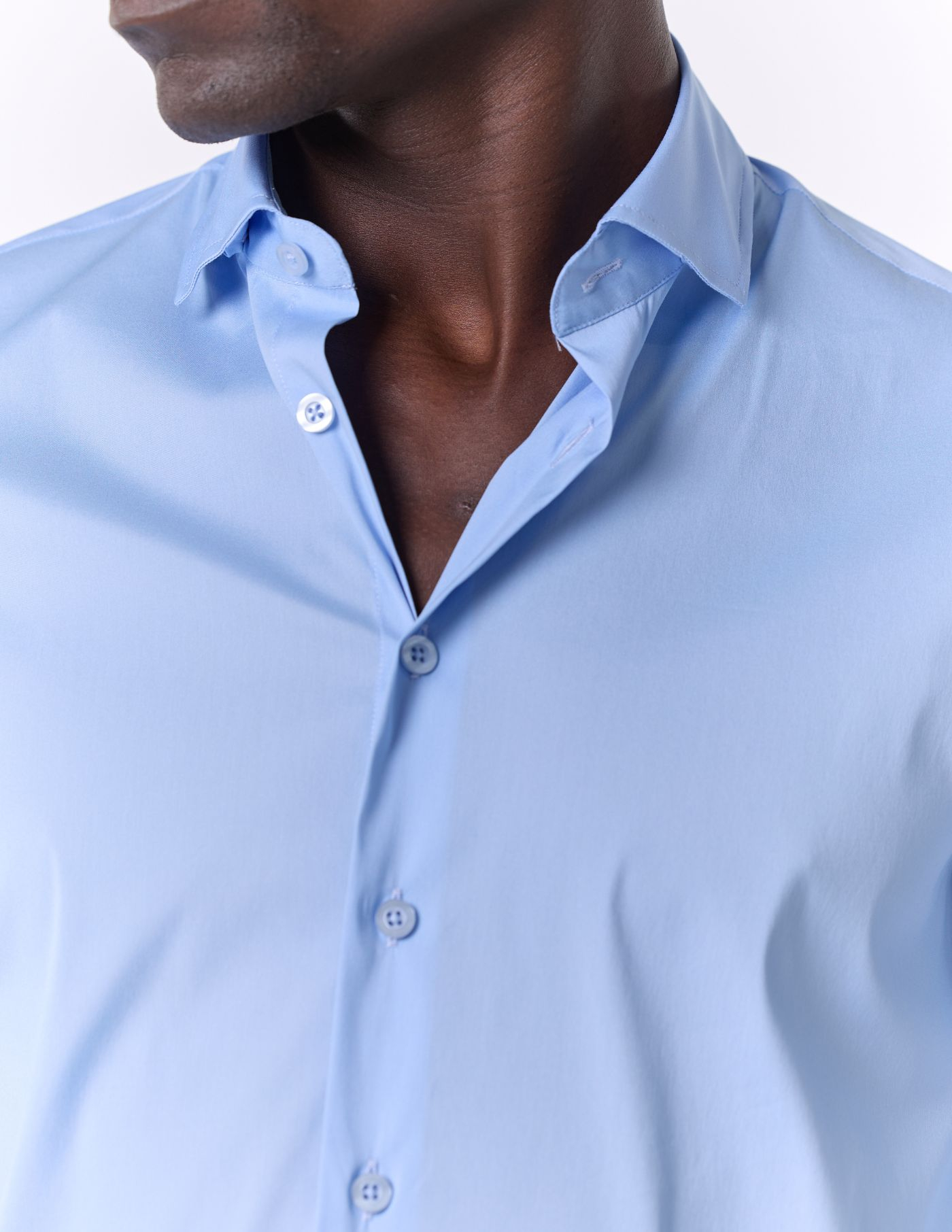 Detalhes: Colarinho italiano / Botão invisível no colarinho / Botões azuis