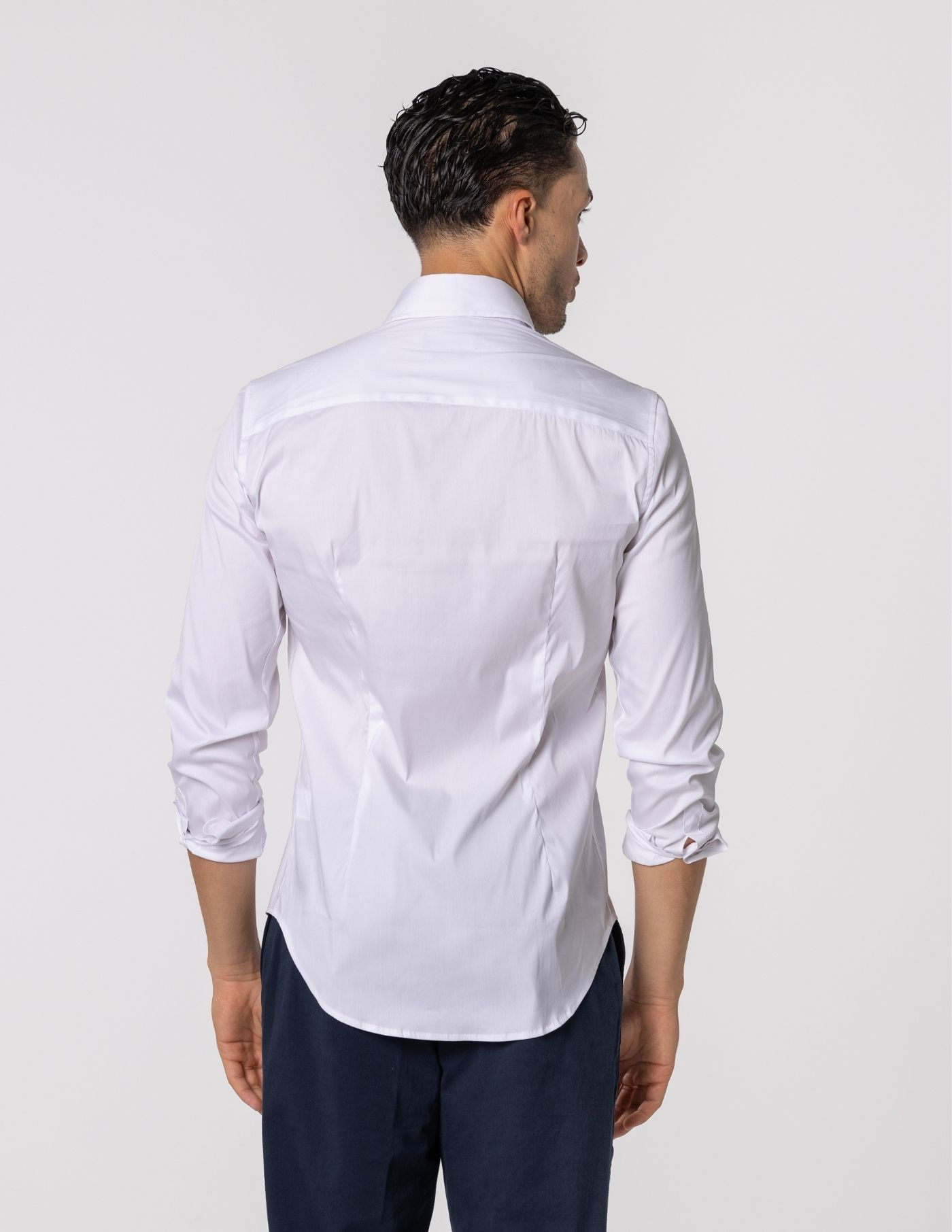 Detalhes: Colarinho italiano / Botão invisível no colarinho / Botões brancos