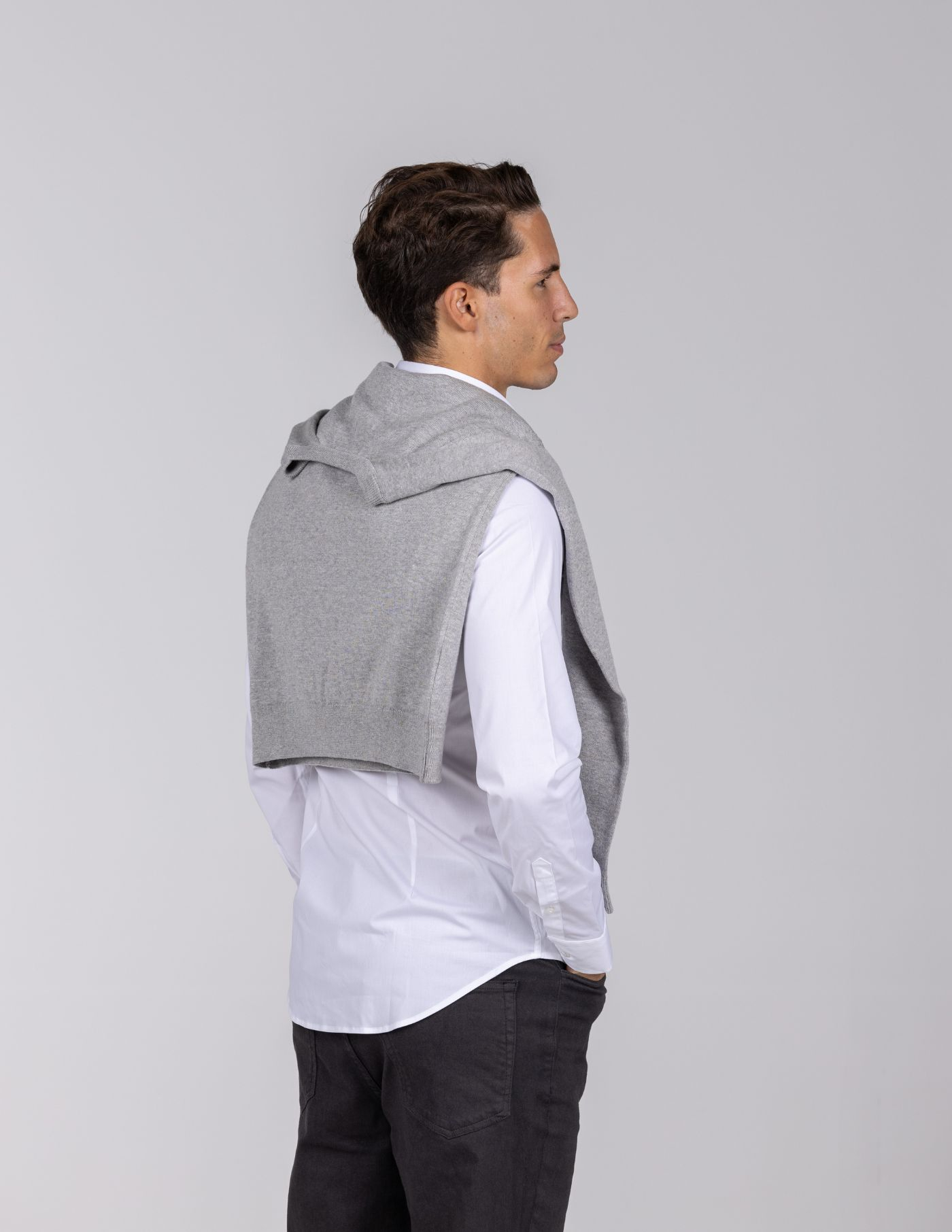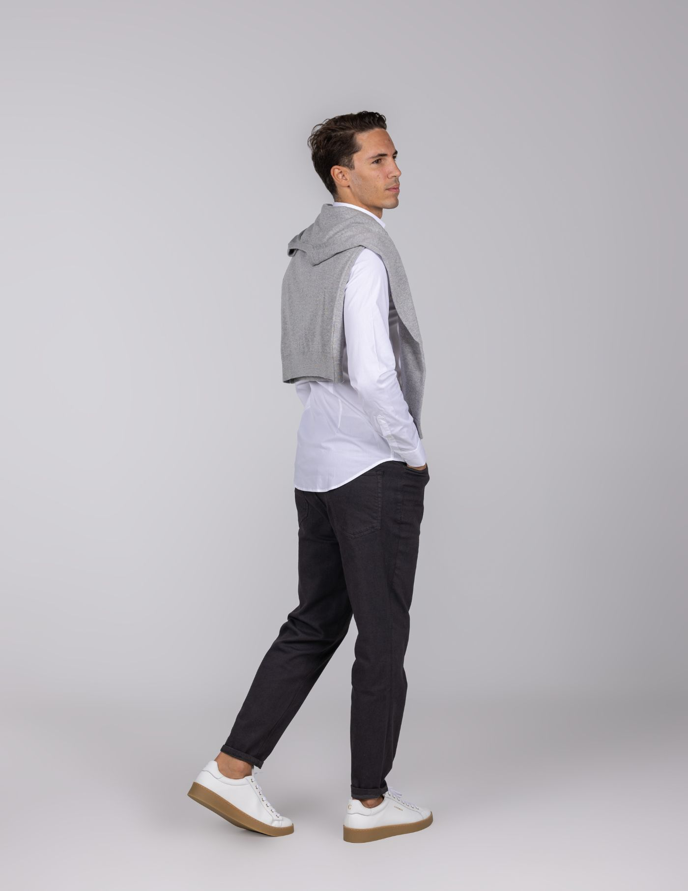 Detalhes: Colarinho italiano / Botão invisível no colarinho / Botões brancos