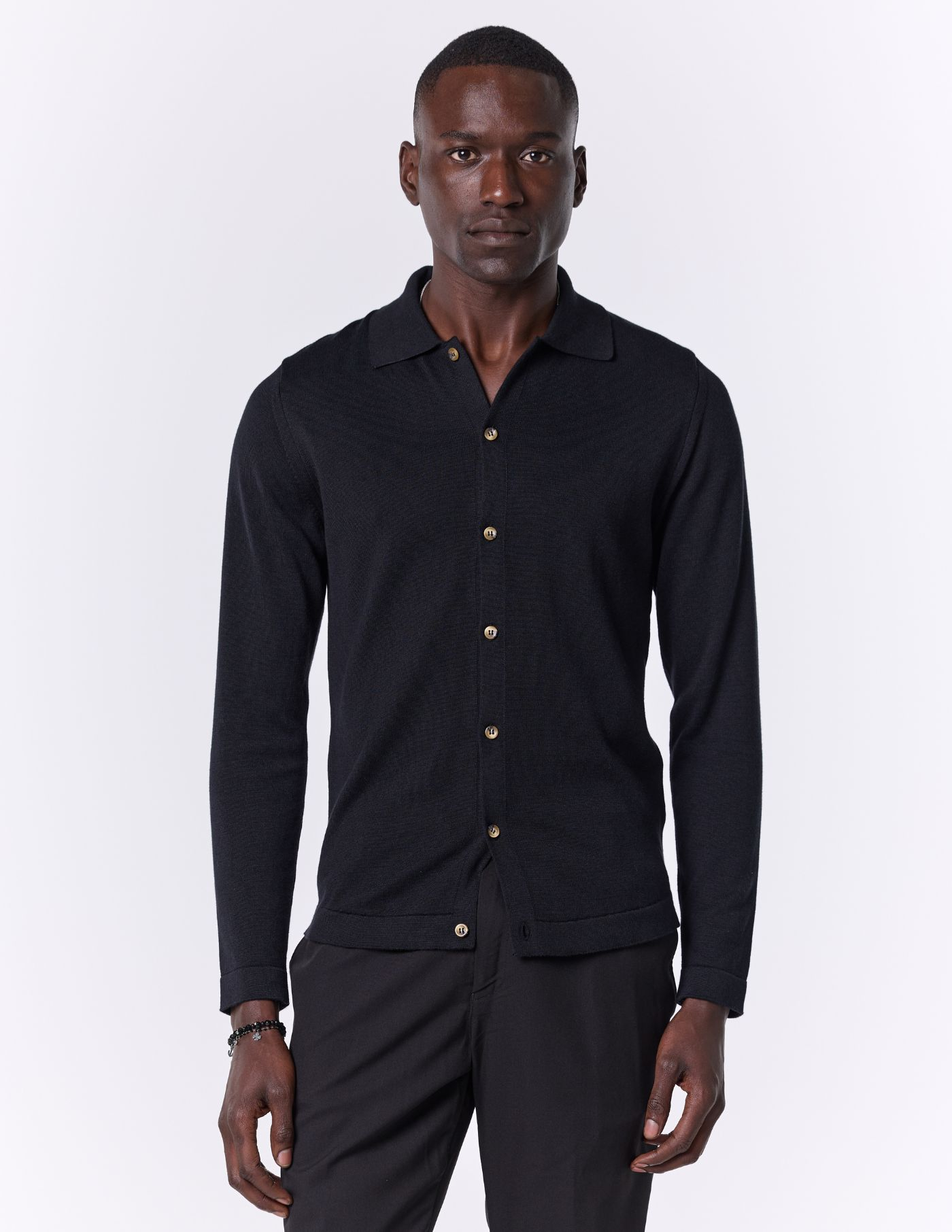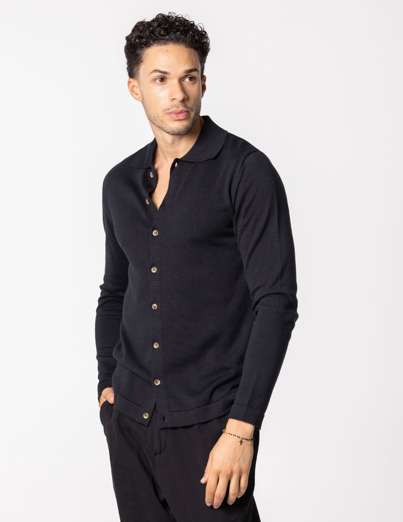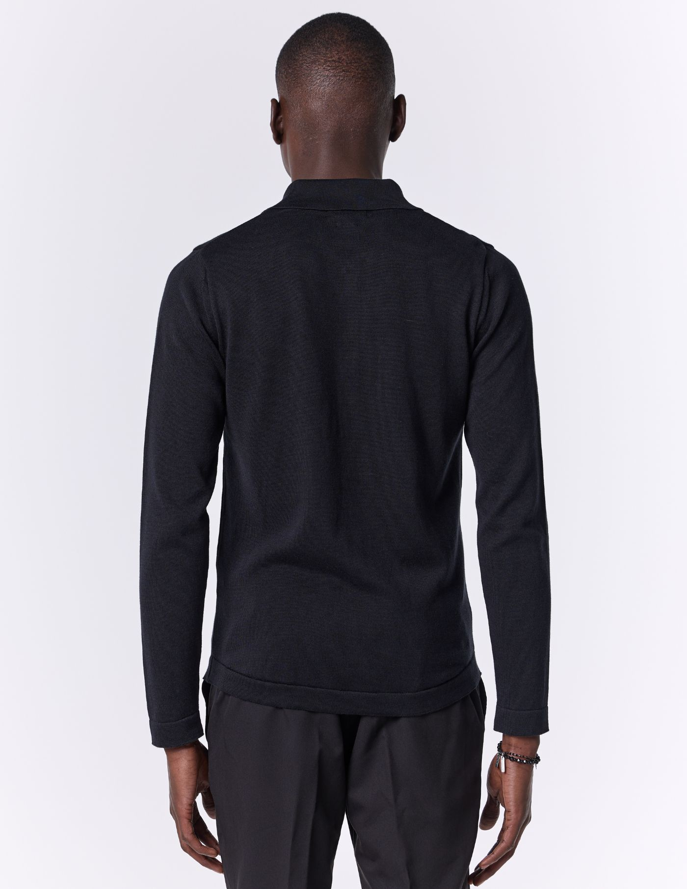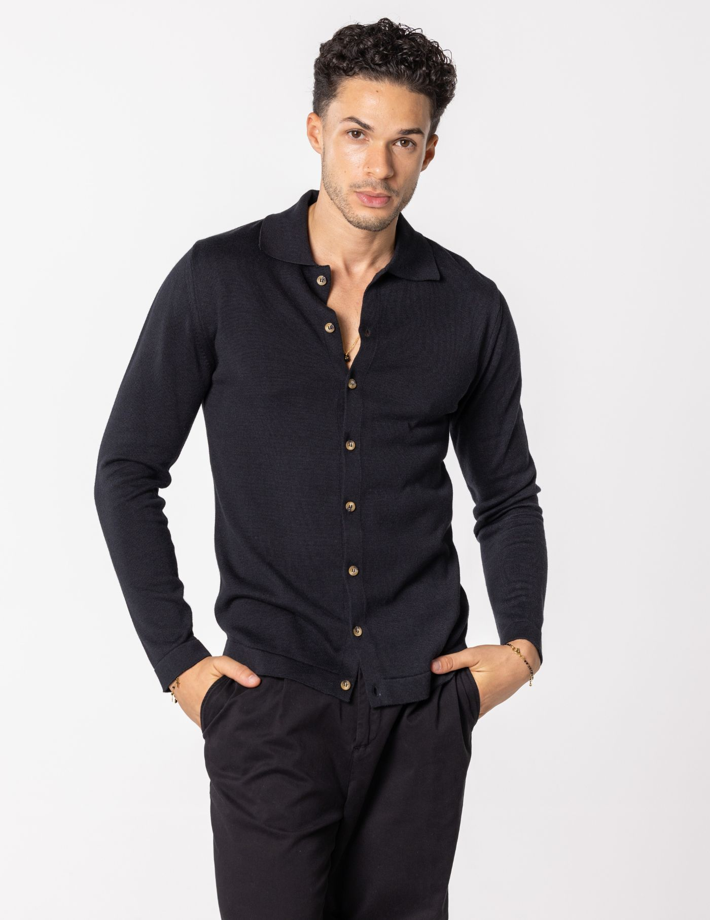 Ideal para looks casuais bem como mais refinados, este camiseiro é uma escolha versátil para o seu guarda-roupa. O nosso modelo tem 1,85 m de altura, pesa 78 quilos e usa um tamanho M. Uma peça essencial que traz elegância e aconchego para os teus dias.