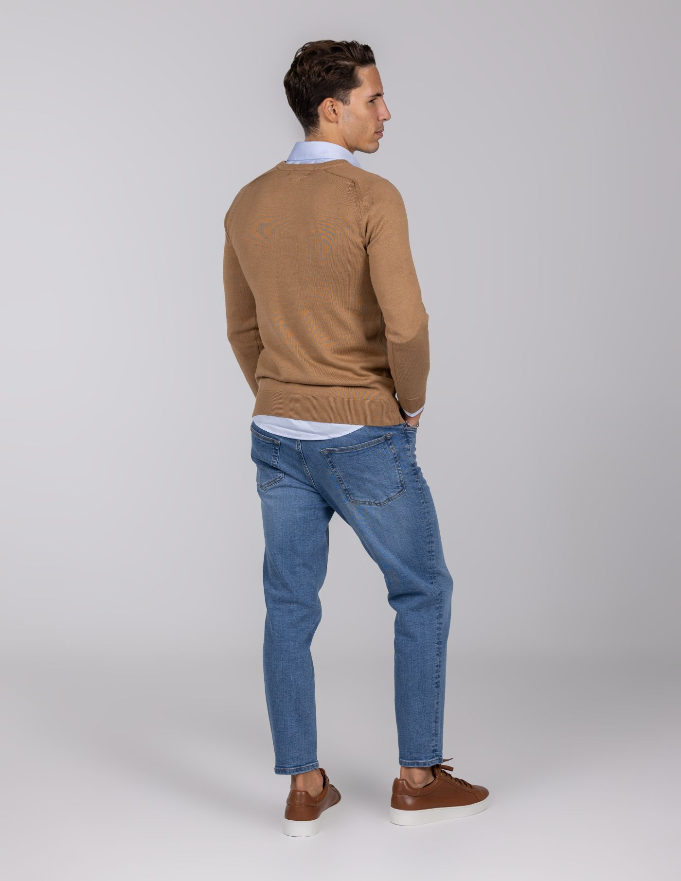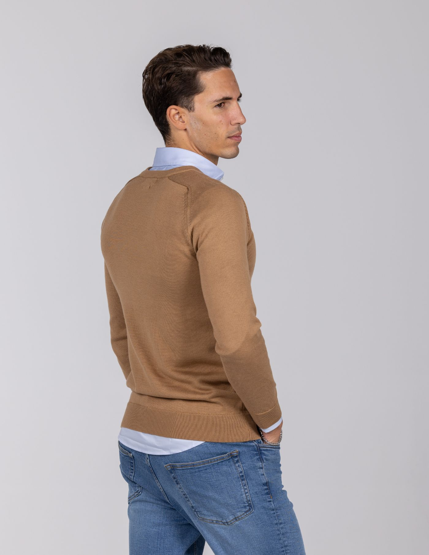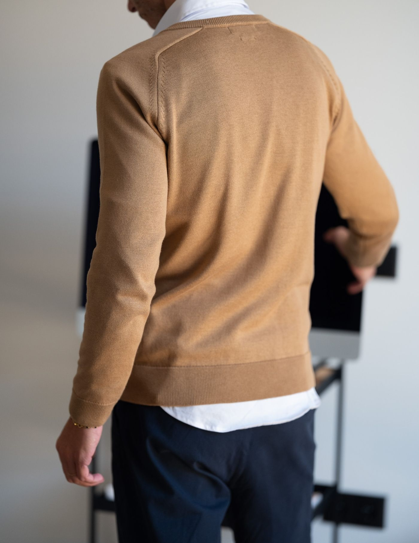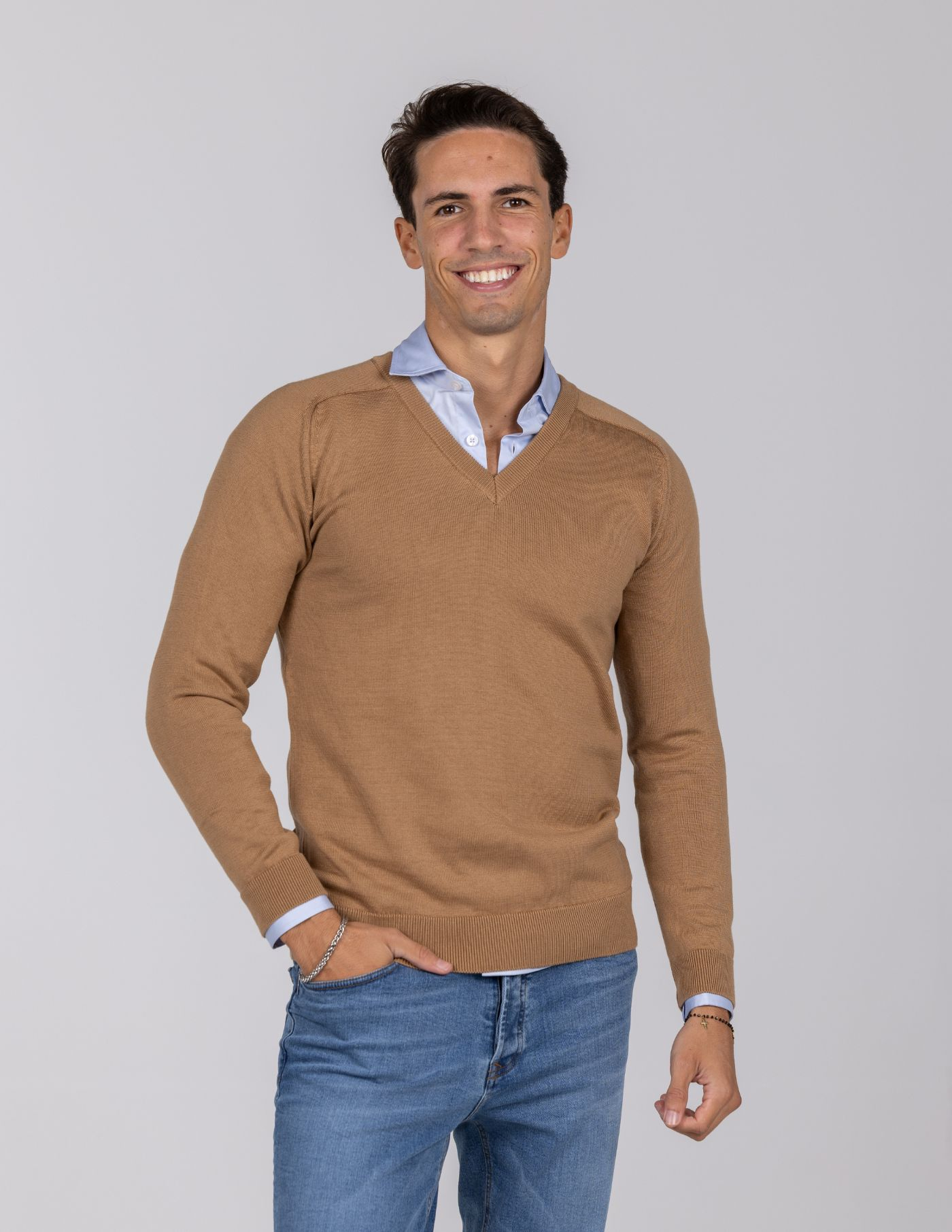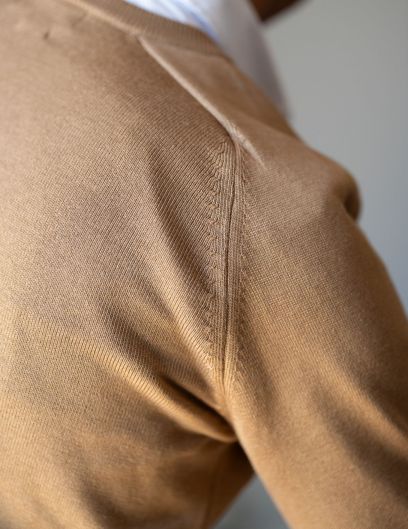 Camisola de malha com decote em v, confecionada 67% de Liocel e 33% de algodão, garantindo um toque aconchegante e liberdade de movimentos. Ideal para manter o conforto durante os dias mais frios e combina perfeitamente com uma camisa. Finalizada com acabamento canelado (gola, punho e base) e manga raglan.