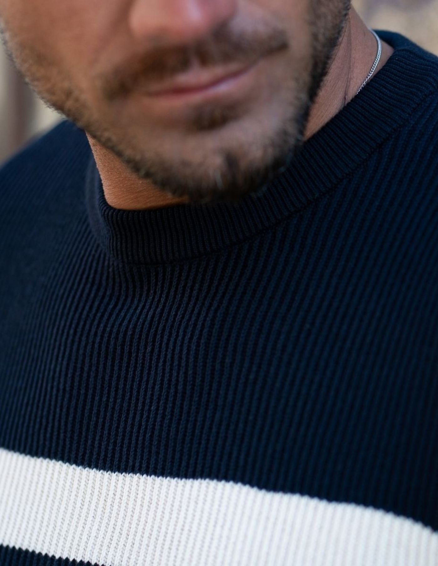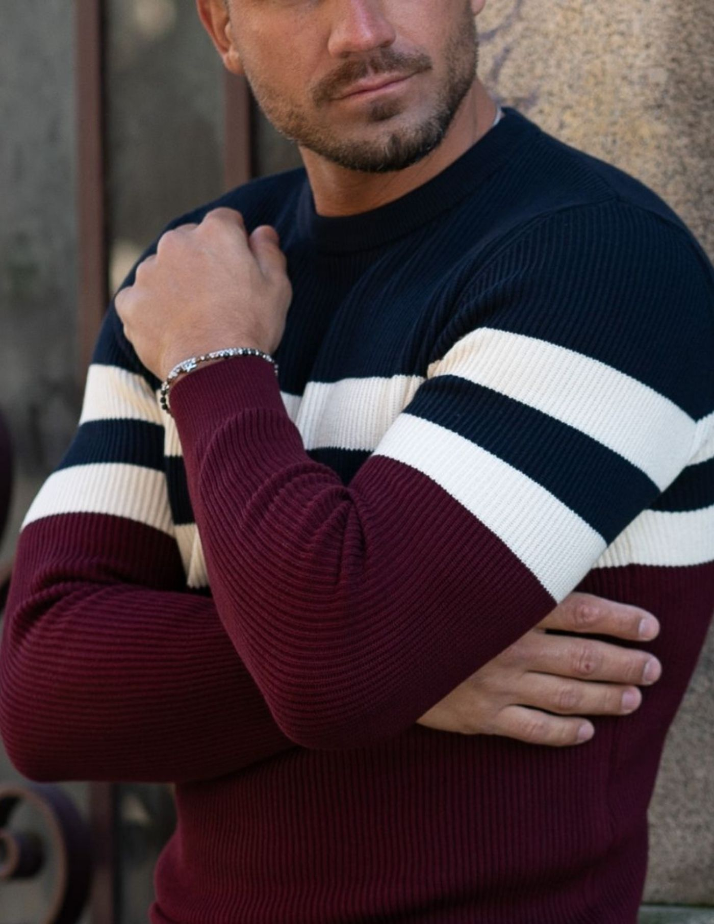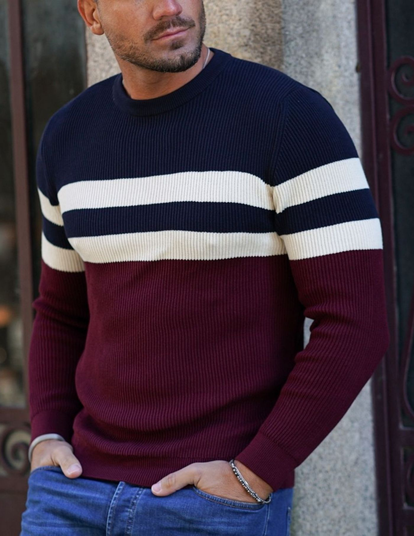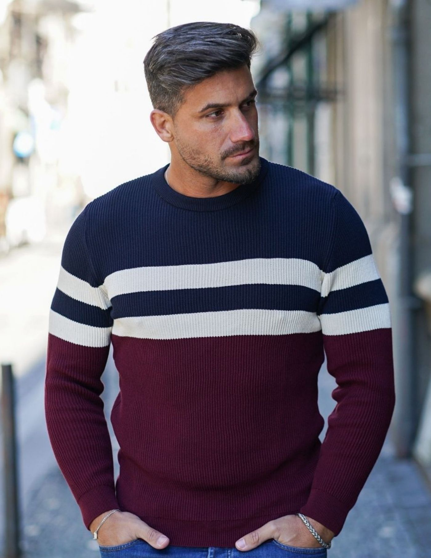 A peça fundamental para um look casual e confortável. Camisola de tricot, com combinação de azul, branco e bordeaux, confecionada 100% em algodão, garantindo um toque aconchegante, suavidade e conforto. Tem acabamento canelado na gola, punho e cintura. É a opção ideal para os dias mais frios e de fácil conjugação com um sobretudo ou casaco de penas.