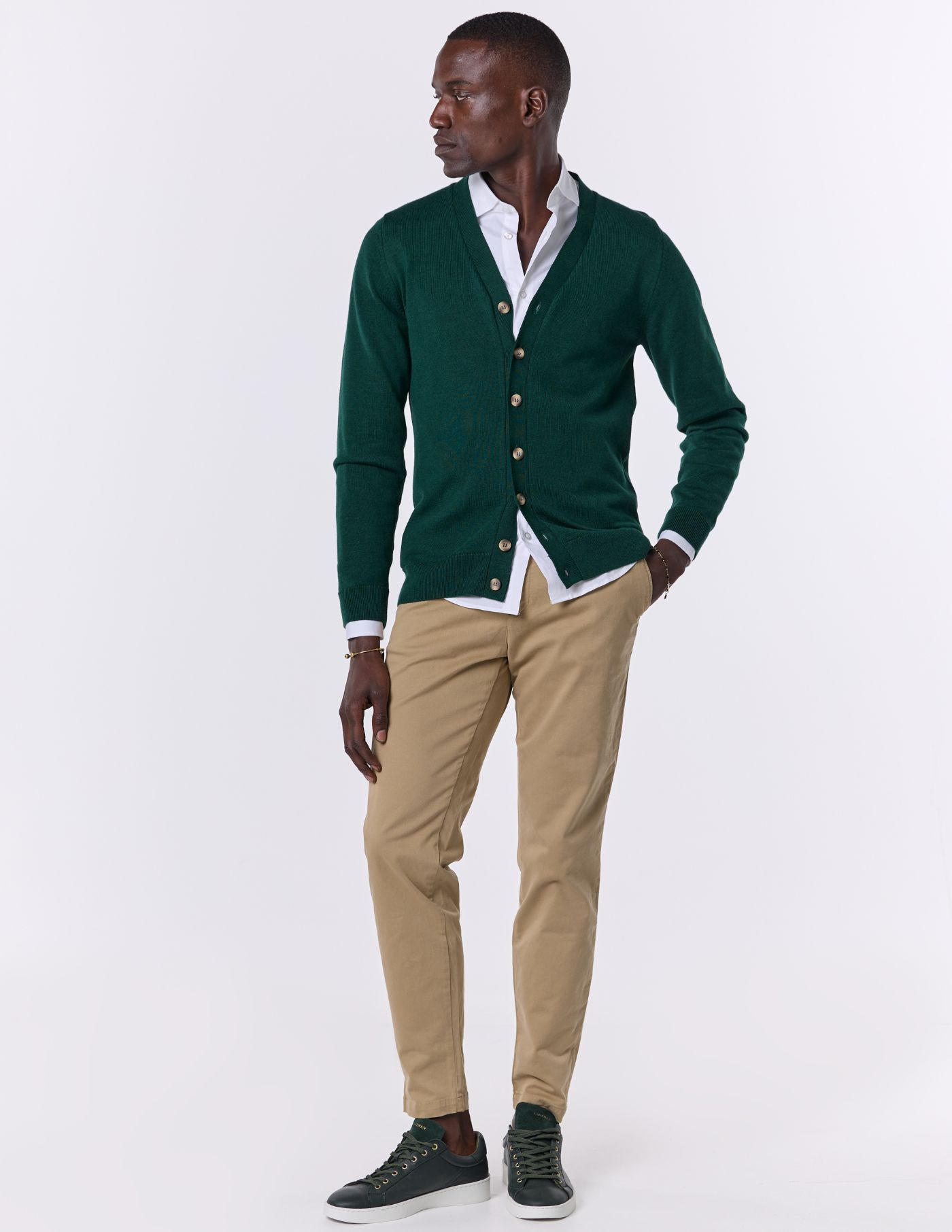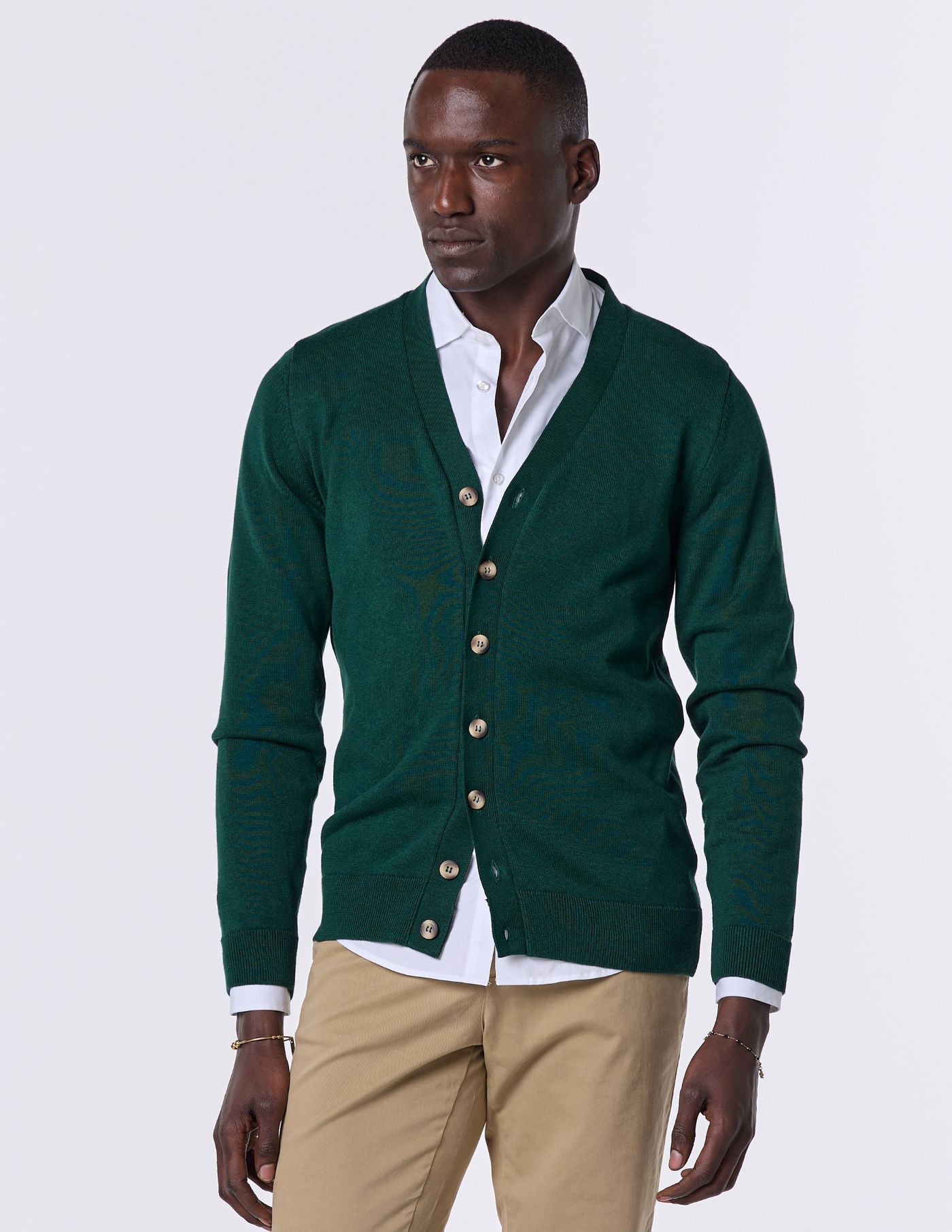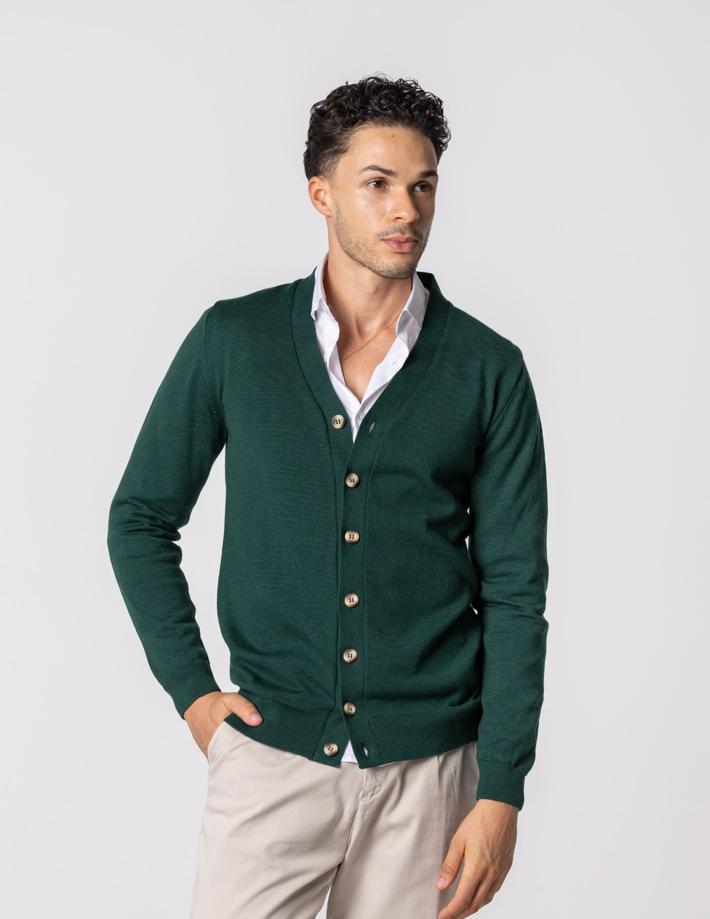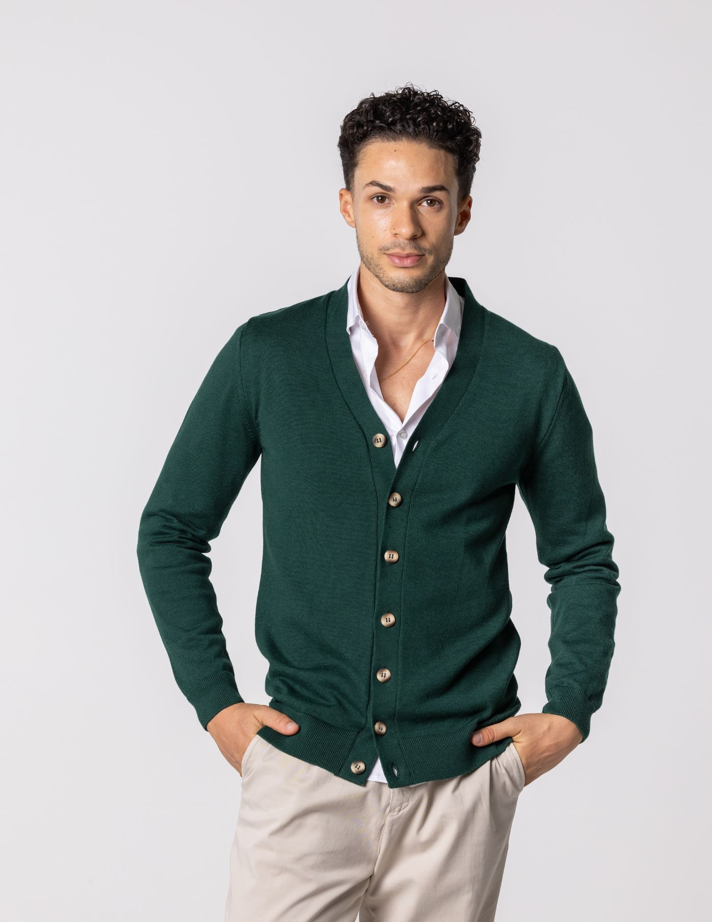Este cardigan de botões é a opção perfeita para quem procura conforto e sofisticação. Confeccionado em tecido de alta qualidade, oferece um toque suave e aconchegante. O seu design clássico, com botões, torna-o uma peça versátil e fácil de combinar. Ideal para completar looks descontraídos ou mais arrumados, este cardigan é um essencial no teu guarda-roupa. Com um corte elegante e atemporal, é a escolha certa para adicionar um toque de distinção a qualquer outfit.