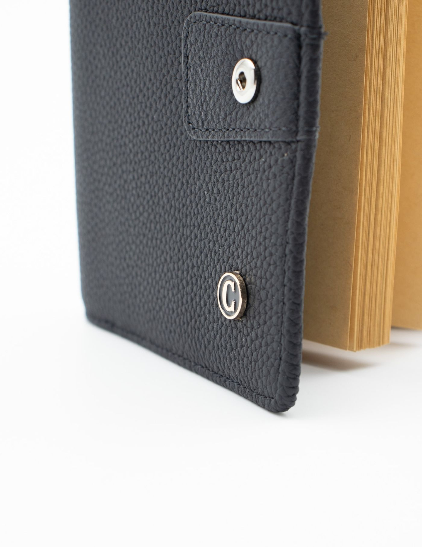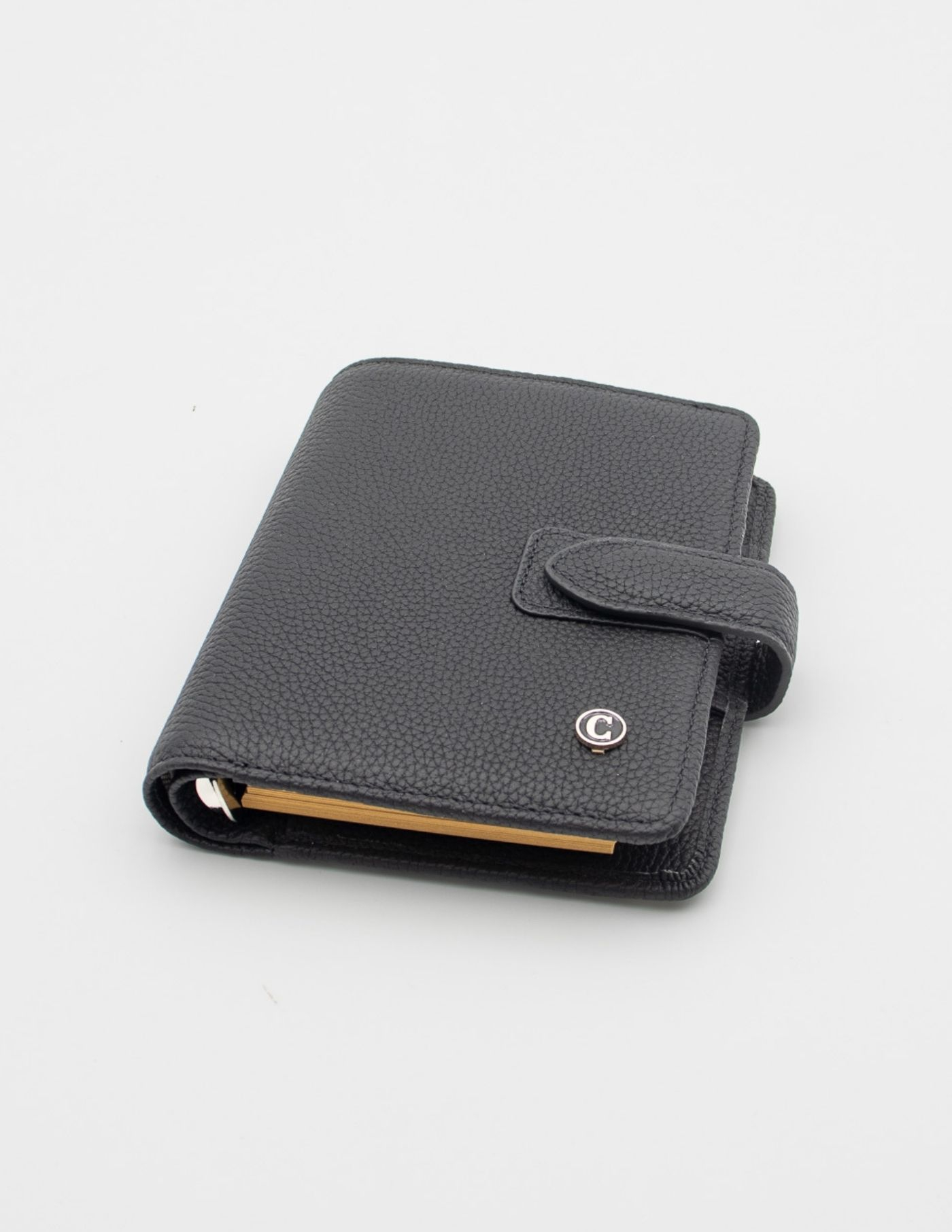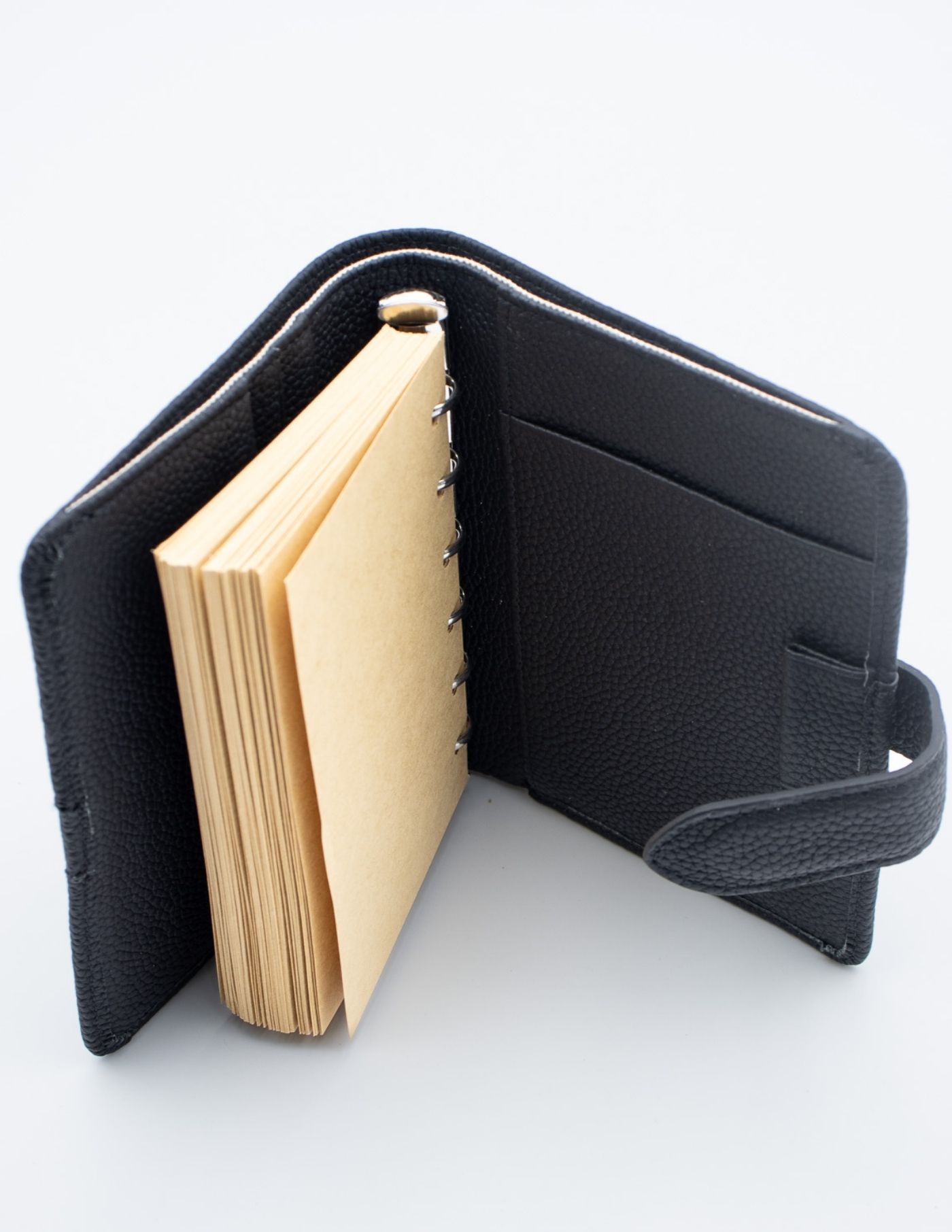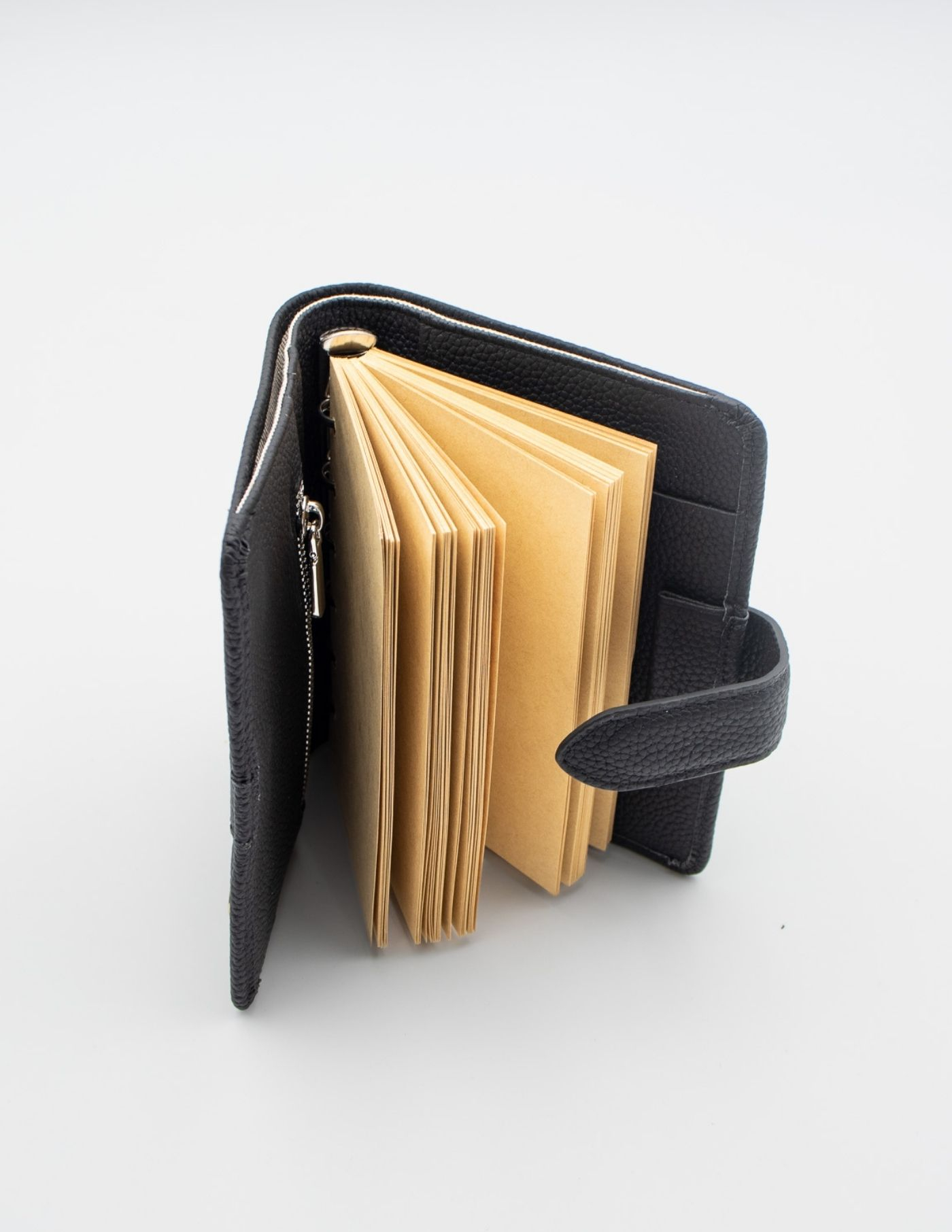 Carteira com bloco de notas preta, em pele, com design minimalista e aspeto vintage, ideal para transportar cartões, notas e documentos.