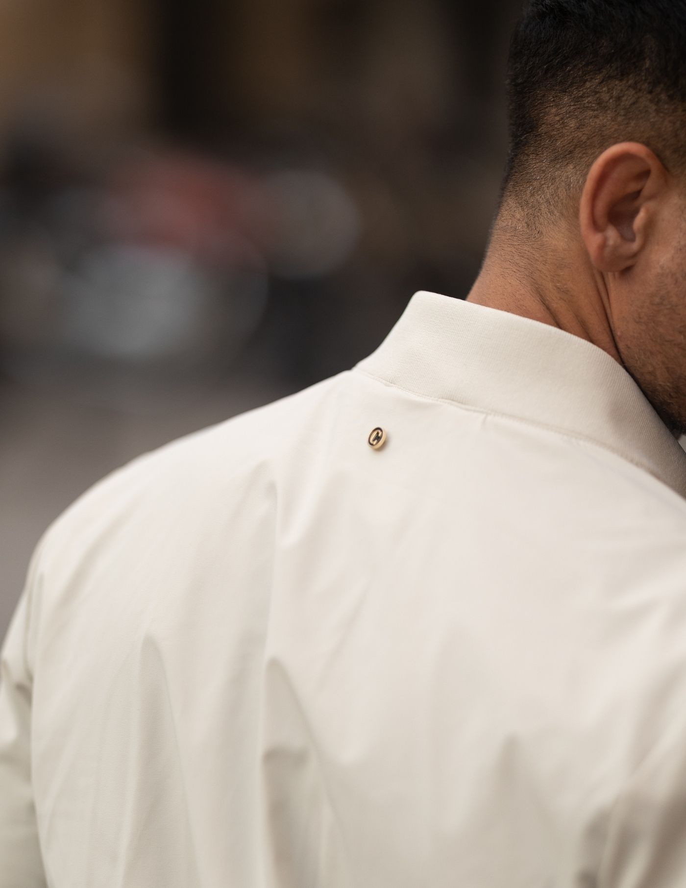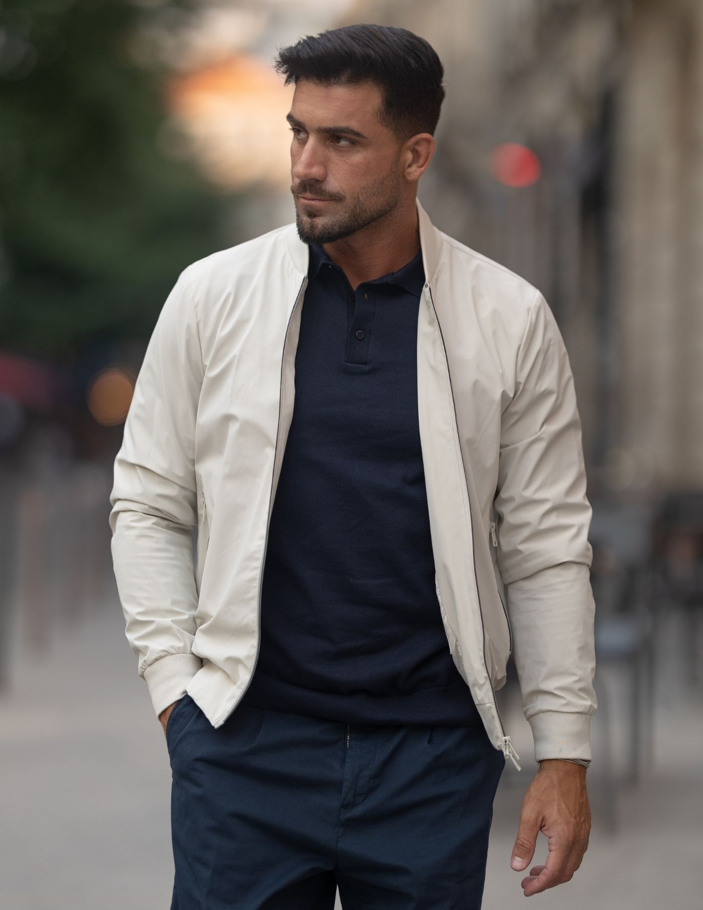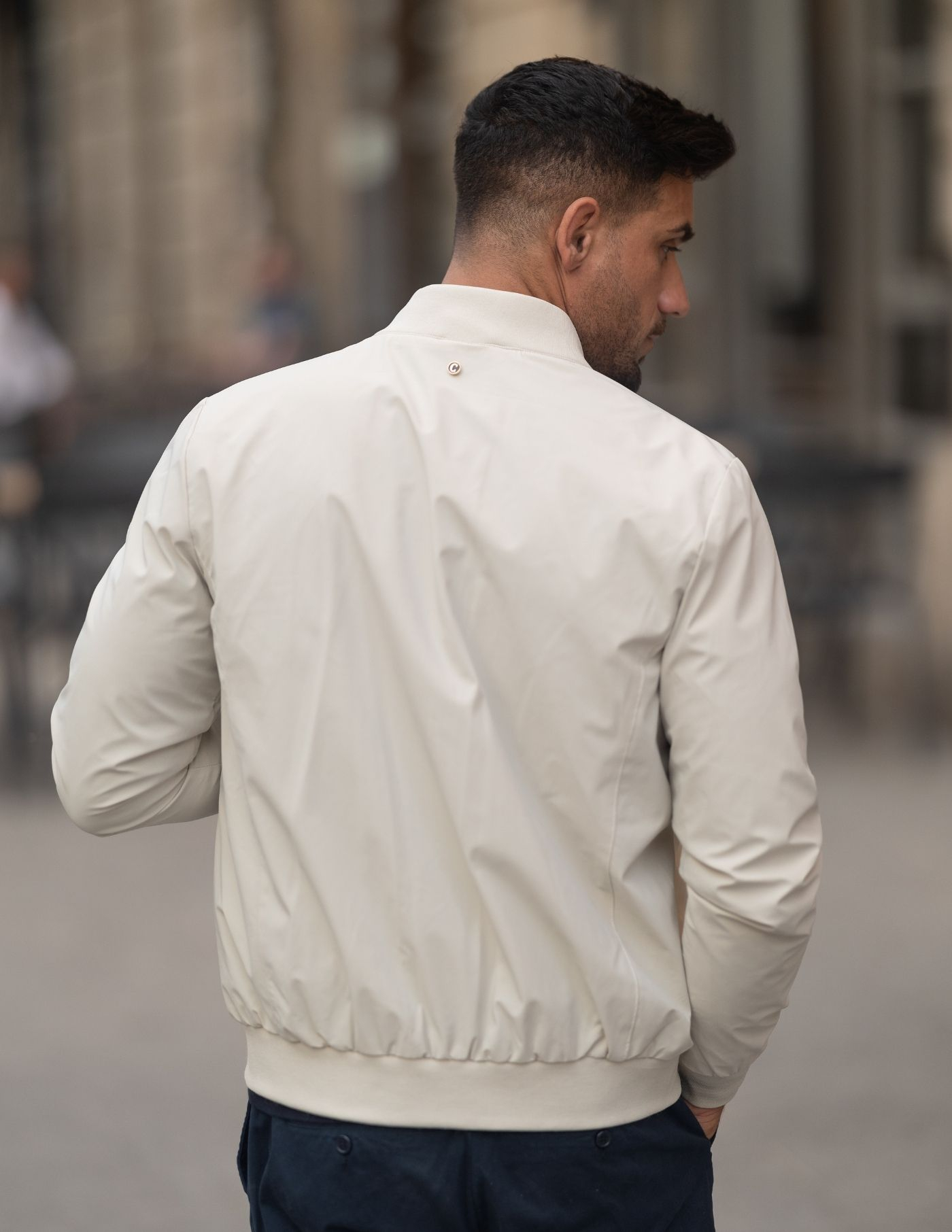 Casaco estilo bomber, em tecido técnico de cor cru.