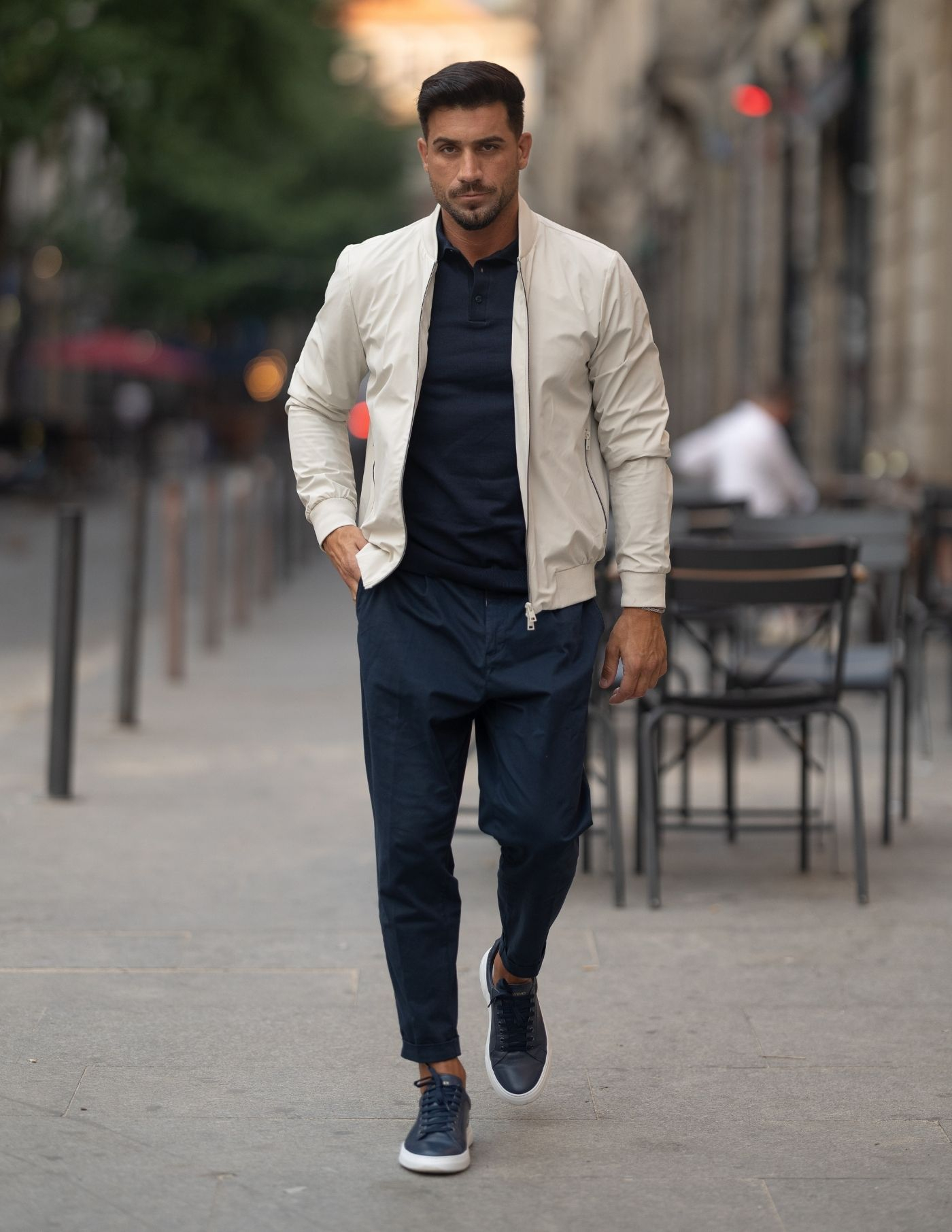Ideal para acrescentar uma camada de conforto aos looks de meia estação. Corte slim fit e punho e bainha elásticos. Finalizado com fecho frontal e dois bolsos laterais.