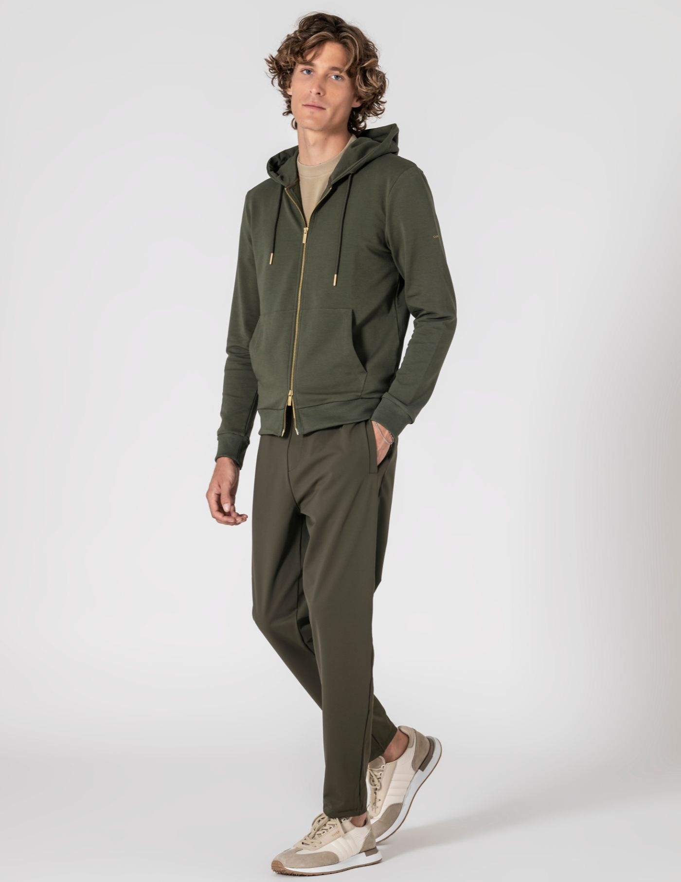 Casaco de felpa com capuz e fecho duplo cursor, pensado para conforto diário e mobilidade. A malha em 90% algodão e 10% elastano oferece toque suave, respirabilidade e elasticidade, mantendo a forma uso após uso. Linhas limpas, bolsos frontais e acabamentos canelados em punhos e bainha completam uma peça versátil.