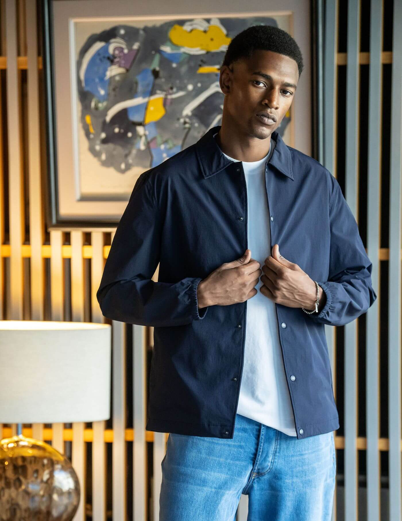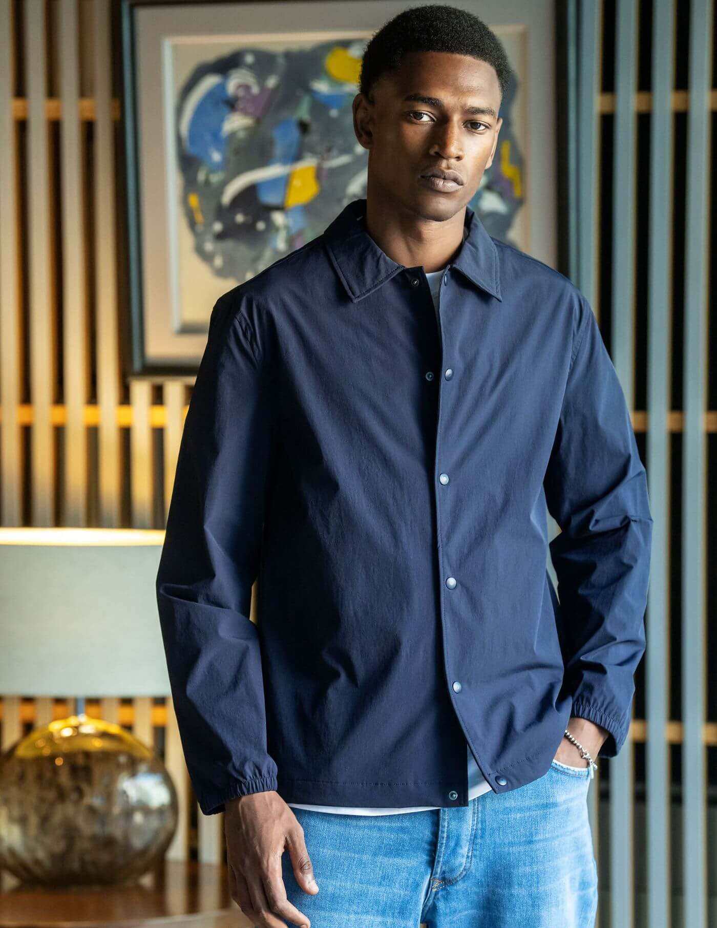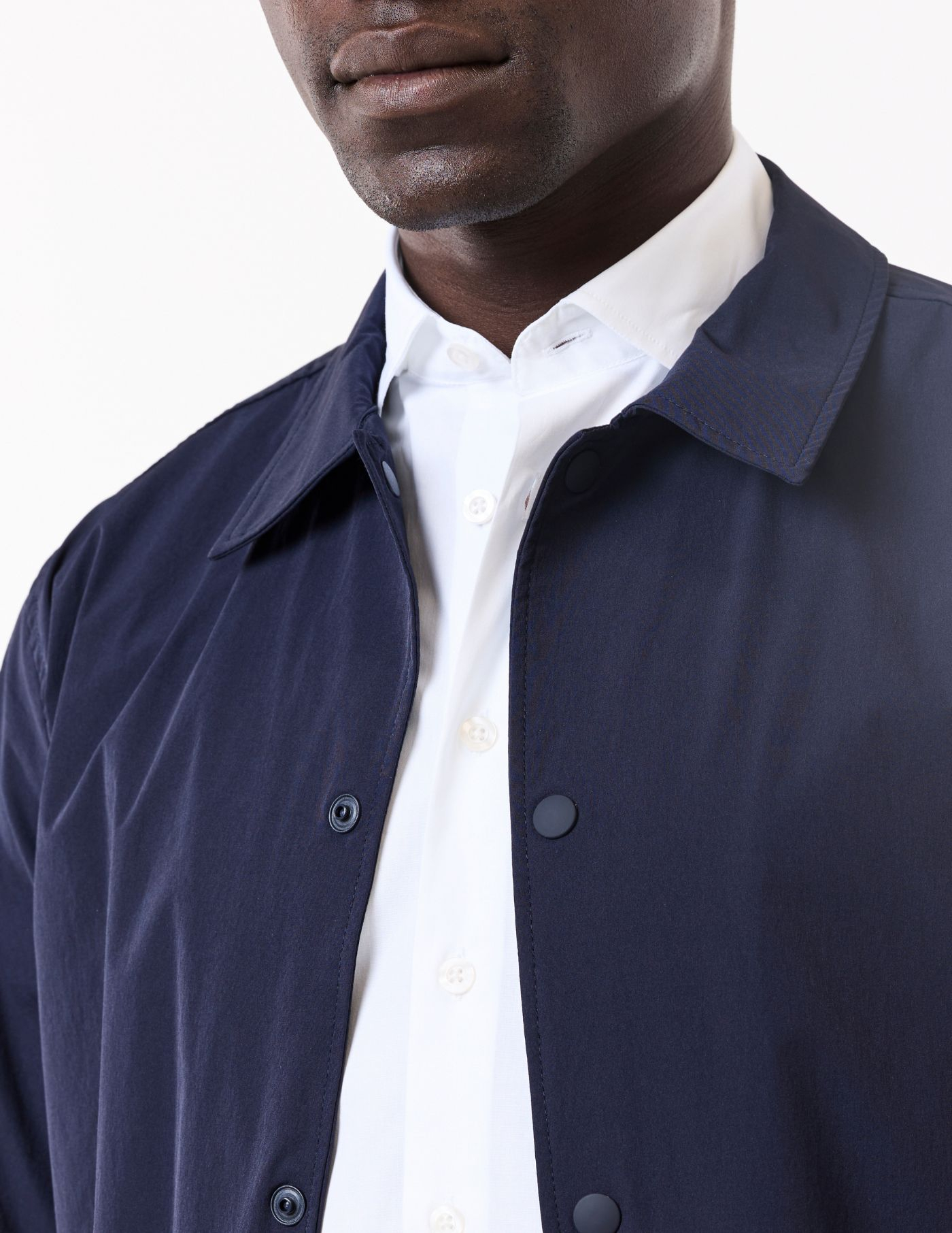 Apresenta uma gola camiseiro clássica, que agrega um toque de elegância. O fecho frontal é feito com botões tipo mola que proporciona um acabamento sofisticado e um visual clean. Possui dois bolsos laterais para praticidade.