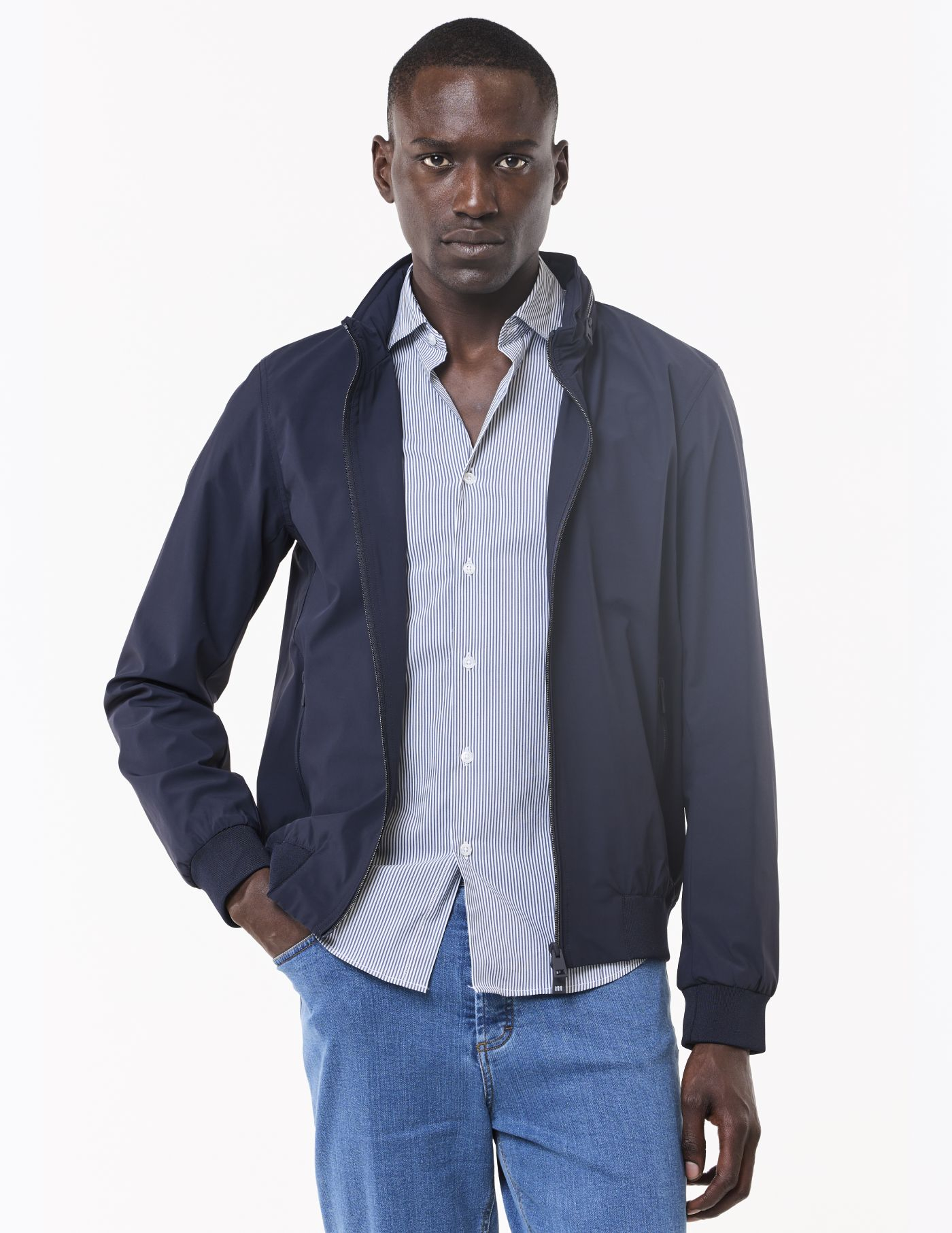 Casaco estilo parka, em tecido técnico de cor azul.