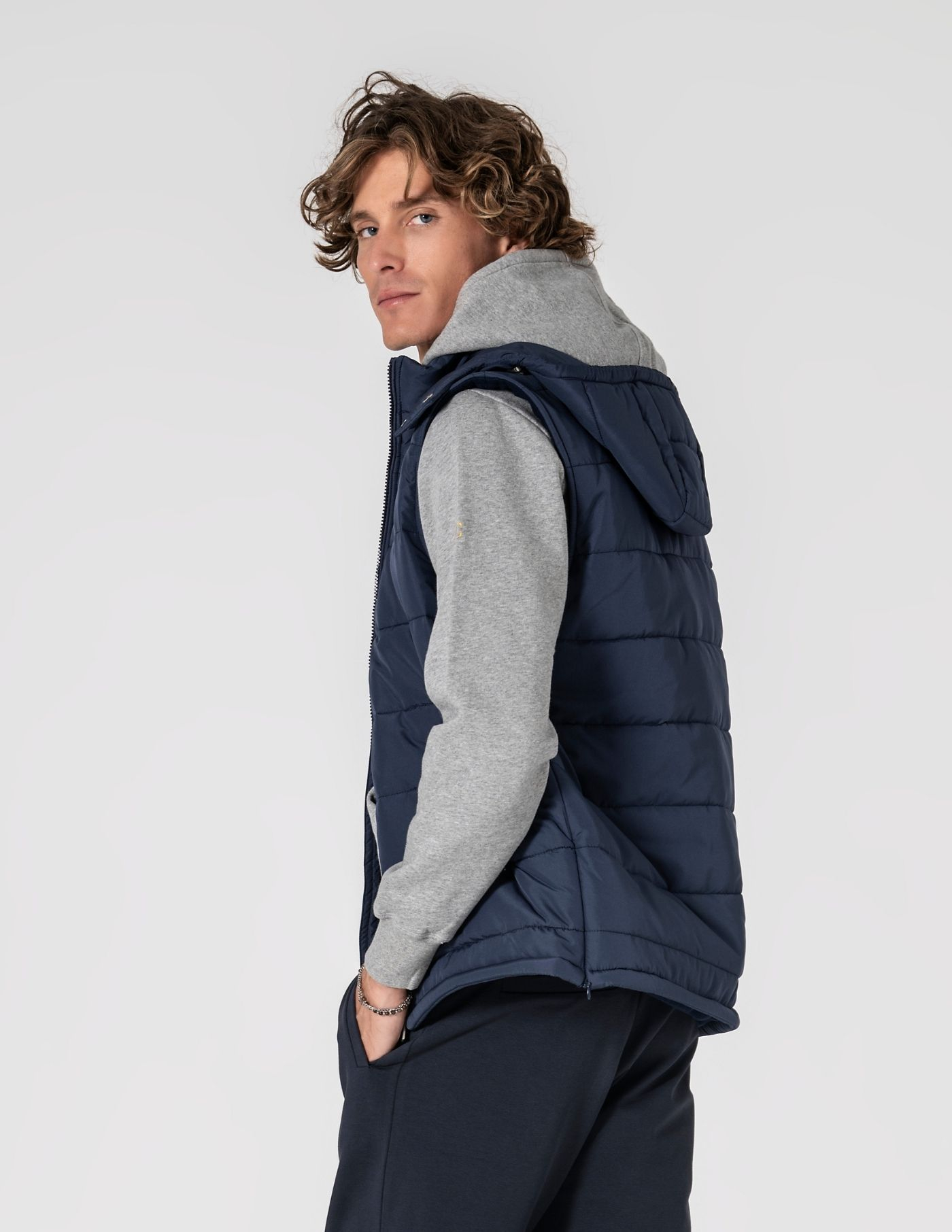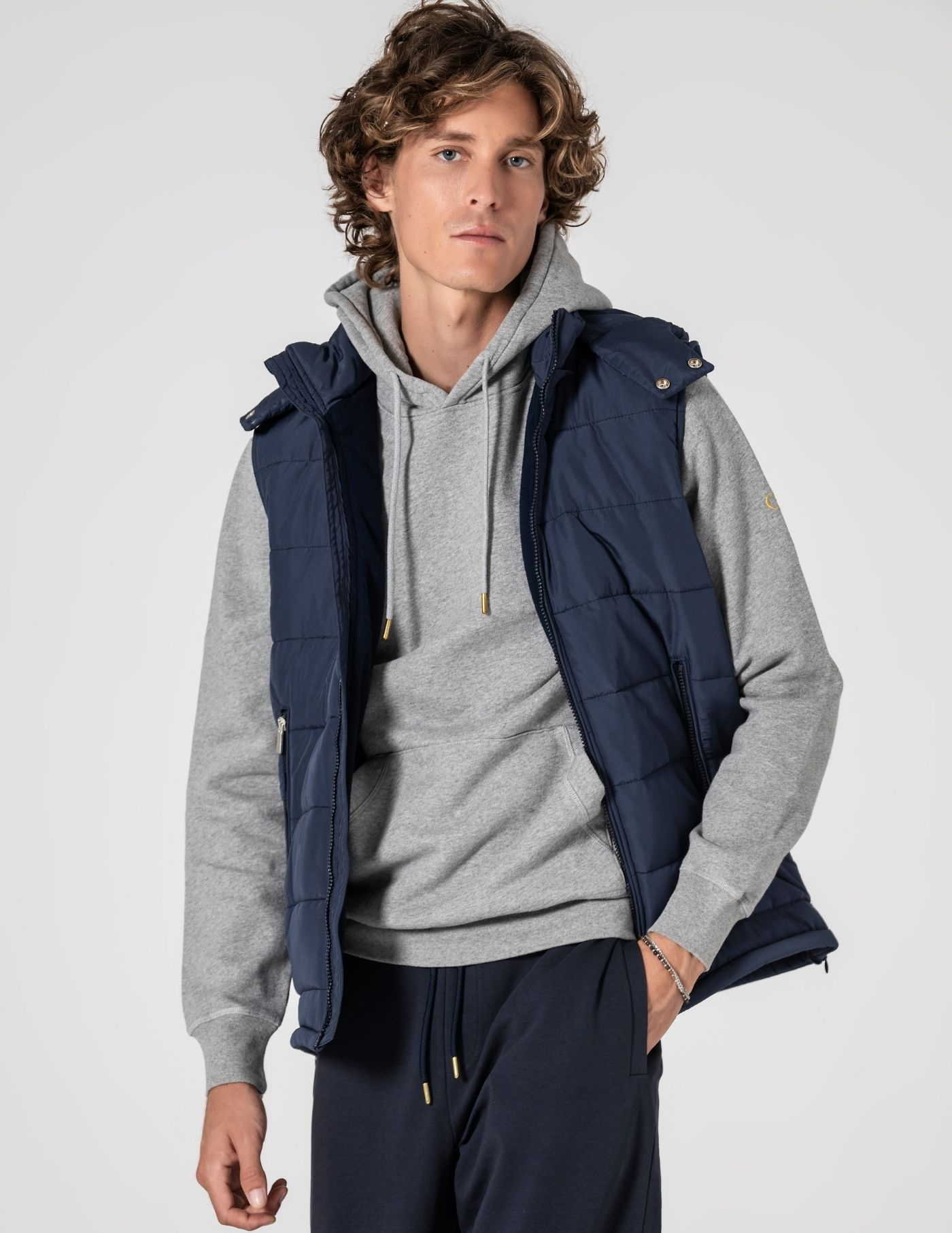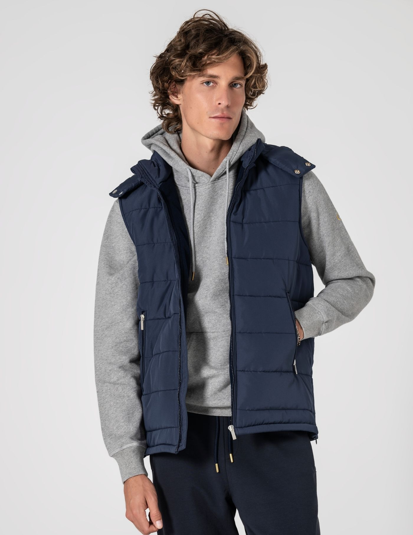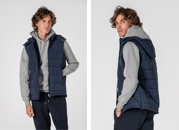 Colete acolchoado leve com forro cardado, pensado para oferecer calor suave e conforto ao longo do dia. Linhas limpas e estrutura flexível garantem liberdade de movimentos. Conta com fecho frontal, bolsos laterais com fecho e aberturas laterais com zip discreto. Uma peça versátil que eleva coordenados com camisa, malha fina ou sweat, mantendo um aspeto cuidado em qualquer contexto.