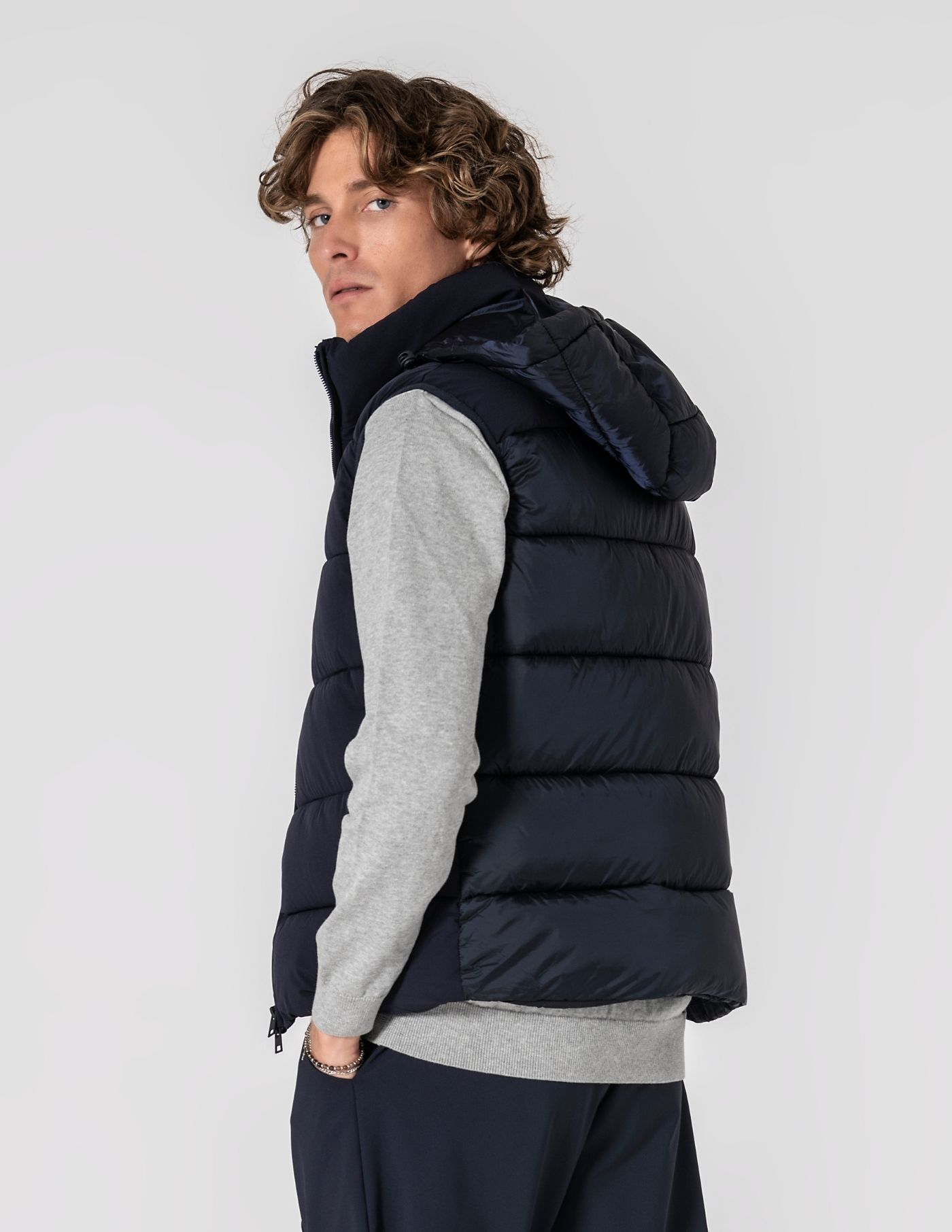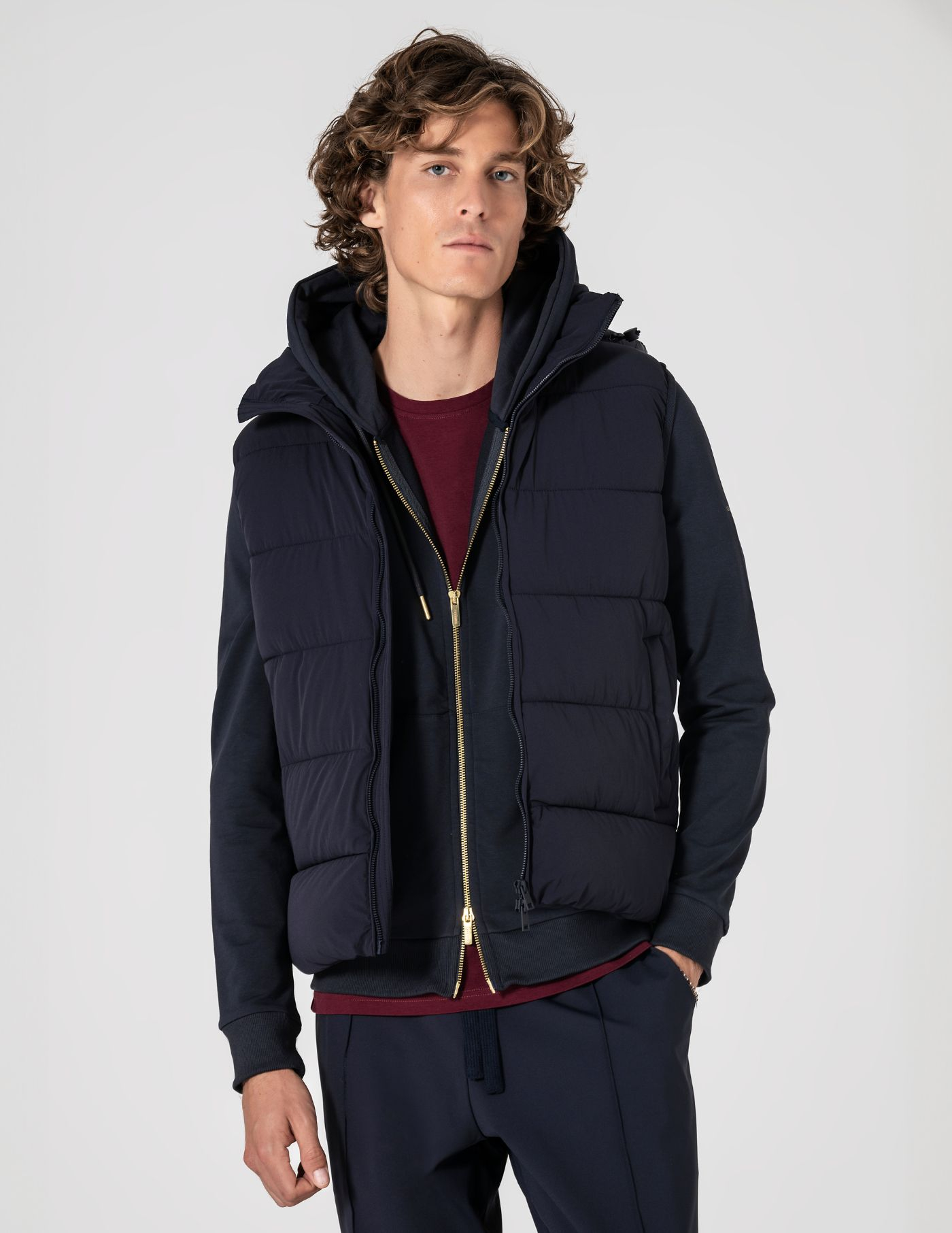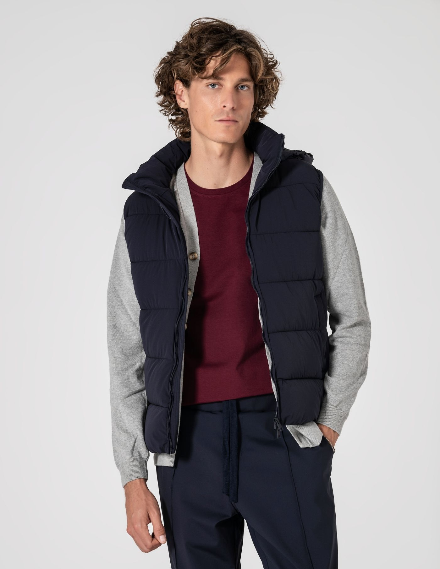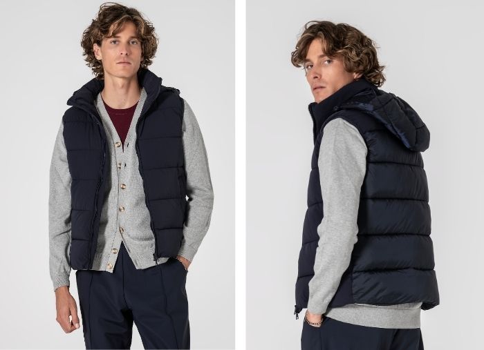Colete termorregulador acolchoado de design leve e funcional, criado para equilibrar conforto térmico e mobilidade. Construído com tecidos técnicos inovadores: exterior em nylon com elastano de alta performance, que acompanha o movimento; forro e enchimento em poliéster asseguram termorregulação eficaz. Tecido respirável que estabiliza a temperatura ao longo do dia. Silhueta limpa, versátil e fácil de combinar com camisas, malhas finas ou sweats.