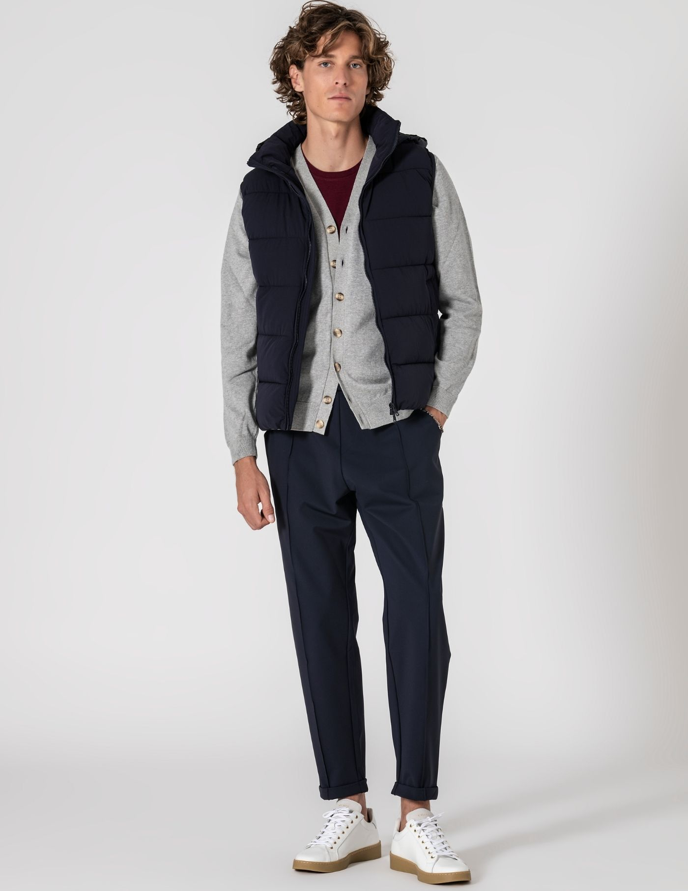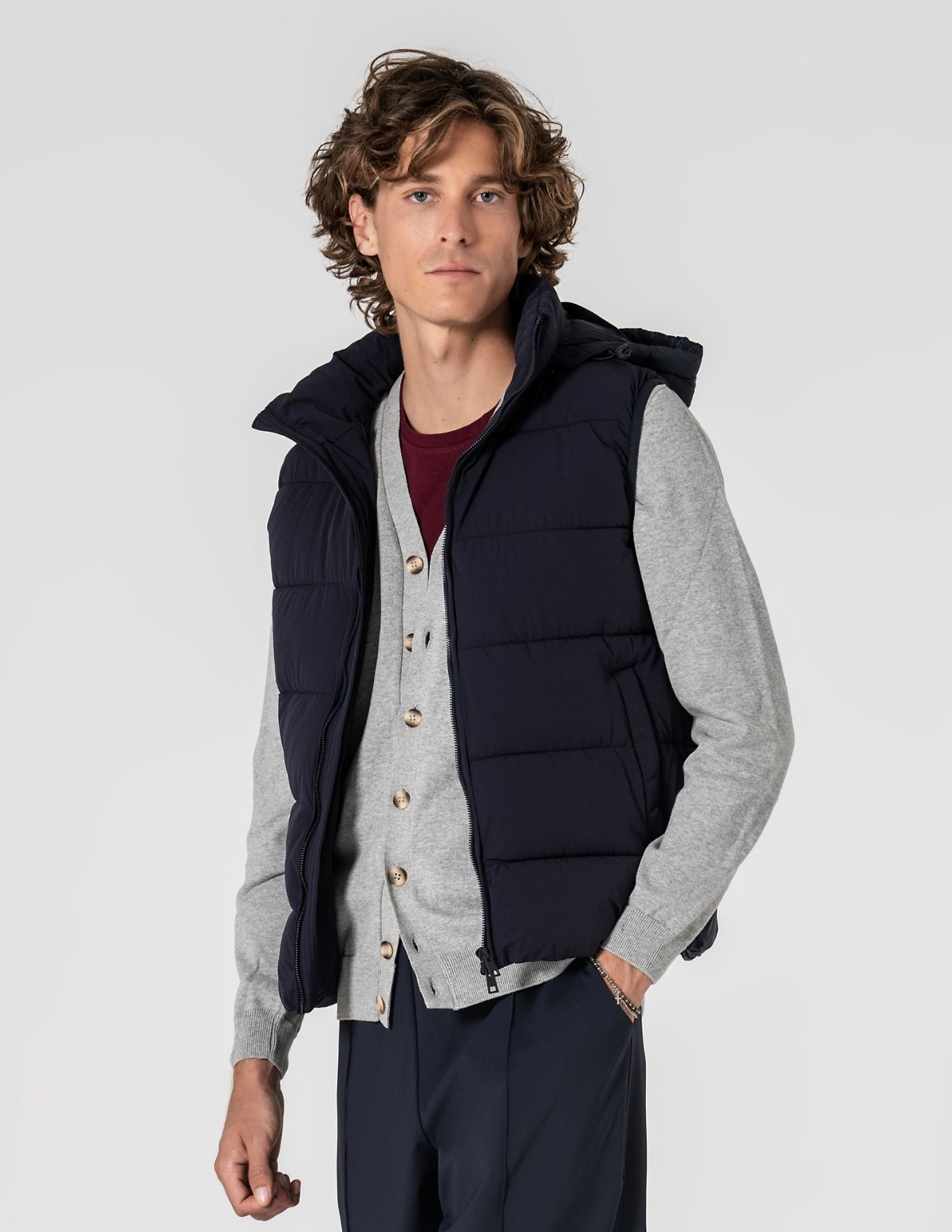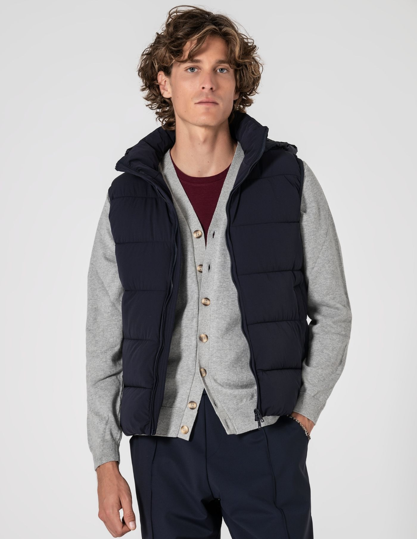 Colete termorregulador acolchoado de design leve e funcional, criado para equilibrar conforto térmico e mobilidade. Construído com tecidos técnicos inovadores: exterior em nylon com elastano de alta performance, que acompanha o movimento; forro e enchimento em poliéster asseguram termorregulação eficaz. Tecido respirável que estabiliza a temperatura ao longo do dia. Silhueta limpa, versátil e fácil de combinar com camisas, malhas finas ou sweats.