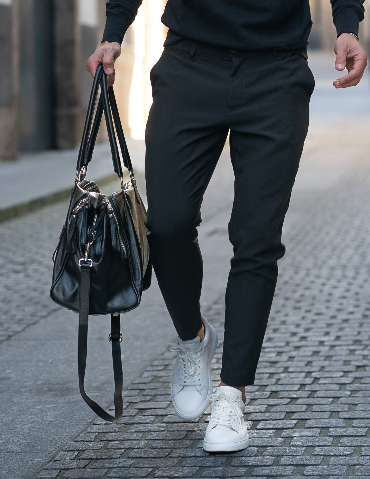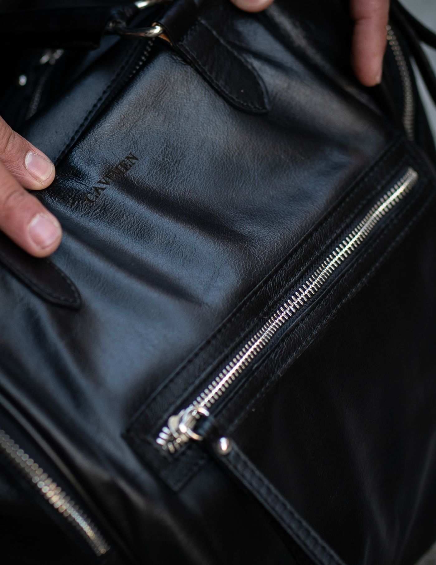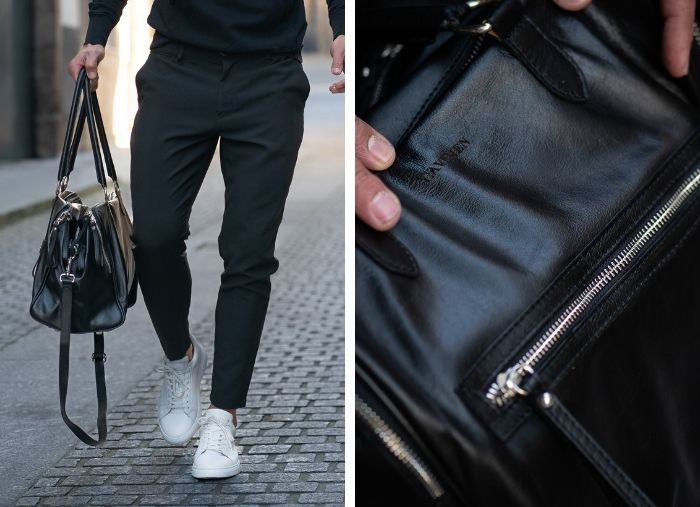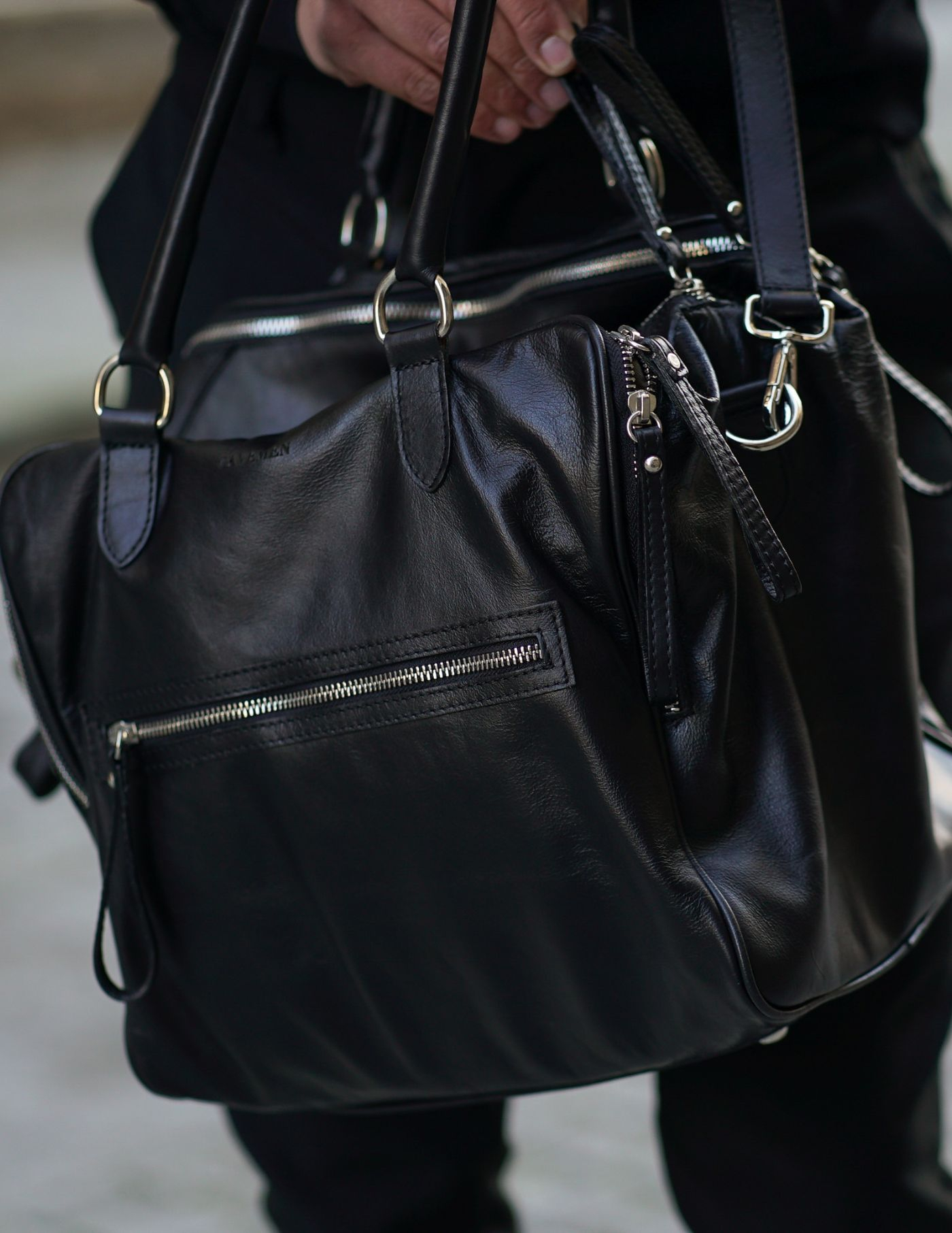 Saco de viagem preto em pele com fecho prateado. Prático e versátil, é ideal para um fim de semana ou até mesmo para uso quotidiano com os objectos do dia a dia.