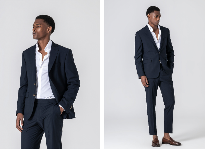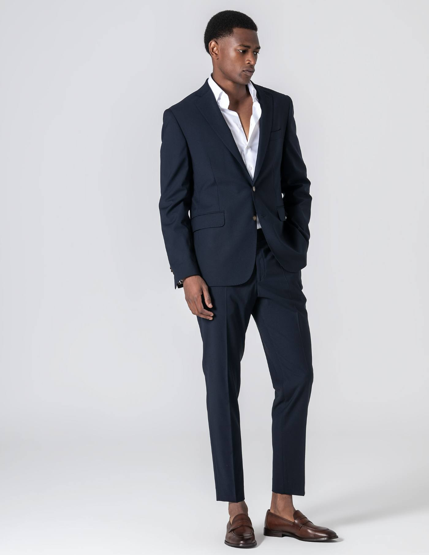 Fato de duas peças (blazer e calça). Uma peça indispensável em qualquer guarda-roupa, seja para uma ocasião especial ou para a rotina de trabalho. Este modelo é clássico, com blazer de dois botões com detalhe de costura picotada (pick stitch), e possui um design elegante e moderno. É leve e confortável de usar, e composto por materiais que garantem um aspeto estético irrepreensível e liberdade de movimentos. Finalizado com acabamento non-iron, não sendo necessário passar a ferro para que se mantenha elegante.