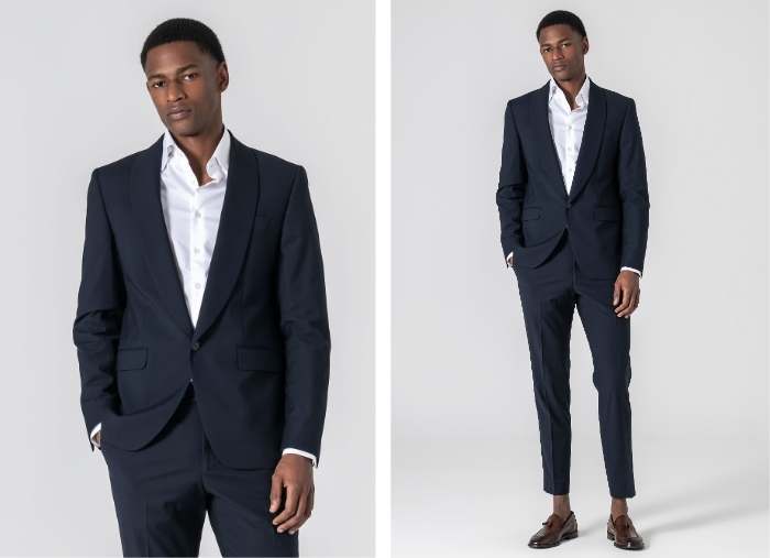 Fato completo de duas peças: blazer e calça, com lapela redonda e botão único, desenhado para ocasiões formais ou eventos especiais.