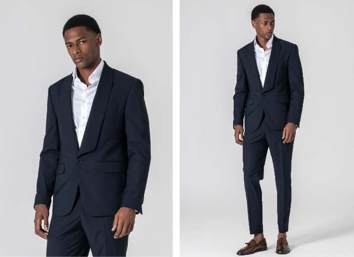 Fato completo de duas peças: blazer e calça, com lapela shawl e botão único. Este modelo distingue-se pelo seu acabamento sofisticado, pensado para cerimónias e eventos onde o detalhe faz a diferença.
