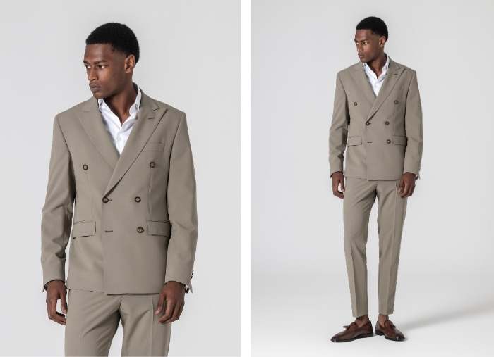 Fato de duas peças (blazer e calça). Uma peça indispensável em qualquer guarda-roupa, seja para uma ocasião especial ou para a rotina de trabalho. Este modelo é de trespasse, com detalhe de costura picotada (pick stitch) no blazer, e possui um design elegante e moderno. É leve e confortável de usar, e composto por materiais que garantem um aspeto estético irrepreensível e liberdade de movimentos. Finalizado com acabamento non-iron, não sendo necessário passar a ferro para que se mantenha elegante.