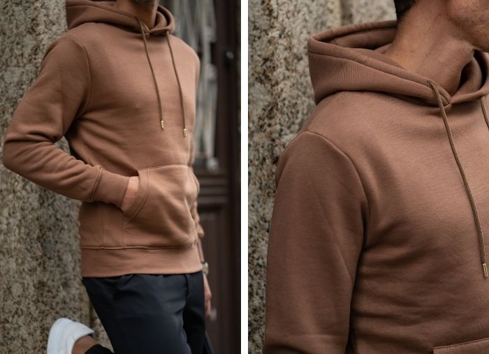 Detalhes: Capuz / Bolso frontal / Ponteiras douradas / Acabamento canelado na gola e punho