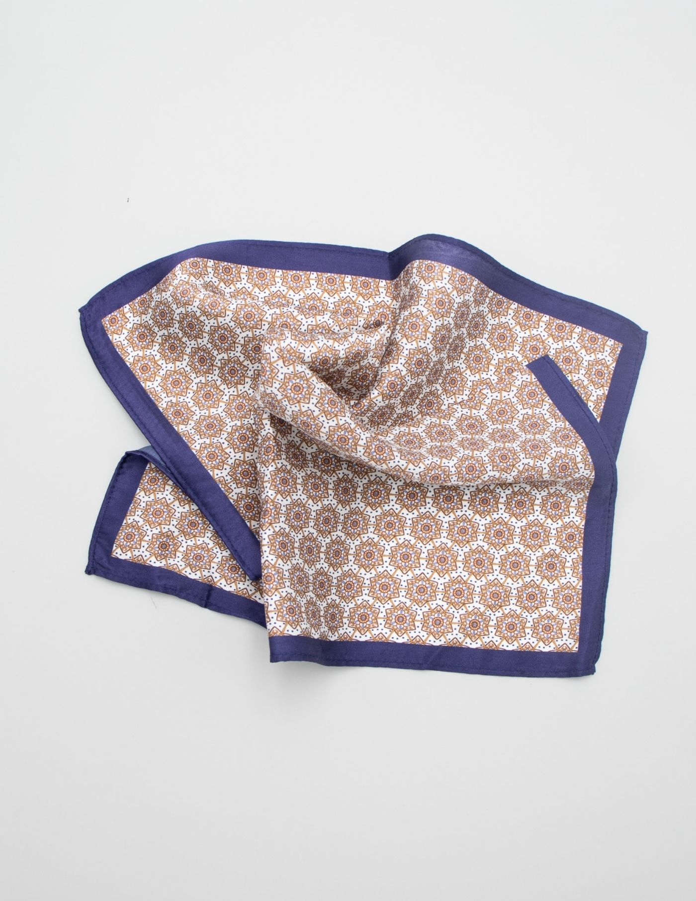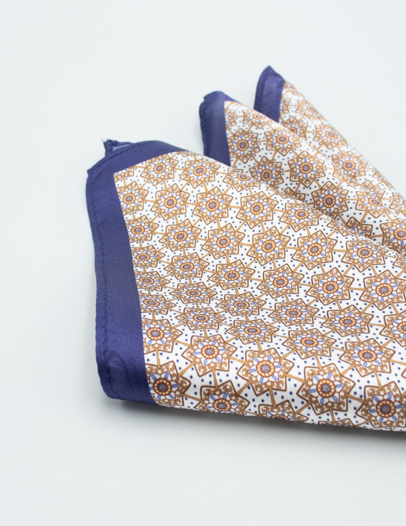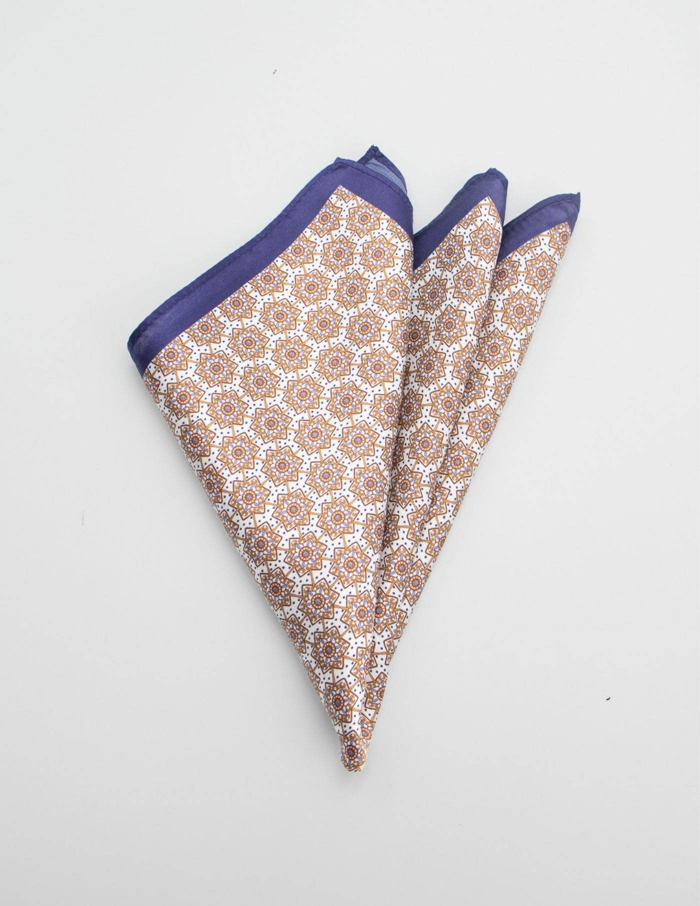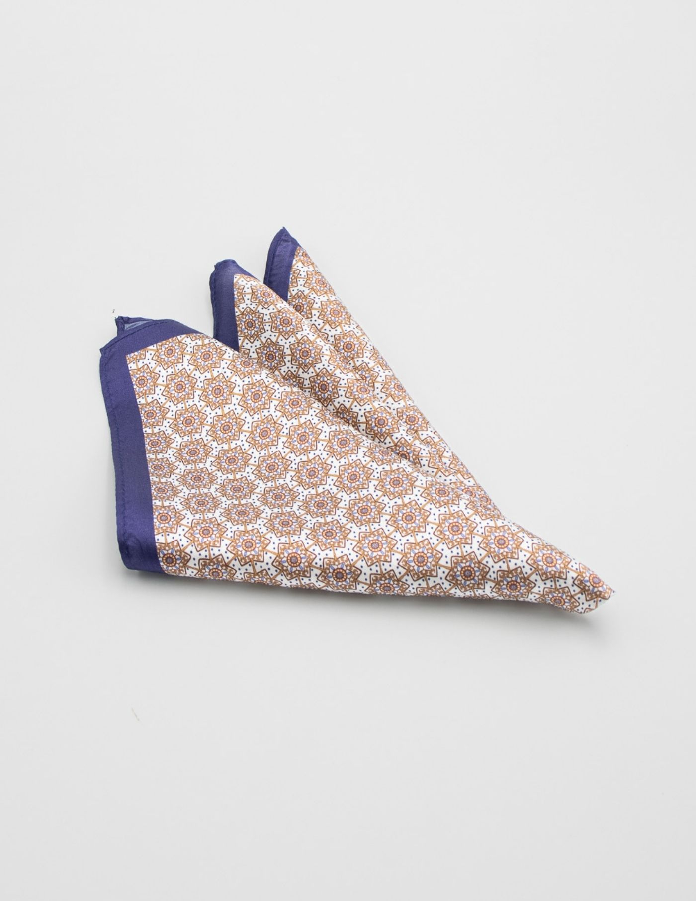 Lenço de bolso 100% seda com padrão castanho e borda azul. Design elegante e tecido suave.