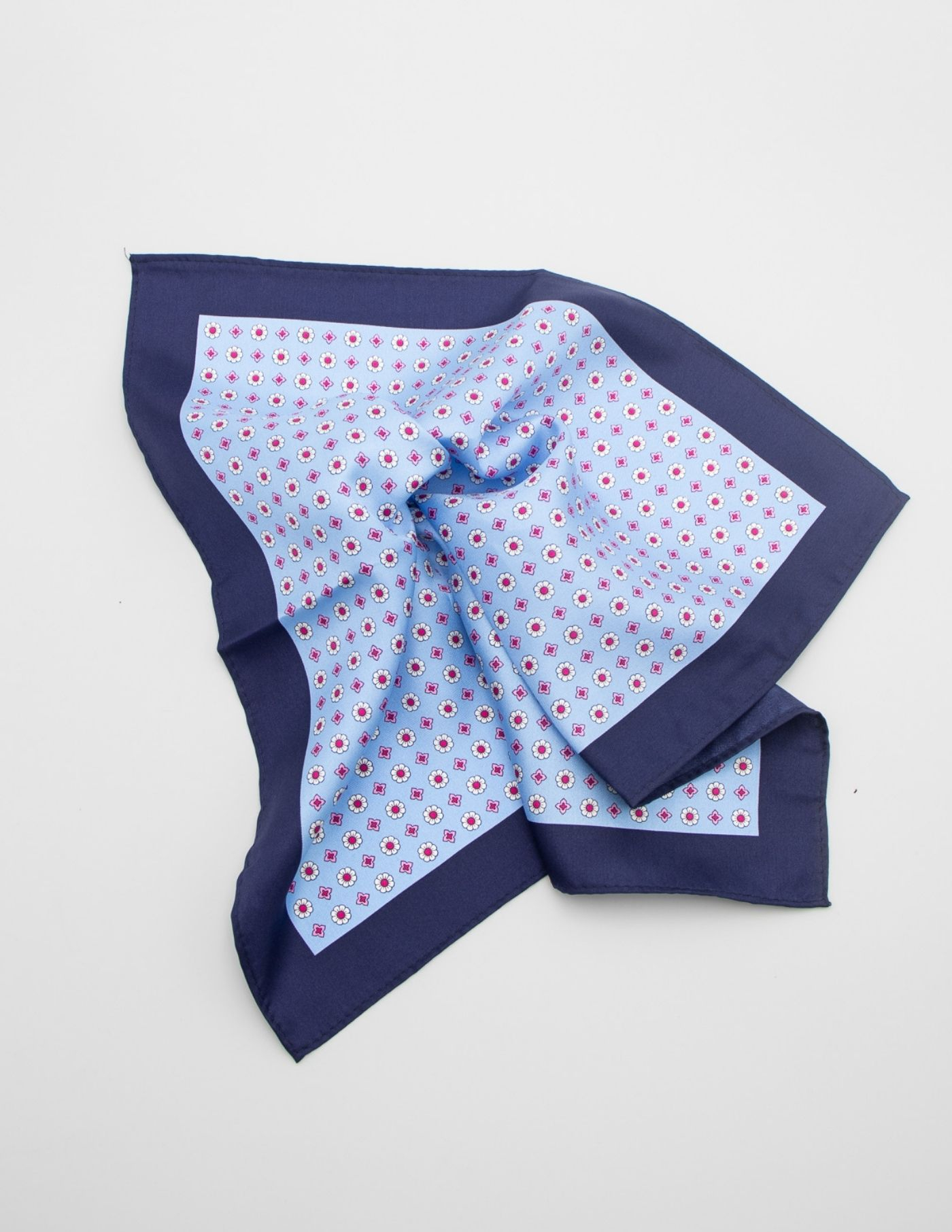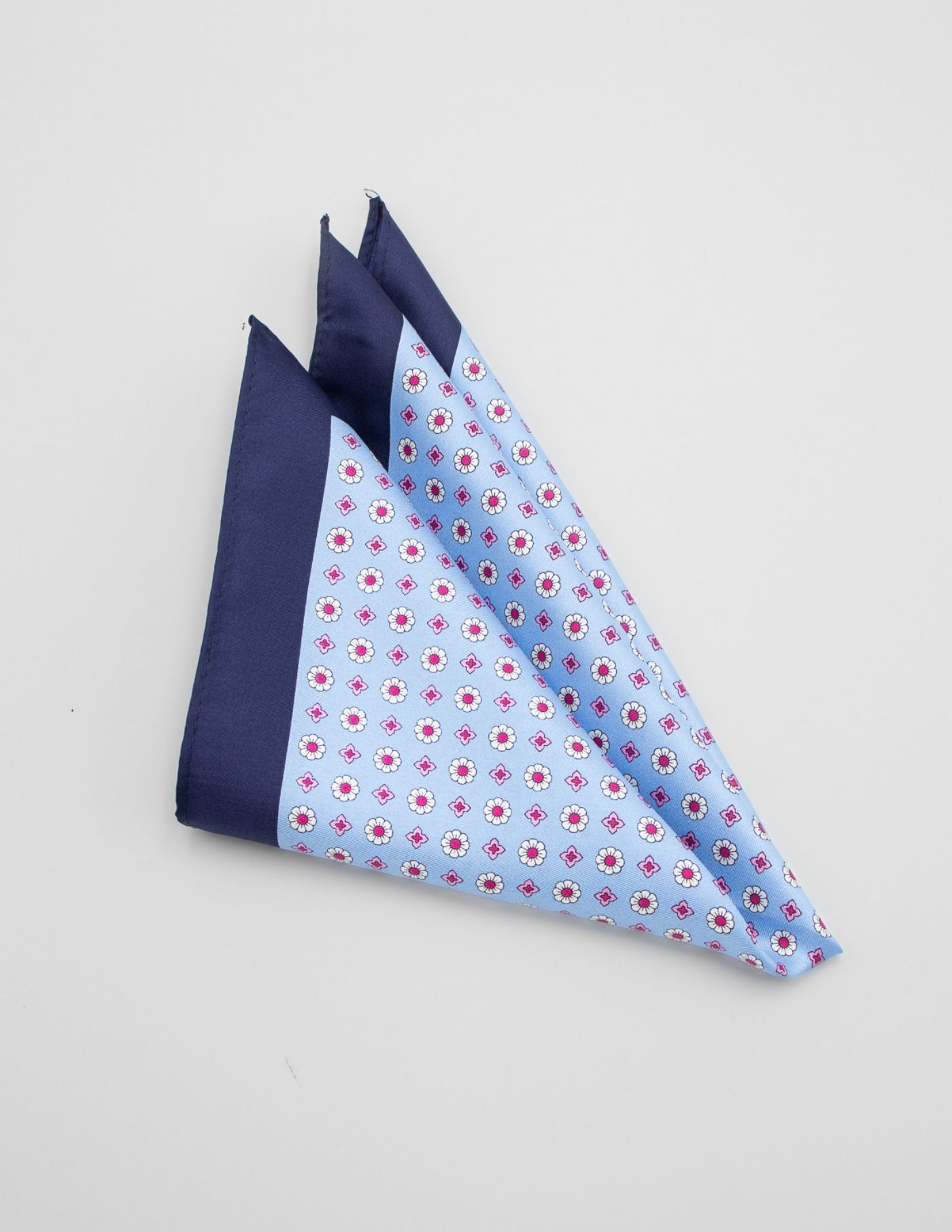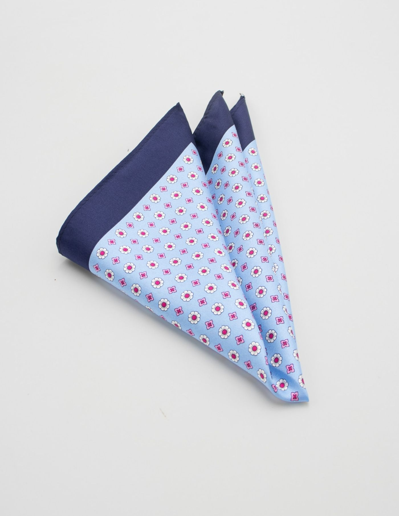 Lenço de bolso 100% seda azul claro com padrão florido cor de rosa. Design elegante e tecido suave.