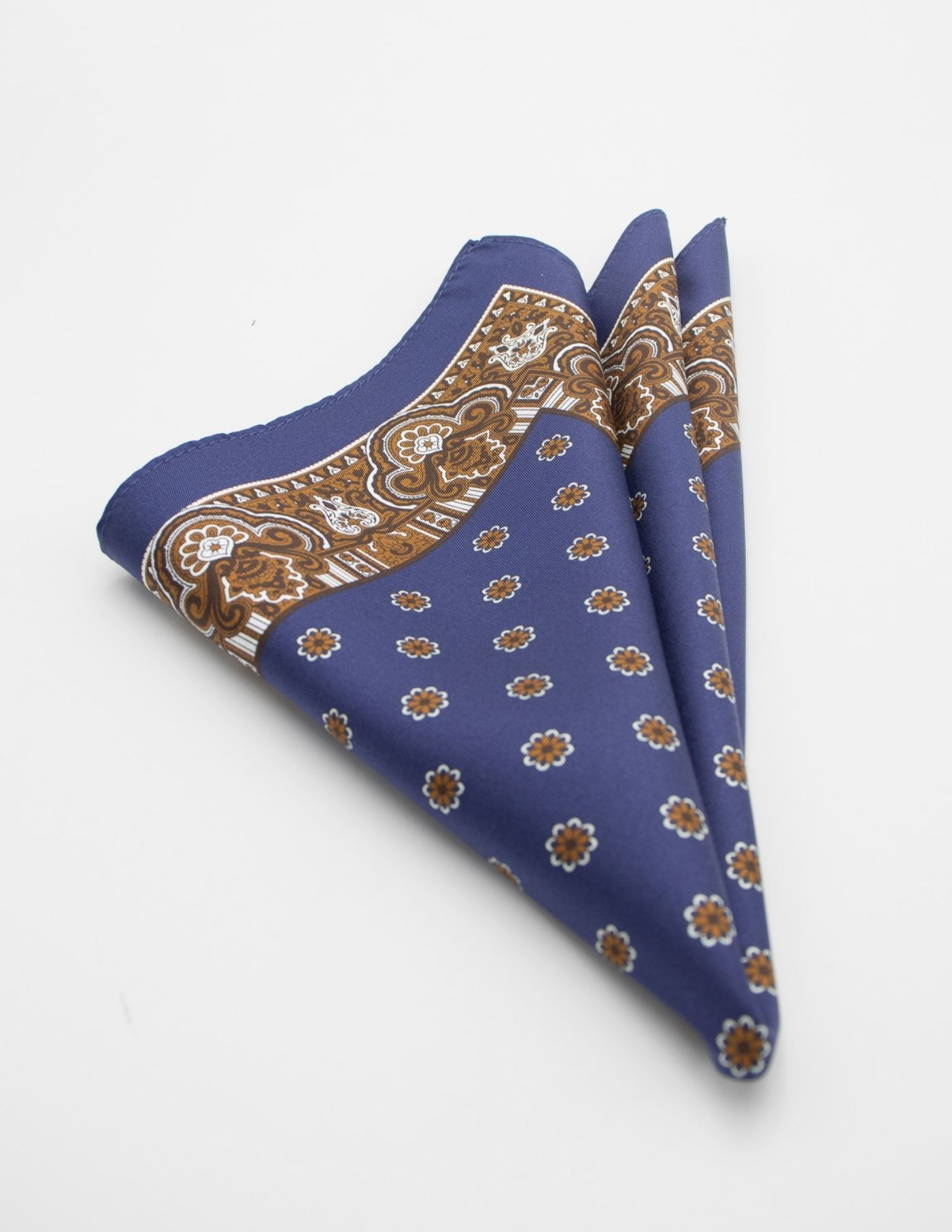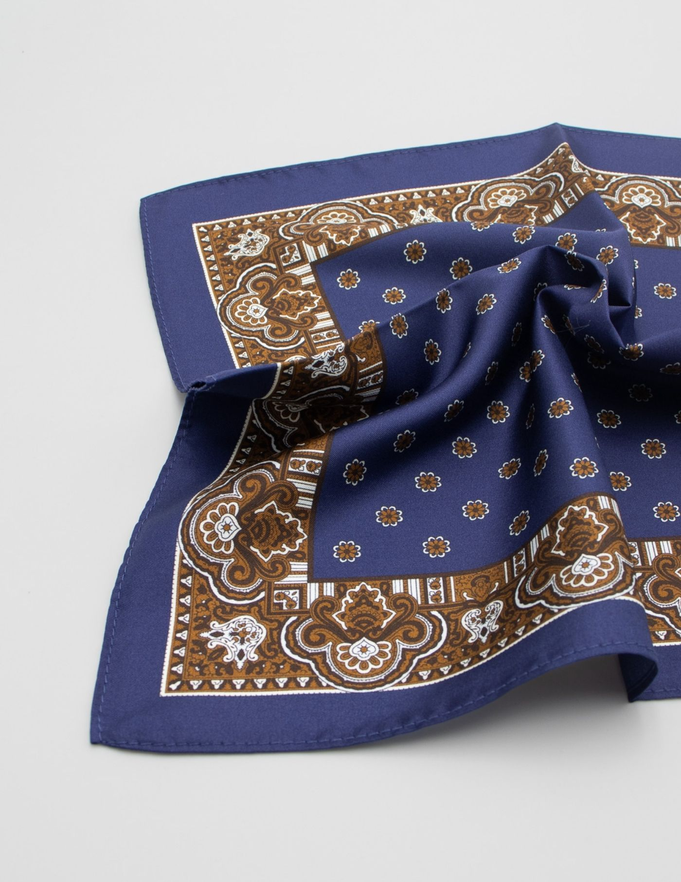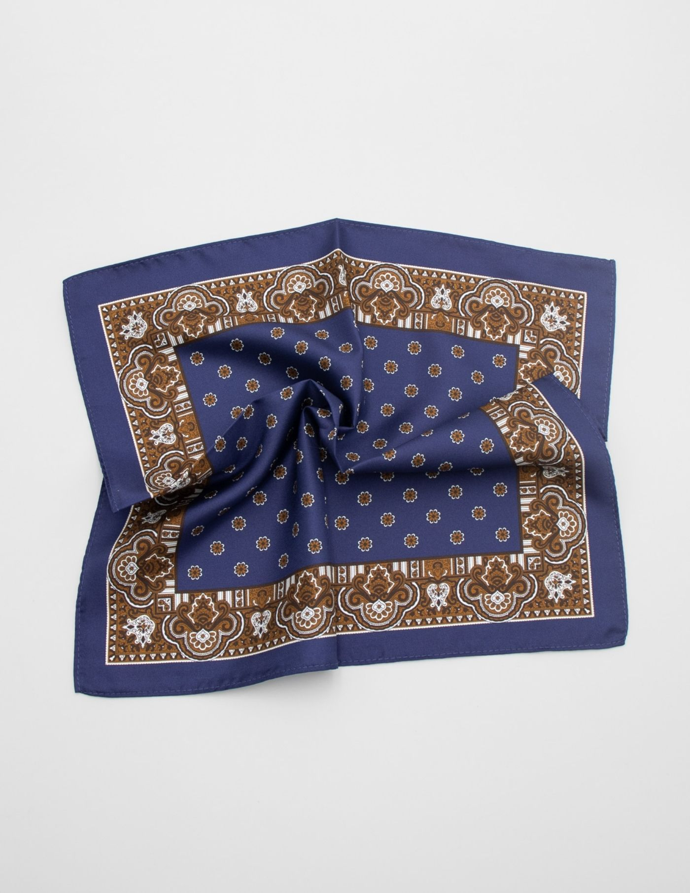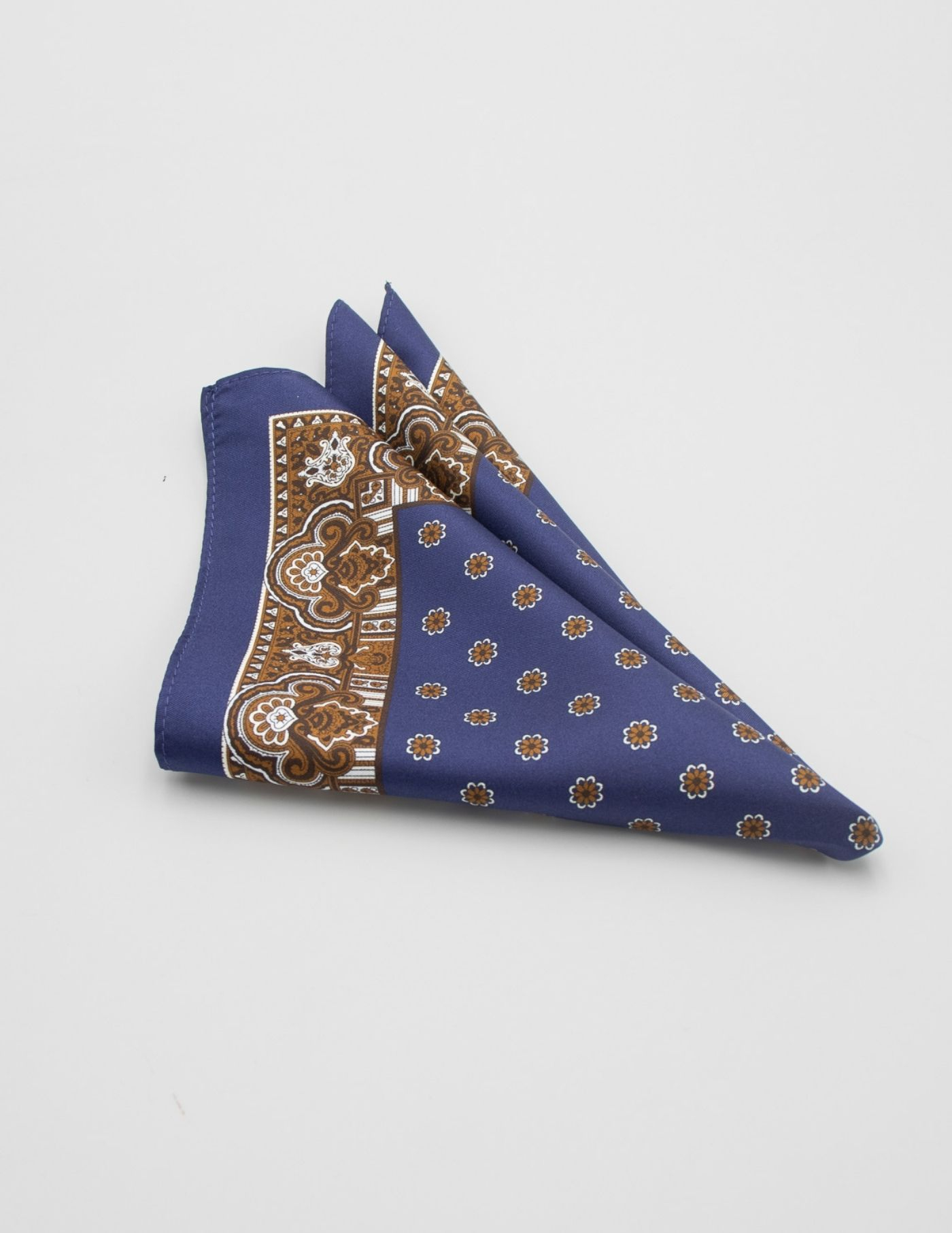 Lenço de bolso 100% seda azul e castanho. Design elegante e tecido suave.