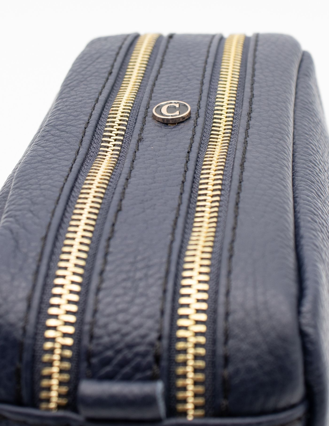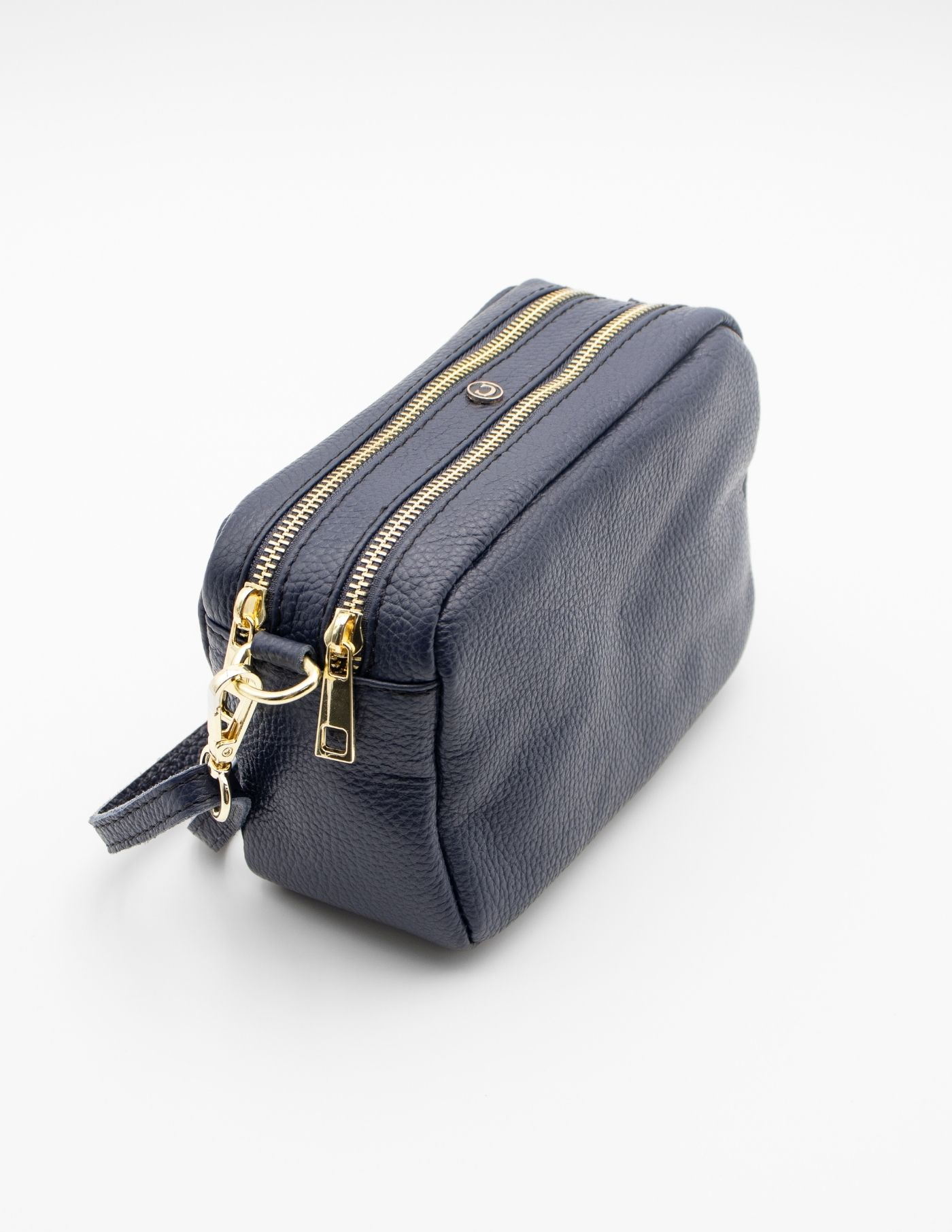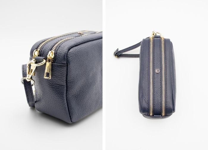 Conta com dois compartimentos principais e um bolso interno com fecho de correr.