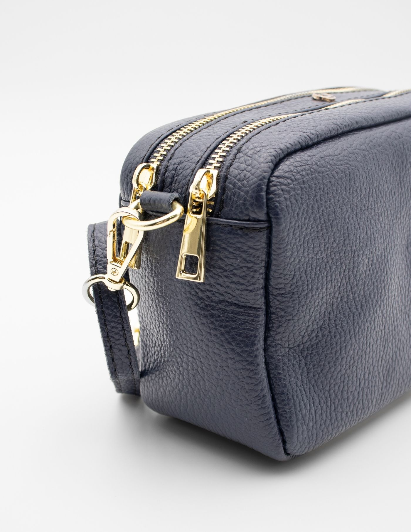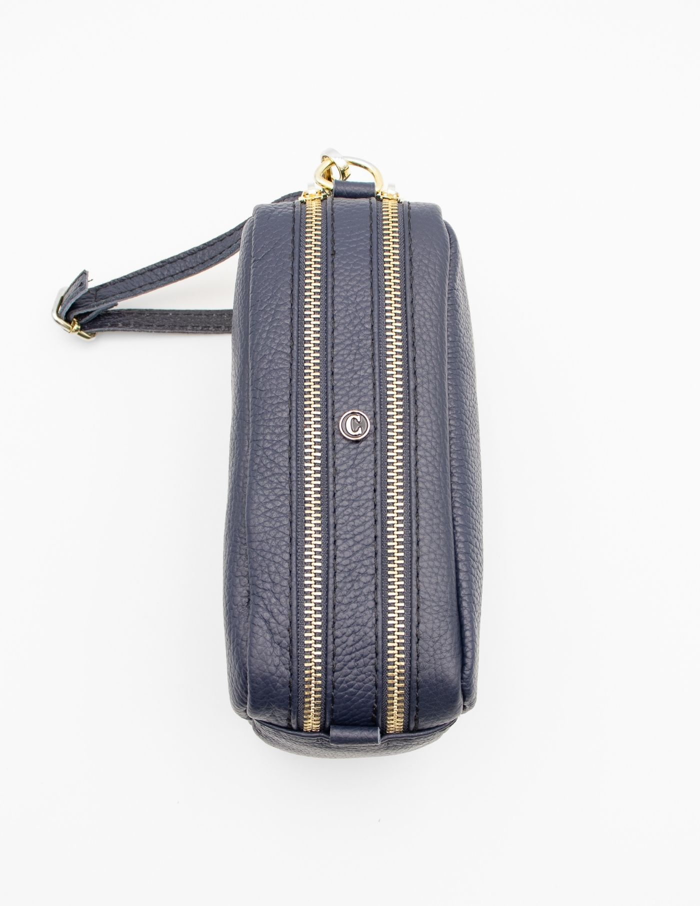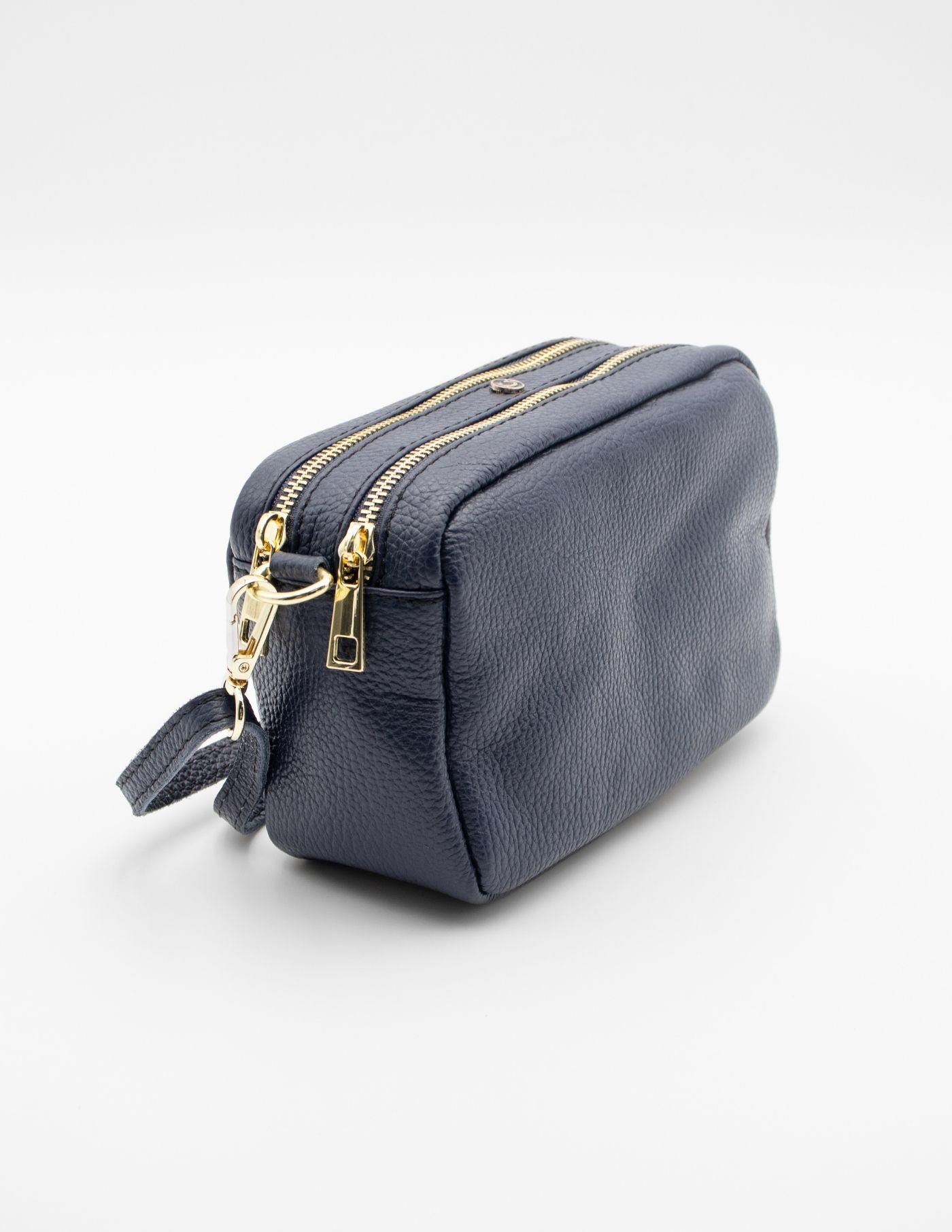 Conta com dois compartimentos principais e um bolso interno com fecho de correr.