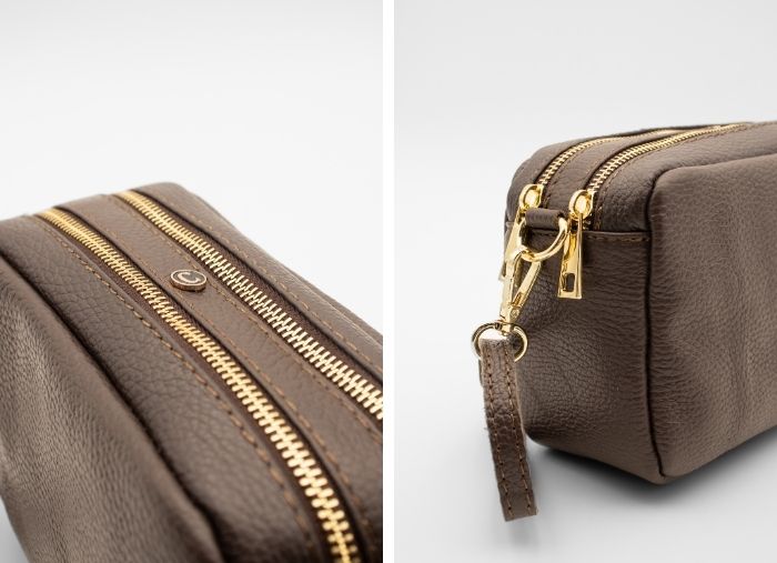 Conta com dois compartimentos principais e um bolso interno com fecho de correr.