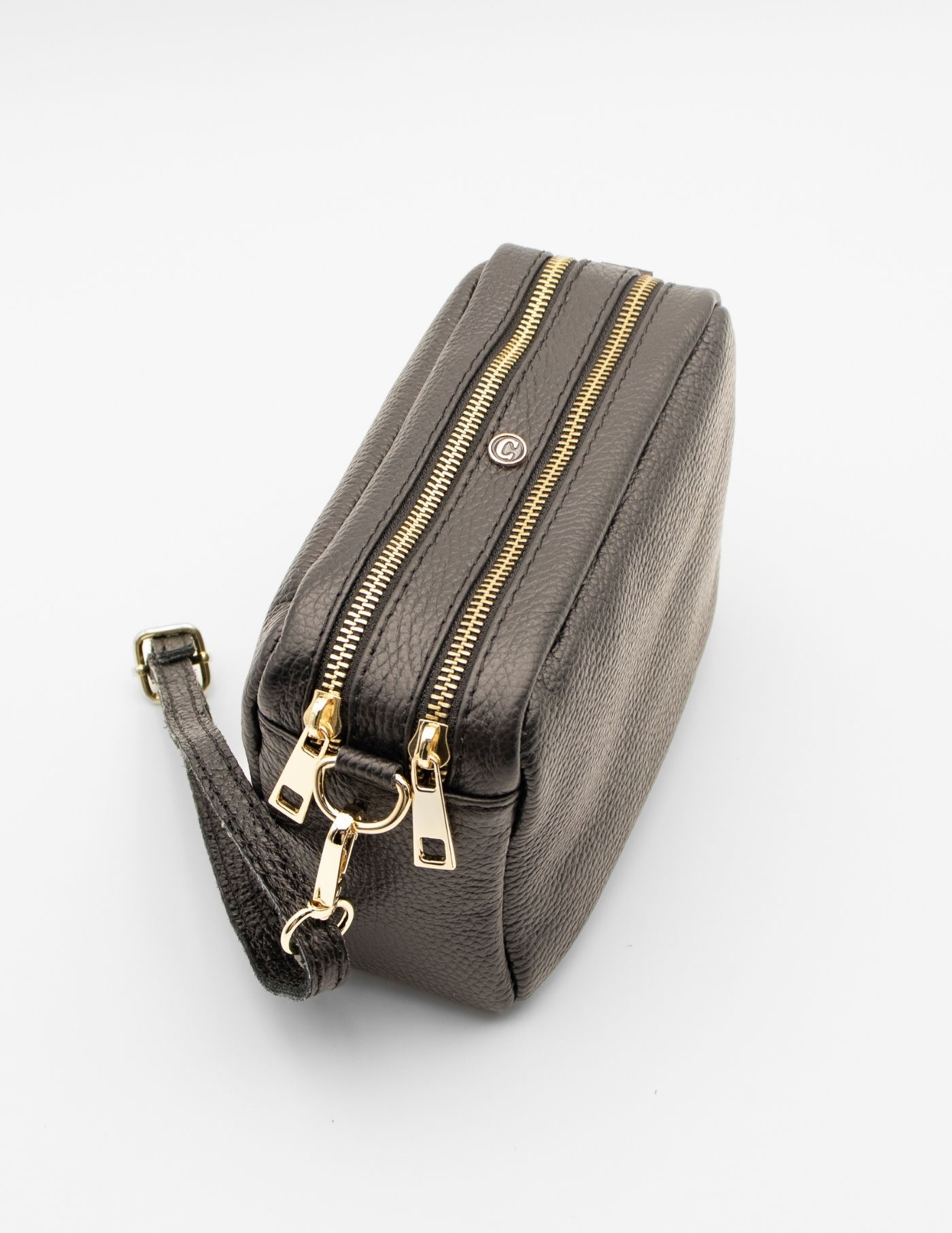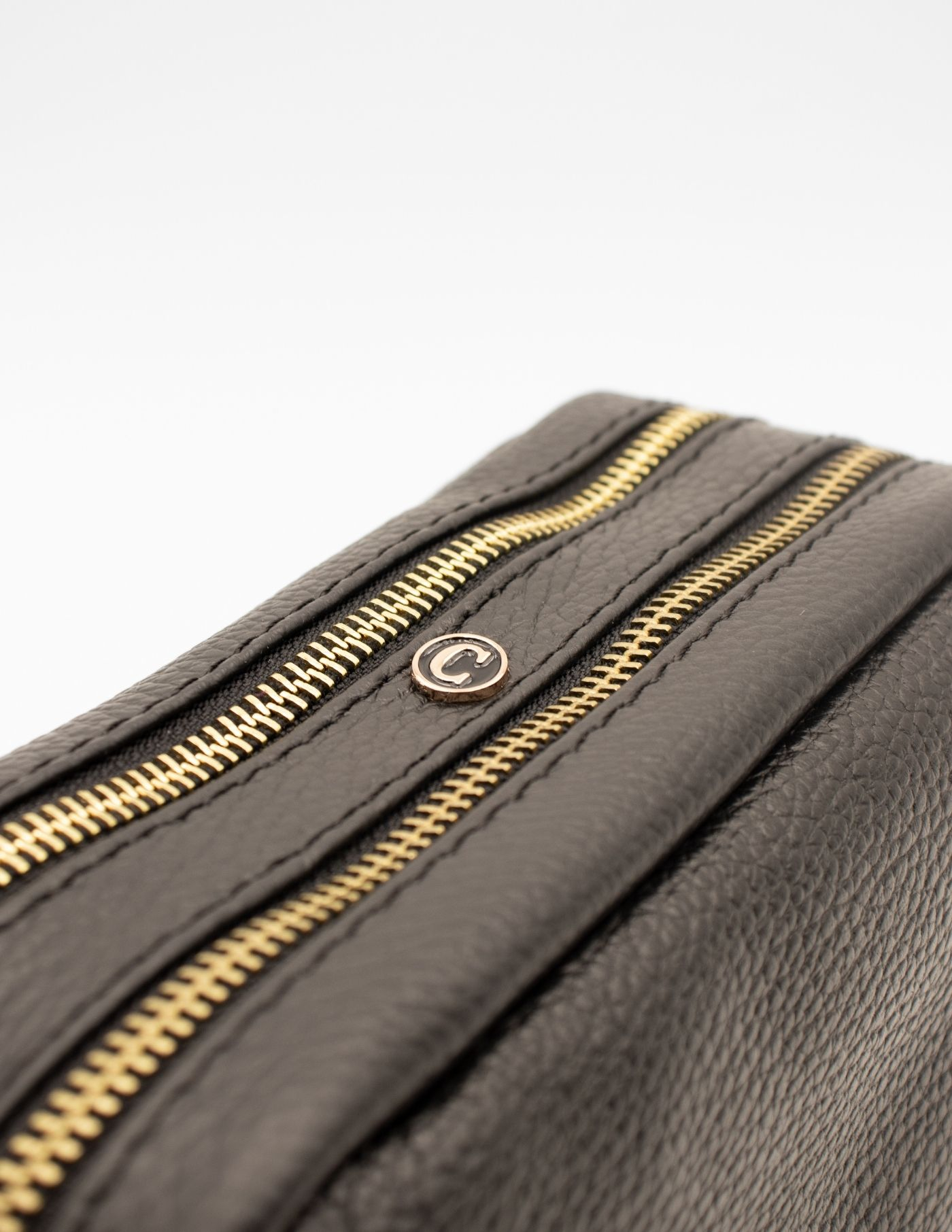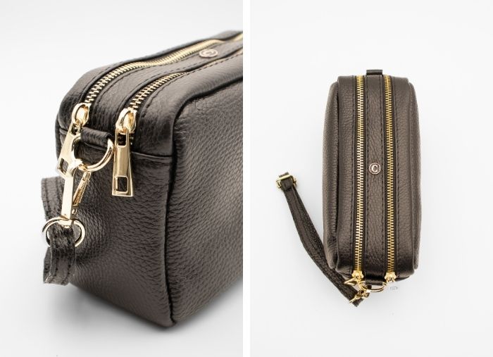 Conta com dois compartimentos principais e um bolso interno com fecho de correr.