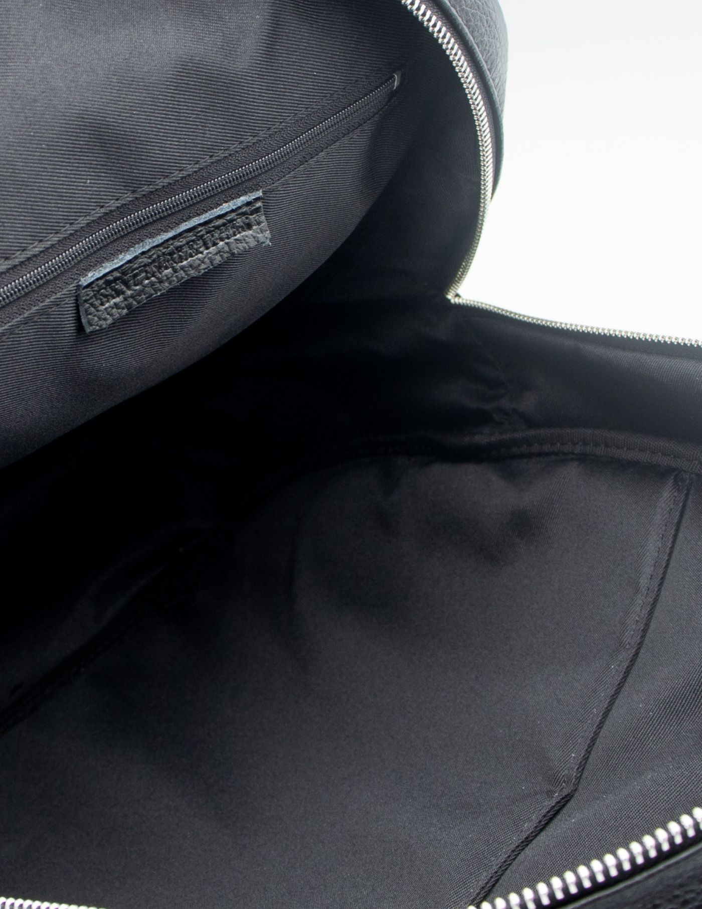 Conta com uma abertura principal, um pequeno compartimento e um bolso frontais. Tem alças reguláveis e uma pega. Na parte interior, conta com um compartimento para arrumação e um bolso com fecho de correr.
